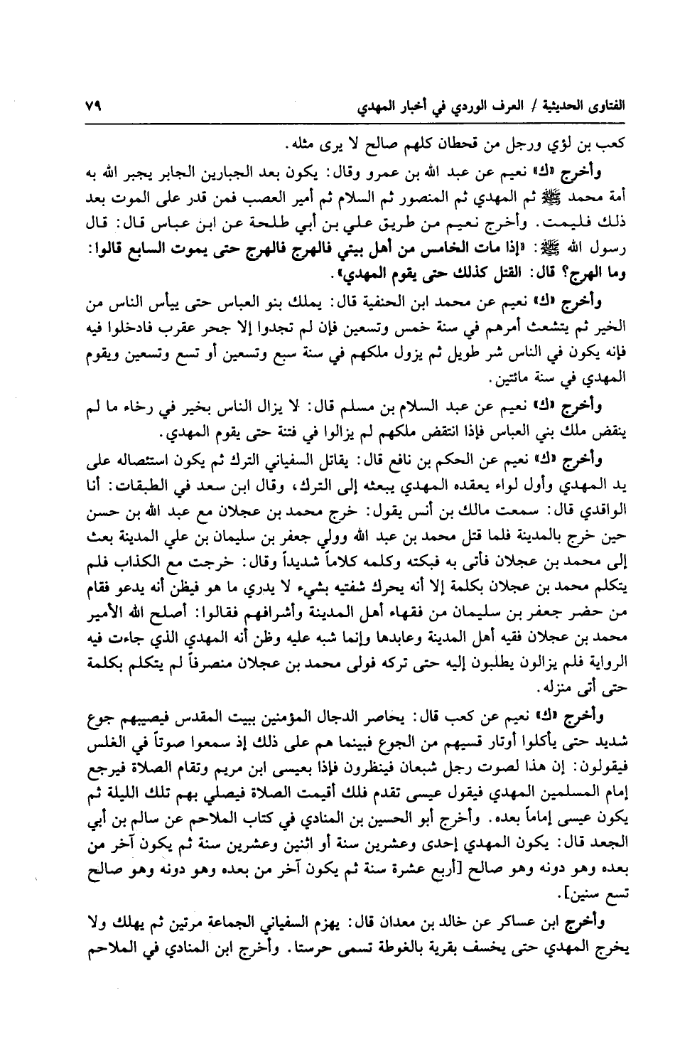 وأخرج (ك) نعيم عن محمد بن الحنفية قال: يملك بنو العباس حتى ييأس الناس من الخير ثم يتشعث أمرهم في سنة خمس وتسعين فإن لم تجدوا إلا جحر عقرب فادخلوا فيه فإنه يكون في الناس شر طويل ثم يزول ملكهم في سنة سبع وتسعين أو تسع وتسعين ويقوم المهدي في سنة مائتين.