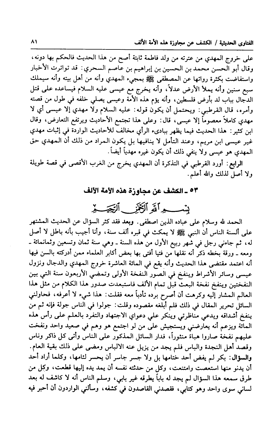 الحمد لله وسلام على عباده الذين اصطفى. وبعد فقد كثر السؤال عن الحديث المشتهر على ألسنة الناس أن النبي صلى الله عليه وسلّم لا يمكث في قبره ألف سنة، وأنا أجيب بأنه باطل لا أصل له، ثم جاءني رجل في شهر ربيع الأول من هذه السنة وهي سنة ثمان وتسعين وثمانمائة ومعه ورقة بخطه ذكر أنه نقلها من فتيا أفتى بها بعض أكابر العلماء ممن أدركته بالسن فيها أنه اعتمد مقتضى هذا الحديث وأنه يقع في المائة العاشرة خروج المهدي والدجال ونزول عيسى وسائر الأشراط وينفخ في الصور النفخة الأولى وتمضي الأربعون سنة التي بين النفختين وينفخ نفخة البعث قبل تمام الألف فاستبعدت صدور هذا الكلام من مثل هذا العالم المشار إليه وكرهت أن أصرح برده تأدباً معه فقلت: هذا شيء لا أعرفه، فحاولني السائل تحرير المقال في ذلك فلم أبلغه مقصوده وقلت: جولوا في الناس جولة فإنه ثم من ينفخ أشداقه ويدعي مناظرتي وينكر علي دعواي الاجتهاد والتفرد بالعلم على رأس هذه المائة ويزعم أنه يعارضني ويستجيش علي من لو اجتمع هو وهم في صعيد واحد ونفخت عليهم نفخة صاروا هباءً منثوراً، فدار السائل المذكور على الناس وأتى كل ذاكر وناس وقصد أهل النجدة والباس فلم يجد من يزيل عنه الالباس ومضى على ذلك بقية العام. والسؤال: بكر لم يفض أحد ختامها بل ولا جسر جاسر أن يحسر لئامها، وكلما أراد أحد أن يدنو منها استعصت وامتنعت، وكل من حدثته نفسه أن يمد يده إليها قطعت، وكل من طرق سمعه هذا السؤال لم يجد له باباً يطرقه غير بابي، وسلم الناس أنه لا كاشف له بعد لساني سوى واحد وهو كتابي، فقصدني القاصدون في كشفه، وسألني الواردون أن أحبر فيه