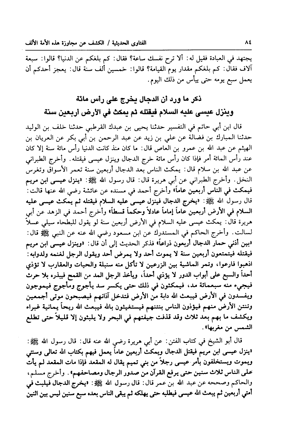 قال ابن أبي حاتم في التفسير حدثنا يحيى بن عبدك القرطبي حدثنا خلف بن الوليد حدثنا المبارك بن فضالة عن علي بن زيد عن عبد الرحمن بن أبي بكر عن العريان بن الهيثم عن عبد الله بن عمرو بن العاص قال: ما كان منذ كانت الدنيا رأس مائة سنة إلا كان عند رأس المائة أمر فإذا كان رأس مائة خرج الدجال وينزل عيسى فيقتله. وأخرج الطبراني عن عبد الله بن سلام قال: يمكث الناس بعد الدجال أربعين سنة تعمر الأسواق وتغرس النخل. وأخرج الطبراني عن أبي هريرة قال: قال رسول الله صلى الله عليه وسلّم: (ينزل عيسى ابن مريم فيمكث في الناس أربعين عاماً) وأخرج أحمد في مسنده عن عائشة رضي الله عنها قالت: قال رسول الله صلى الله عليه وسلّم: (يخرج الدجال فينزل عيسى عليه السلام فيقتله ثم يمكث عيسى عليه السلام في الأرض أربعين عاماً إماماً عادلاً وحكماً قسطاً) وأخرج أحمد في الزهد عن أبي هريرة قال: يمكث عيسى عليه السلام في الأرض أربعين سنة لو يقول للبطحاء سيلي عسلاً لسالت. وأخرج الحاكم في المستدرك عن ابن مسعود رضي الله عنه عن النبي صلى الله عليه وسلّم قال: (بين أذني حمار الدجال أربعون ذراعاً) فذكر الحديث إلى أن قال: (وينزل عيسى ابن مريم فيقتله فيتمتعون أربعين سنة لا يموت أحد ولا يمرض أحد ويقول الرجل لغنمه ولدوابه: اذهبوا فارعوا، وتمر الماشية بين الزرعين لا تأكل منه سنبلة والحيات والعقارب لا تؤذي أحداً والسبع على أبواب الدور لايؤذي أحداً، ويأخذ الرجل المد من القمح فيبذره بلا حرث فيجيء منه سبعمائة مد، فيمكثون في ذلك حتى يكسر سد يأجوج ومأجوج فيموجون ويفسدون في الأرض فيبعث الله دابة من الأرض فتدخل آذانهم فيصبحون موتى أجمعين وتنتن الأرض منهم فيؤذون الناس بنتنهم فيستغيثون بالله فيبعث الله ريحاً يمانية غبراء ويكشف ما بهم بعد ثلاث وقد قذفت جيفتهم في البحر ولا يلبثون إلا قليلاً حتى تطلع الشمس من مغربها).