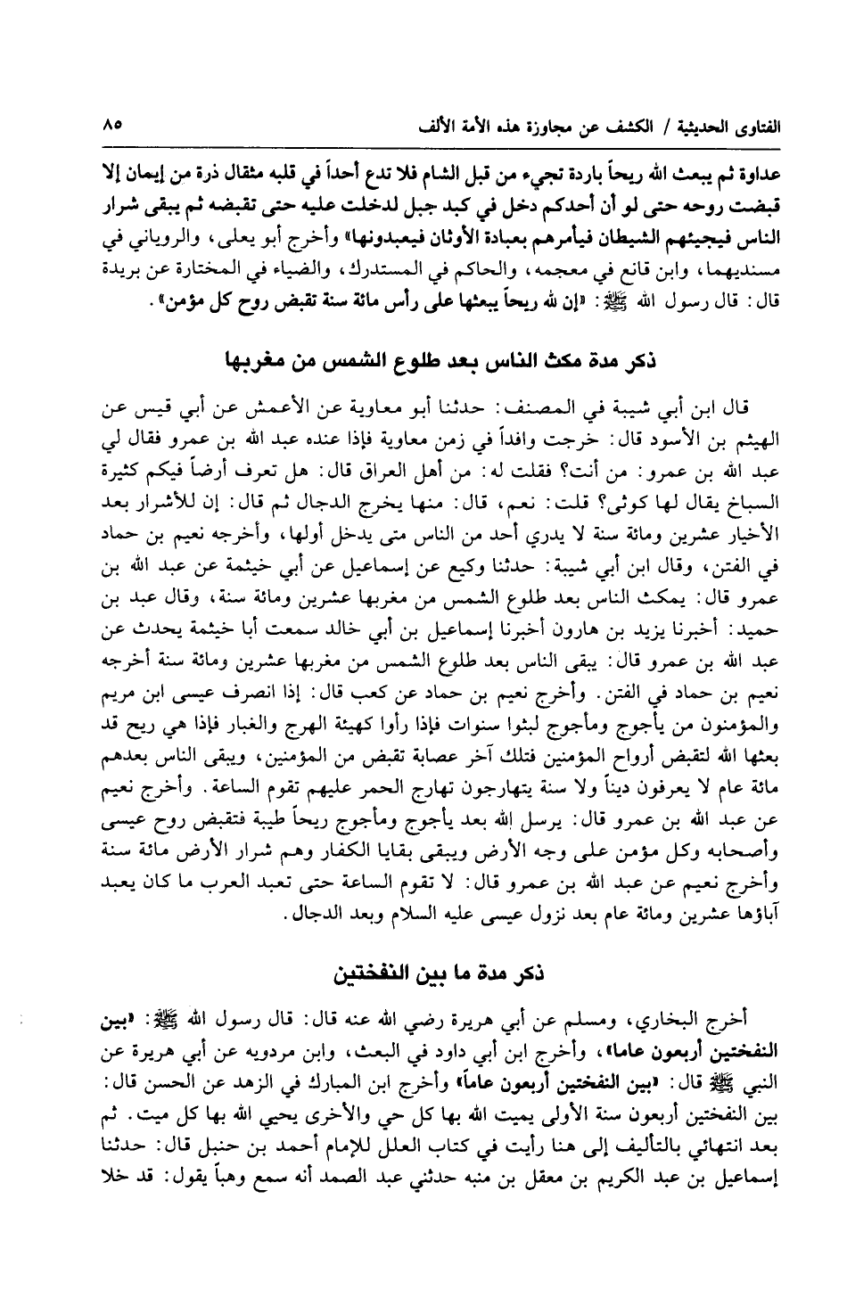 أخرج البخاري، ومسلم عن أبي هريرة رضي الله عنه قال: قال رسول الله صلى الله عليه وسلّم: (بين النفختين أربعون عاما)، وأخرج ابن أبي داود في البعث، وابن مردويه عن أبي هريرة عن النبي صلى الله عليه وسلّم قال: (بين النفختين أربعون عاماً) وأخرج ابن المبارك في الزهد عن الحسن قال: بين النفختين أربعون سنة الأولى يميت الله بها كل حي والأخرى يحيي الله بها كل ميت. ثم بعد انتهائي بالتأليف إلى هنا رأيت في كتاب العلل للإمام أحمد بن حنبل قال: حدثنا إسماعيل بن عبد الكريم بن معقل بن منبه حدثني عبد الصمد أنه سمع وهباً يقول: قد خلا