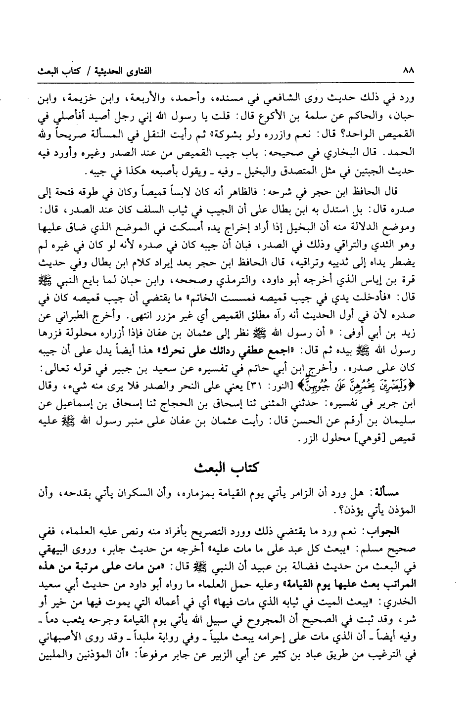 قال الحافظ ابن حجر في شرحه: فالظاهر أنه كان لابساً قميصاً وكان في طوقه فتحة إلى صدره قال: بل استدل به ابن بطال على أن الجيب في ثياب السلف كان عند الصدر، قال: وموضع الدلالة منه أن البخيل إذا أراد إخراج يده أمسكت في الموضع الذي ضاق عليها وهو الثدي والتراقي وذلك في الصدر، فبان أن جيبه كان في صدره لأنه لو كان في غيره لم يضطر يداه إلى ثدييه وتراقيه، قال الحافظ ابن حجر بعد إيراد كلام ابن بطال وفي حديث قرة بن إياس الذي أخرجه أبو داود، والترمذي وصححه، وابن حبان لما بايع النبي صلى الله عليه وسلّم قال: (فأدخلت يدي في جيب قميصه فمسست الخاتم) ما يقتضي أن جيب قميصه كان في صدره لأن في أول الحديث أنه رآه مطلق القميص أي غير مزرر انتهى. وأخرج الطبراني عن زيد بن أبي أوفى: (أن رسول الله صلى الله عليه وسلّم نظر إلى عثمان بن عفان فإذا أزراره محلولة فزرها رسول الله صلى الله عليه وسلّم بيده ثم قال: (اجمع عطفي ردائك على نحرك) هذا أيضاً يدل على أن جيبه كان على صدره. وأخرج ابن أبي حاتم في تفسيره عن سعيد بن جبير في قوله تعالى:) وليضربن بخمرهن على جيوبهن (يعني على النحر والصدر فلا يرى منه شيء، وقال ابن جرير في تفسيره: حدثني المثنى ثنا إسحاق بن الحجاج ثنا إسحاق بن إسماعيل عن سليمان بن أرقم عن الحسن قال: رأيت عثمان بن عفان على منبر رسول الله صلى الله عليه وسلّم عليه قميص [قوهي] محلول الزر.