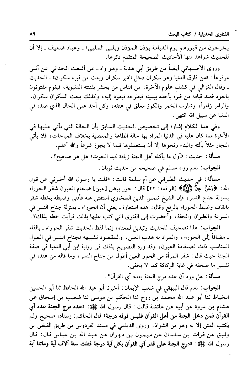 مسألة : في حديث الطبراني عن أم سلمة قالت : ( قلت يا رسول الله أخبرني عن قول الله : ) حور عين ( قال : حور بيض [ عين ] ضخام العيون شفر الحوراء بمنزلة جناح النسر ، فإن الشيخ شمس الدين السخاوي استفتى عنه فأفتى وضبطه بخطه شقر بالقاف وضبط الحوراء بالرفع وقال : هذه استعارة يعني أن الحوراء بمنزلة جناح النسر في السرعة والطيران والخفة ، وأحضرت إلى الفتوى التي كتب عليها بذلك فرأيت خطه بذلك ؟.