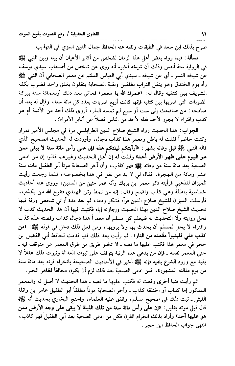 ثم رأيت فتيا أخرى رفعت له فكتب عليها ما نصه هذا الحديث لا أصل له والمعمر المذكور إما كذاب أو اختلقه كذاب وآخر الصحابة موتاً مطلقاً أبو الطفيل عامر بن واثلة الليثي ثبت ذلك في صحيح مسلم ، واتفق عليه العلماء ، واحتج البخاري بحديث أنه صلى الله عليه وسلّم قال قبل موته بقليل : ( إن على رأس مائة سنة من تلك الليلة لا يبقى على وجه الأرض ممن هو عليها أحد ) وأراد بذلك انخرام القرن فكل من ادعى الصحبة بعد أبي الطفيل فهو كاذب ، انتهى جواب الحافظ ابن حجر.