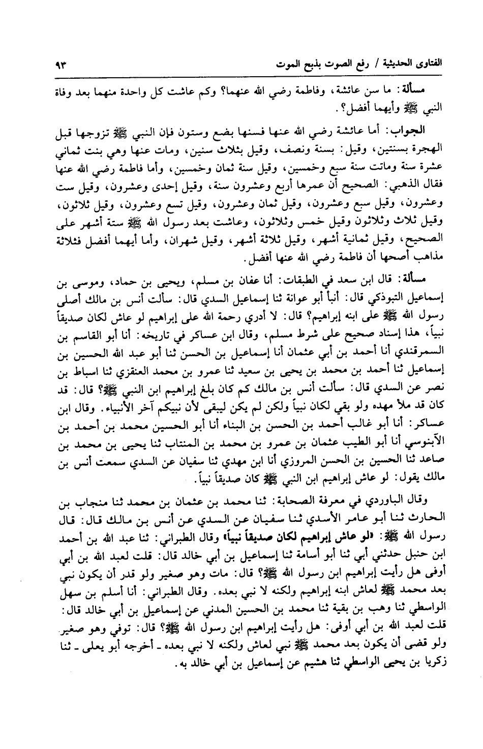 مسألة : قال ابن سعد في الطبقات : أنا عفان بن مسلم ، ويحيى بن حماد ، وموسى ابن إسماعيل التبوذكي قال : أنبأ أبو عوانة ثنا إسماعيل السدي قال : سألت أنس بن مالك أصلى رسول الله صلى الله عليه وسلّم على ابنه إبراهيم ؟ قال : لا أدري رحمة الله على إبراهيم لو عاش لكان صديقاً نبياً ، هذا إسناد صحيح على شرط مسلم ، وقال ابن عساكر في تاريخه : أنا أبو القاسم بن السمرقندي أنا أحمد بن أبي عثمان أنا إسماعيل بن الحسن ثنا أبو عبد الله الحسين بن إسماعيل ثنا أحمد بن محمد بن يحيى بن سعيد ثنا عمرو بن محمد العنقزي ثنا اسباط بن نصر عن السدي قال : سألت أنس بن مالك كم كان بلغ إبراهيم ابن النبي صلى الله عليه وسلّم ؟ قال : قد كان قد ملأ مهده ولو بقي لكان نبياً ولكن لم يكن ليبقى لأن نبيكم آخر الأنبياء. وقال ابن عساكر : أنا أبو غالب أحمد بن الحسن بن البناء أنا أبو الحسين محمد بن أحمد بن الآبنوسي أنا أبو الطيب عثمان بن عمرو بن محمد بن المنتاب ثنا يحيى بن محمد بن صاعد ثنا الحسين بن الحسن المروزي أنا ابن مهدي ثنا سفيان عن السدي سمعت أنس بن مالك يقول : لو عاش إبراهيم ابن النبي صلى الله عليه وسلّم كان صديقاً نبياً.