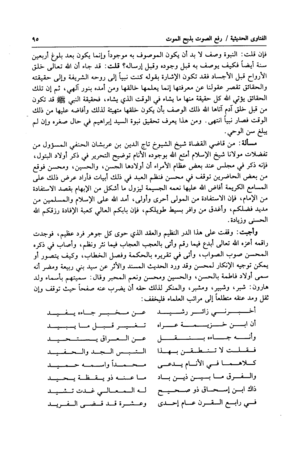 مسألة: من قاضي القضاة شيخ الشيوخ تاج الدين بن عربشان الحنفي المسئول من تفضلات مولانا شيخ الإسلام أمتع الله بوجوده الأنام توضيح التحرير في ذكر أولاد البتول، فإنه ذكر في مجلس عند بعض عظام الأمراء أن أولادها الحسن، والحسين، ومحسن فوقع من بعض الحاضرين توقف في محسن فنظم العبد في ذلك أبيات فأراد عرض ذلك على المسامع الكريمة أفاض الله عليها نعمه الجسيمة ليزول ما أشكل من الإبهام بقصد الاستفادة من الإمام، فإن الاستفادة من المولى أحرى وأولى، أمد الله على الإسلام والمسلمين من مديد فضلكم، وأغدق من وافر بسيط طويلكم، فإن بابكم العالي كعبة الإفادة رزقكم الله الحسنى وزيادة.