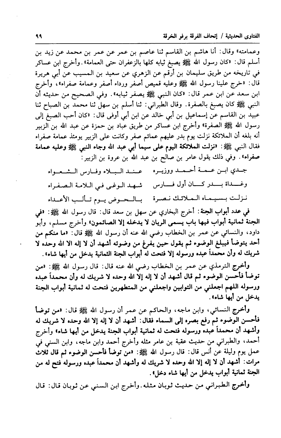 وعمامته) وقال: أنا هاشم بن القاسم ثنا عاصم بن عمر عن عمر بن محمد عن زيد بن أسلم قال: (كان رسول الله صلى الله عليه وسلّم يصبغ ثيابه كلها بالزعفران حتى العمامة). وأخرج ابن عساكر في تاريخه من طريق سليمان بن أرقم عن الزهري عن سعيد بن المسيب عن أبي هريرة قال: (خرج علينا رسول الله صلى الله عليه وسلّم وعليه قميص أصفر ورداء أصفر وعمامة صفراء)، وأخرج ابن سعد عن ابن عمر قال: (كان النبي صلى الله عليه وسلّم يصفر ثيابه). وفي الصحيح من حديثه أن النبي صلى الله عليه وسلّم كان يصبغ بالصفرة. وقال الطبراني: ثنا أسلم بن سهل ثنا محمد ابن الصباح ثنا عبيد بن القاسم عن إسماعيل بن أبي خالد عن ابن أبي أوفى قال: (كان أحب الصبغ إلى رسول الله صلى الله عليه وسلّم الصفرة) وأخرج ابن عساكر من طريق عباد بن حمزة عن عبد الله بن الزبير أنه بلغه أن الملائكة نزلت يوم بدر عليهم عمائم صفر وكانت على الزبير يومئذ عمامة صفراء فقال النبي صلى الله عليه وسلّم: (نزلت الملائكة اليوم على سيما أبي عبد الله وجاء النبي صلى الله عليه وسلّم وعليه عمامة صفراء). وفي ذلك يقول عامر بن صالح بن عبد الله بن عروة ابن الزبير: