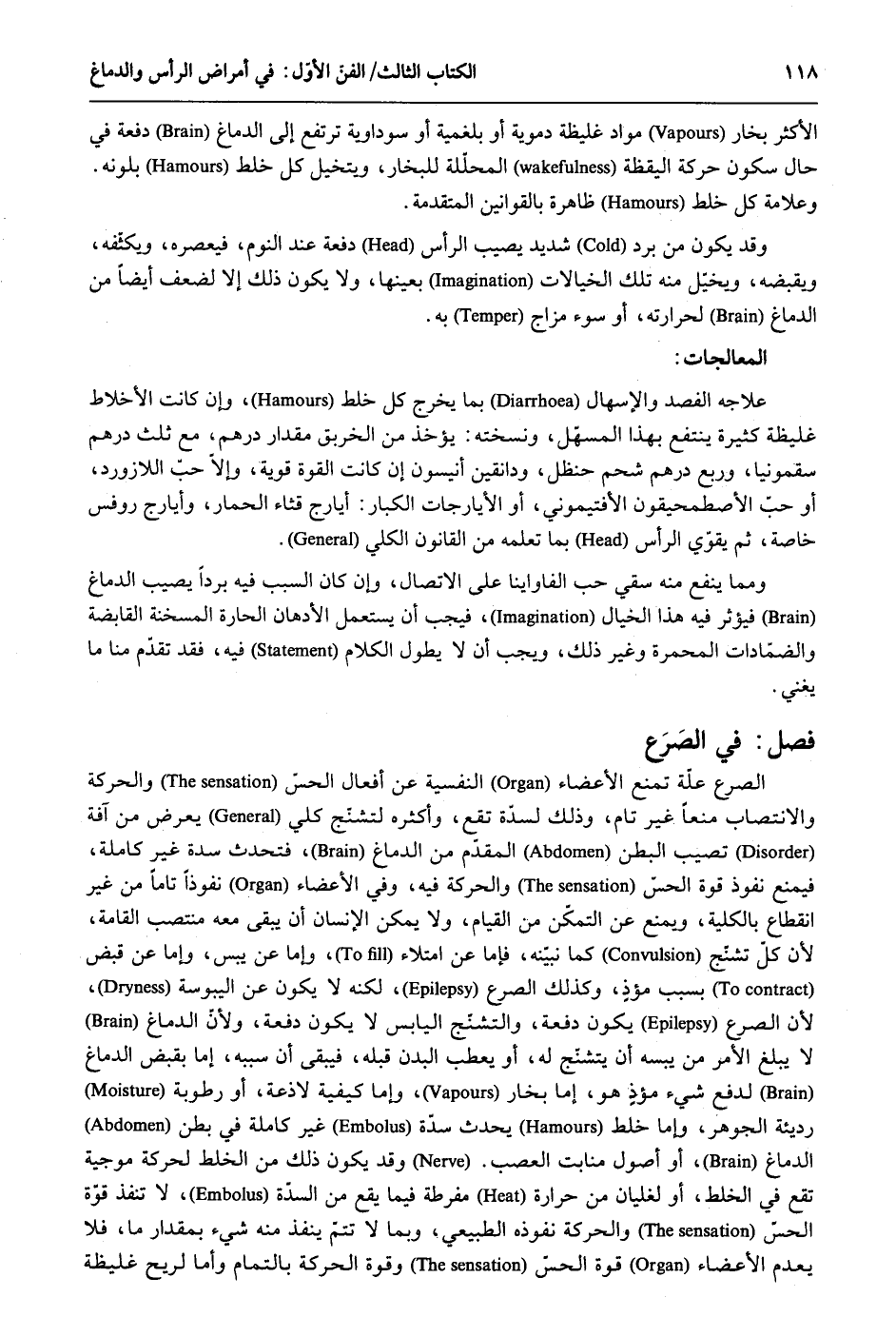 الْأَكْثَر بخار مواد غَلِيظَة دموية أَو بلغمية أَو سوداوية ترْتَفع إِلَى الدِّمَاغ دفْعَة فِي حَال سُكُون حَرَكَة الْيَقَظَة المحلّلة للبخار ويتخيل كل خلط بلونه. وعلامة كل خلط ظَاهِرَة بالقوانين الْمُتَقَدّمَة. وَقد يكون من برد شَدِيد يُصِيب الرَّأْس دفْعَة عِنْد النّوم فيعصره ويكثفه ويقبضه ويختل مِنْهُ تِلْكَ الخيالات بِعَينهَا وَلَا يكون ذَلِك إِلَّا لضعف أَيْضا من الدِّمَاغ لحرارته أَو سوء مزاج بِهِ. المعالجات: علاجه الفصد والإسهال بِمَا يخرج كل خلط وَإِن كَانَت الأخلاط غَلِيظَة كَثِيرَة ينْتَفع بِهَذَا المسهل ونسخته: يُؤْخَذ من الخربق مِقْدَار دِرْهَم مَعَ ثلث دِرْهَم سقمونيا وَربع دِرْهَم شَحم حنظل ودانقين أنيسون إِن كَانَت الْقُوَّة قَوِيَّة وَإِلَّا حب اللازورد أَو حب الأصطمحيقون الأفتيموني أَو الأيارجات الْكِبَار: أيارج قثاء الْحمار وأيارج روفس خَاصَّة ثمَّ يُقَوي الرَّأْس بِمَا تعلمه من القانون الْكُلِّي. وَمِمَّا ينفع مِنْهُ سقِِي حب الفاواينا على الِاتِّصَال وَإِن كَانَ السَّبَب فِيهِ بردا يُصِيب الدِّمَاغ فيؤثر فِيهِ هَذَا الخيال فَيجب أَن يسْتَعْمل الأدهان الحارة المسخنة القابضة والضمادات المحمرة وَغير ذَلِك وَيجب أَن لَا يطول الْكَلَام فِيهِ فقد تقدم منا مَا يُغني. فصل فِي الصَرَع الصرع عِلّة تمنع الْأَعْضَاء النفسية عَن أَفعَال الحسّ وَالْحَرَكَة والانتصاب منعا غير تَامّ وَذَلِكَ لسدة تقع وكثره لتشتج كلي يعرض من آفَة تصيب الْبَطن الْمُقدم من الدِّمَاغ فَتحدث سمة غير كَامِلَة فَيمْنَع نُفُوذ قُوَّة الْحس وَالْحَرَكَة فِيهِ وَفِي الْأَعْضَاء نفوذاً تَاما من غير انْقِطَاع بِالْكُلِّيَّةِ وَيمْنَع عَن التمكّن من الْقيام وَلَا يُمكن الْإِنْسَان أَن يبْقى مَعَه منتصب الْقَامَة لِأَن كلّ تشنّج كَمَا نبينه فإمَّا عَن امتلاء وَإِمَّا عَن يبس وَإِمَّا عَن قبض بِسَبَب مؤذٍ وَكَذَلِكَ الصرع لكنه لَا يكون عَن اليبوسة لِأَن الصرع يكون دفْعَة والتشنج الْيَابِس لَا يكون دفْعَة وَلِأَن الدِّمَاغ لَا يبلغ الْأَمر من يبسه أَن يتشنّج لَهُ أَو يعطب الْبدن قبله فَيبقى أَن سَببه إِمَّا بِقَبض الدِّمَاغ لدفع شَيْء مؤذٍ هُوَ إِمَّا بخار وَإِمَّا كَيْفيَّة لاذعة أَو رُطُوبَة رَدِيئَة الْجَوْهَر وَإِمَّا خلط يحدث سدة غير كَامِلَة فِي بطن الدِّمَاغ أَو أصُول منابت العصب. وَقد يكون ذَلِك من الْخَلْط لحركة موجية تقع فِي الْخَلْط أَو لغليان من حرارة مفرطة فِيمَا يَقع من السدة لَا تنفذ قُوَّة الْحس وَالْحَرَكَة نُفُوذه الطبيعي وَبِمَا لَا تتمّ ينفذ مِنْهُ شَيْء بِمِقْدَار مَا فَلَا يعْدم الْأَعْضَاء قُوَّة الحسّ وَقُوَّة الْحَرَكَة بالتمام وَإِمَّا لريح غَلِيظَة