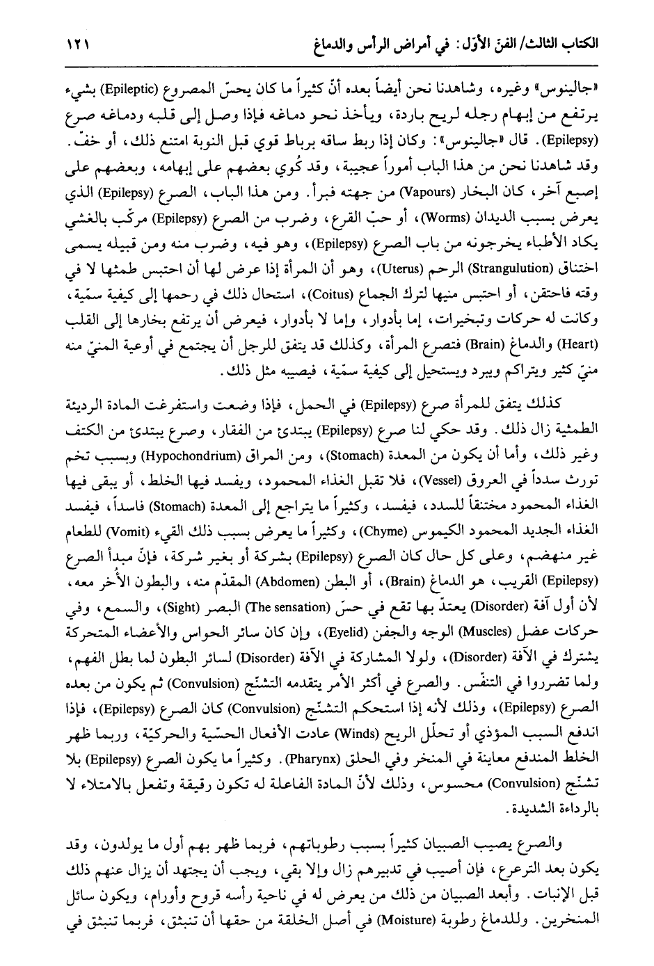 جالينوس وَغَيره وشاهدنا نَحن أَيْضا بعده أنّ كثيرا مَا كَانَ يحس المصروع بِشَيْء يرْتَفع من إِبْهَام رجله لريح بَارِدَة وَيَأْخُذ نَحْو دماغه فَإِذا وصل إِلَى قلبه ودماغه صرع. قَالَ جالينوس: وَكَانَ إِذا ربط سَاقه برباط قوي قبل النّوبَة امْتنع ذَلِك أَو خف. وَقد شاهدنا نَحن من هَذَا الْبَاب أموراً عَجِيبَة وَقد كُوي بَعضهم على إبهامه وَبَعْضهمْ على إِصْبَع آخر كَانَ البخار من جِهَته فبرأ. وَمن هَذَا الْبَاب الصرع الَّذِي يعرض بِسَبَب الديدان أَو حب القرع وَضرب من الصرع مركّب بالغشي يكَاد الْأَطِبَّاء يخرجونه من بَاب الصرع وَهُوَ فِيهِ وَضرب مِنْهُ وَمن قبيله يُسمى اختناق الرَّحِم وَهُوَ أَن الْمَرْأَة إِذا عرض لَهَا أَن احْتبسَ طمثها لَا فِي وقته فاحتقن أَو احْتبسَ منيها لترك الْجِمَاع اسْتَحَالَ ذَلِك فِي رَحمهَا إِلَى كَيْفيَّة سمّية وَكَانَ لَهُ حركات وتبخيرات إِمَّا بأدوار وَإِمَّا لَا بأدوار فَيعرض أَن يرْتَفع بخارها إِلَى الْقلب والدماغ فتصرع الْمَرْأَة وَكَذَلِكَ قد يتَّفق للرجل أَن يجْتَمع فِي أوعية المنيّ مِنْهُ كثير ويتراكم ويبرد ويستحيل إِلَى كَيْفيَّة سميَّة فَيُصِيبهُ مثل ذَلِك. كَذَلِك يتَّفق للْمَرْأَة صرع فِي الْحمل فَإِذا وضعت واستفرغت الْمَادَّة الرَّديئَة الطمثية زَالَ ذَلِك. وَقد حكى لنا صرع يَبْتَدِئ من الفقار وصرع يَبْتَدِئ من الْكَتف وَغير ذَلِك وَأما أَن يكون من الْمعدة وَمن المراق وبسبب تخم تورث سدداً فِي الْعُرُوق فَلَا تقبل الْغذَاء الْمَحْمُود وَيفْسد فِيهَا الْخَلْط أَو يبْقى فِيهَا الْغذَاء الْمَحْمُود مختنقاً للسدد فَيفْسد وَكَثِيرًا مَا يتراجع إِلَى الْمعدة فَاسِدا فَيفْسد الْغذَاء الْجَدِيد الْمَحْمُود الكيموس وَكَثِيرًا مَا يعرض بِسَبَب ذَلِك الْقَيْء للطعام غير منهضم وعَلى كل حَال كَانَ الصرع بشركة أَو بِغَيْر شركَة فإنّ مبدأ الصرع الْقَرِيب هُوَ الدِّمَاغ أَو الْبَطن المقدّم مِنْهُ والبطون الأُخر مَعَه لِأَن أول آفَة يعْتد بهَا تقع فِي حسّ الْبَصَر والسمع وَفِي حركات عضل الْوَجْه والجفن وَإِن كَانَ سَائِر الْحَواس والأعضاء المتحركة تشترك فِي الآفة وَلَوْلَا الْمُشَاركَة فِي الآفة لسَائِر الْبُطُون لما بَطل الْفَهم وَلما تضرروا فِي التنفس. والصرع فِي أَكثر الْأَمر يتقدمه التشنج ثمَّ يكون من بعده الصرع وَذَلِكَ لِأَنَّهُ إِذا استحكم التشنّج كَانَ الصرع فَإِذا انْدفع السَّبَب المؤذي أَو تحلل الرّيح عَادَتْ الْأَفْعَال الحسّية والحركيّة وَرُبمَا ظهر الْخَلْط المندفع مُعَاينَة فِي المنخر وَفِي الْحلق. وَكَثِيرًا مَا يكون الصرع بِلَا تشنّج محسوس وَذَلِكَ لأنّ الْمَادَّة الفاعلة لَهُ تكون والصرع يُصِيب الصّبيان كثيرا بِسَبَب رطوباتهم فَرُبمَا ظهر بهم أول مَا يولدون وَقد يكون بعد الترعرع فَإِن أُصِيب فِي تدبيرهم زَالَ وَإِلَّا بَقِي وَيجب أَن يجْتَهد أَن يزَال عَنْهُم ذَلِك قبل الإنبات. وَأبْعد الصّبيان من ذَلِك من يعرض لَهُ فِي نَاحيَة رَأسه قُرُوح وأورام وَيكون سَائل المنخرين. وللدماغ رُطُوبَة فِي أصل الْخلقَة من حَقّهَا أَن تنبثق فَرُبمَا تنبثق فِي