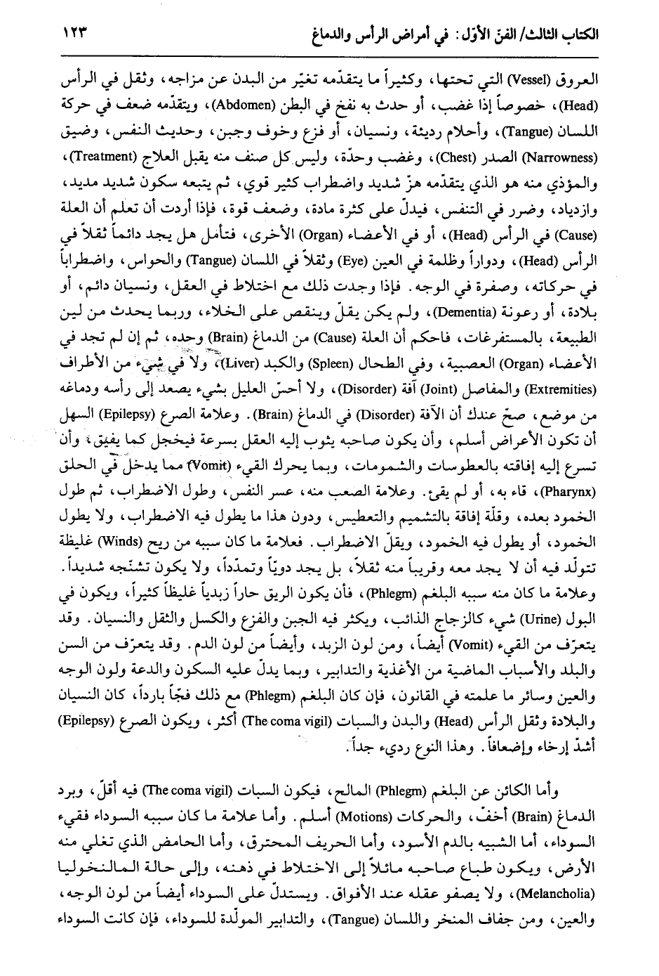 الْعُرُوق الَّتِي تحتهَا وَكَثِيرًا مَا يتقدمه تغيّر من الْبدن عَن مزاجه وَثقل فِي الرَّأْس خُصُوصا إِذا غضب أَو حدث بِهِ نفخ فِي الْبَطن ويتقدّمه ضعف فِي حَرَكَة اللِّسَان وأحلام رَدِيئَة ونسيان أَو فزع وَخَوف وَجبن وَحَدِيث النَّفس وضيق الصَّدْر وَغَضب وحدة وَلَيْسَ كل صنف مِنْهُ يقبل العلاج والمؤذي مِنْهُ هُوَ الَّذِي يتقدّمه هزّ شَدِيد واضطراب كثير قوي ثمَّ يتبع سُكُون شَدِيد مديد وازدياد وضرر فِي التنفس فيدلّ على كَثْرَة مَادَّة وَضعف قُوَّة فَإِذا أردْت أَن تعلم أَن الْعلَّة فِي الرَّأْس أَو فِي الْأَعْضَاء الْأُخْرَى فَتَأمل هَل يجد دَائِما ثقلاً فِي الرَّأْس ودواراً وظلمة فِي الْعين وثقلاً فِي اللِّسَان والحواس واضطراباً فِي حركاته وصفرة فِي الْوَجْه. فَإِذا وجدت ذَلِك مَعَ اخْتِلَاط فِي الْعقل ونسيان دَائِم أَو بلادة أَو رعونة وَلم يكن يقل وَينْقص على الْخَلَاء وَرُبمَا يحدث من لين الطبيعة بالمستفرغات فاحكم أَن الْعلَّة من الدِّمَاغ وَحده ثمَّ إِن لم تَجِد فِي الْأَعْضَاء العصبية وَفِي الطحال والكبد وَلَا فِي شَيْء من الْأَطْرَاف والمفاصل آفَة وَلَا أحس العليل بِشَيْء يصعد إِلَى رَأسه ودماغه من مَوضِع صَحَّ عنْدك أَن الآفة فِي الدِّمَاغ. وعلامة الصرع السهل أَن تكون الْأَعْرَاض أسلم وَأَن يكون صَاحبه يثوب إِلَيْهِ الْعقل بِسُرْعَة فيخجل كَمَا يفِيق وَأَن تسرع إِلَيْهِ إِفَاقَته بالعطوسات والشمومات وَبِمَا يُحَرك الْقَيْء مِمَّا يدْخل فِي الْحلق قاء بِهِ أَو لم يقئ. وعلامة الصعب مِنْهُ عسر النَّفس وَطول الِاضْطِرَاب ثمَّ طول الخمود بعده وقلّة إفاقة بالتشميم والتعطيس وَدون هَذَا مَا يطول فِيهِ الِاضْطِرَاب وَلَا يطول الخمود أَو يطول فِيهِ الخمود ويقل الِاضْطِرَاب. فعلامة مَا كَانَ سَببه من ريح غَلِيظَة تتولّد فِيهِ أَن لَا يجد مَعَه وقريباً مِنْهُ ثقلاً بل يجد دويّاً وتمدداً وَلَا يكون تشنّجه شَدِيدا. وعلامة مَا كَانَ مِنْهُ سَببه البلغم فَأن يكون الرِّيق حاراً زبدياً غليظاً كثيرا وَيكون فِي الْبَوْل شَيْء كالزجاج الذائب وَيكثر فِيهِ الْجُبْن والفزع والكسل والثقل وَالنِّسْيَان. وَقد يتعرف من الْقَيْء أَيْضا وَمن لون الزّبد وَأَيْضًا من لون الدَّم. وَقد يتعرف من السن والبلد والأسباب الْمَاضِيَة من الأغذية والتدابير وَبِمَا يدل عَلَيْهِ السّكُون والدعة ولون الْوَجْه وَالْعين وَسَائِر مَا عَلمته فِي القانون فَإِن كَانَ البلغم مَعَ ذَلِك فخاً بَارِدًا كَانَ النسْيَان والبلادة وَثقل الرَّأْس وَالْبدن والسبات أَكثر وَيكون الصرع أَشد إرخاء وإضعافاً. وَهَذَا النَّوْع رَدِيء جدا. وَأما الْكَائِن عَن البلغم المالح فَيكون السبات فِيهِ أقل وَبرد الدِّمَاغ أخف والحركات أسلم. وَأما عَلامَة مَا كَانَ سَببه السَّوْدَاء فقيء السَّوْدَاء أما الشبيه بِالدَّمِ الْأسود وَأما الجريف المحترق وَأما الحامض الَّذِي تغلي مِنْهُ الأَرْض وَيكون طباع صَاحبه مائلاً إِلَى الِاخْتِلَاط فِي ذهنه وَإِلَى حَالَة المالنخوليا وَلَا يصفو عقله عِنْد الأفواق. ويستدلّ على السَّوْدَاء أَيْضا من لون الْوَجْه وَالْعين وَمن جفاف المنخر وَاللِّسَان والتدابير المولّدة للسوداء فَإِن كَانَ السَّوْدَاء