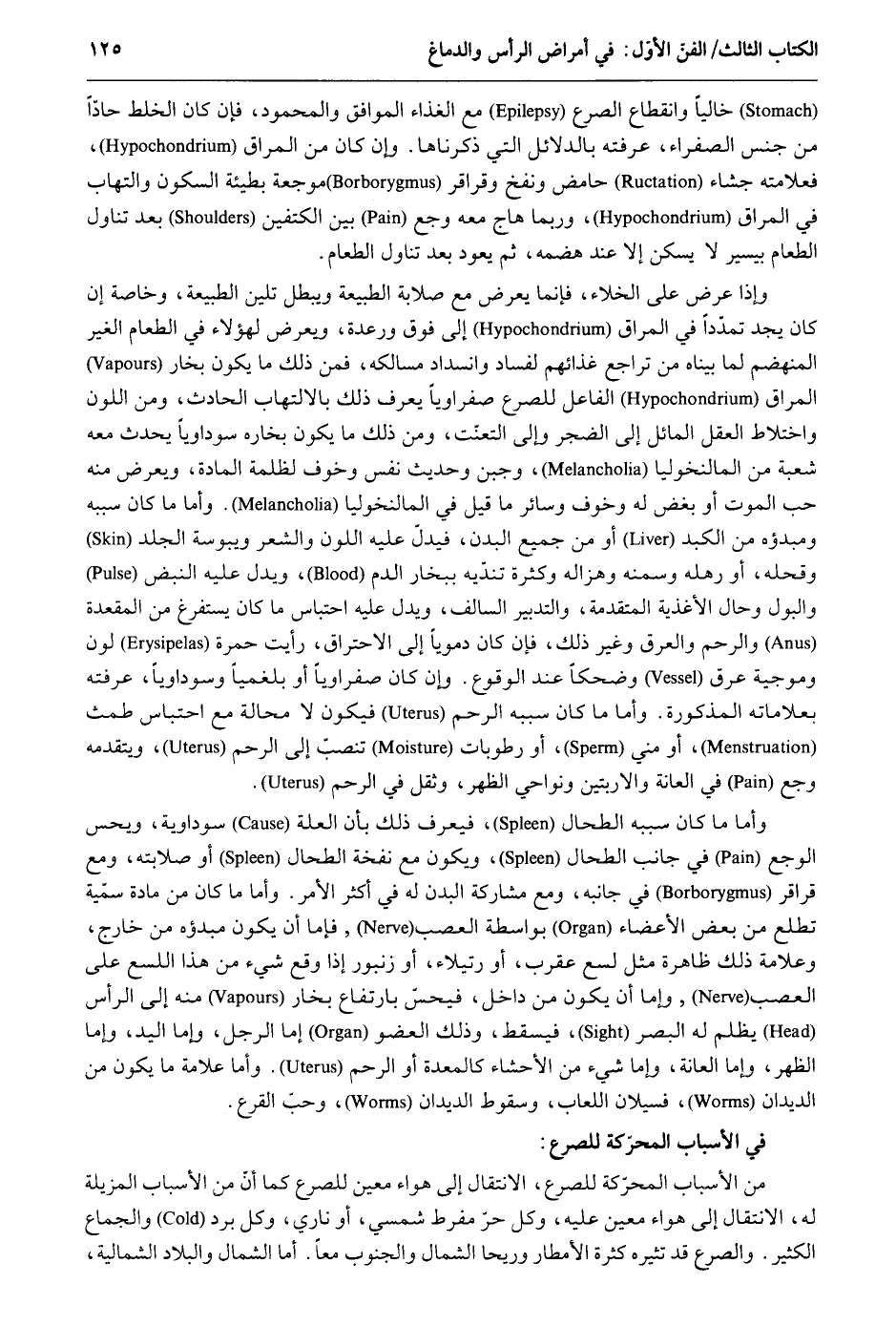 خَالِيا وَانْقِطَاع الصرع مَعَ الْغذَاء الْمُوَافق والمحمود فَإِن كَانَ الْخَلْط حاداً من جنس الصَّفْرَاء عَرفته بالدلائل الَّتِي ذَكرنَاهَا. وَإِن كَانَ من المراق فعلامته جشاء حامض نفخ وقراقر موجعة بطيئة السّكُون والتهاب فِي المراق وَرُبمَا هاج مَعَه وجع بَين الْكَتِفَيْنِ بعد تنَاول الطَّعَام بِيَسِير لَا يسكن إِلَّا عِنْد هضمه ثمَّ يعود بعد تنَاول الطَّعَام. وَإِذا عرض على الْخَلَاء فَإِنَّمَا يعرض مَعَ صلابة وَيبْطل تلين الطبيعة وخاصة إِن كَانَ يجد تمدداً فِي المراق إِلَى فَوق ورعدة ويعرض لهَؤُلَاء فِي الطَّعَام الْغَيْر المنهضم لما بَيناهُ من تراجع غذائهم لفساد وانسداج مسالكه فَمن ذَلِك مَا يكون بخار المراق الْفَاعِل للصرع صفراوياً يعرف ذَلِك بالالتهاب الْحَادِث وَمن اللَّوْن واختلاط الْعقل المائل إِلَى الضجر وَإِلَى التعنت وَمن ذَلِك مَا يكون بخاره سوداوياً يحدث مَعَه شُعْبَة من المالنخوليا وَجبن وَحَدِيث نفس وَخَوف لظلمة الْمَادَّة ويعرض مِنْهُ حب الْمَوْت أَو بغض لَهُ وَخَوف سَائِر مَا قبل فِي المالنخوليا. وَأما مَا كَانَ سَببه ومبؤه من الكبد أَو من جَمِيع الْبدن فَيدل على اللَّوْن وَالشعر يبوسة الْجلد وقحله أَو رهله وسمنه وهزاله وَكَثْرَة تنديه ببخار الدَّم وَيدل على النبض وَالْبَوْل وَحَال الأغذية الْمُتَقَدّمَة وَالتَّدْبِير السالف وَيدل عَلَيْهِ على احتباس مَا كَانَ يستفرغ من المقعدة وَالرحم والعرق وَغير ذَلِك فَإِن كَانَ دموياً إِلَى الاحتراق رَأَيْت حمرَة لون وموجية عرق وضحكاً عِنْد الْوُقُوع وَإِن كَانَ صفراوياً أَو بلغمياً وسوداوياً عَرفته بعلاماته الْمَذْكُورَة وَأما مَا كَانَ سَببه الرَّحِم فَيكون لَا محَالة مَعَ احتباس طمث أَو مني أَو رطوبات تنصب إِلَى الرَّحِم ويتقدمه وجع فِي الْعَانَة والاربتين ونواحي الظّهْر وَثقل فِي الرَّحِم. وَأما مَا كَانَ سَببه الطحال فَيعرف ذَلِك بِأَن الْعلَّة سوداوية ويحس الوجع فِي جَانب الطحال وَيكون مَعَ نفخة الطحال أَو صلابته وَمَعَ قراقر فِي جَانِبه وَمَعَ مُشَاركَة الْبدن لَهُ فِي أَكثر الْأَمر. وَأما مَا كَانَ من مَادَّة سميَّة تطلع من بعض الْأَعْضَاء بِوَاسِطَة العصب فإمَّا أَن يكون مبدؤه من خَارج وعلامة ذَلِك ظَاهِرَة مثل لسع عقرب أَو رتيلاء أَو زنبور إِذا وَقع شَيْء من هَذَا اللسع على العصب وَإِمَّا أَن يكون من دَاخل فيحس بارتفاع بخار مِنْهُ إِلَى الرَّأْس يظلم لَهُ الْبَصَر فَيسْقط وَذَلِكَ الْعُضْو وَإِمَّا الرجل وَإِمَّا الْيَد وَإِمَّا الظّهْر وَإِمَّا الْعَانَة وَإِمَّا شَيْء من الأحشاء كالمعدة أَو الرَّحِم. وَأما عَلامَة مَا يكون من الديدان فسيلان اللعاب وَسُقُوط الديدان وَحب القرع. فِي الْأَسْبَاب المحركة للصرع: من الْأَسْبَاب المحركة للصرع الِانْتِقَال إِلَى هَوَاء معِين للصرع كَمَا أَن من الْأَسْبَاب المزيلة لَهُ الِانْتِقَال إِلَى هَوَاء معِين عَلَيْهِ وكل حر مفرط شمسي أَو نَارِي وكل برد وَالْجِمَاع الْكثير. والصرع قد يثيره كَثْرَة الأمطار وريحا الشمَال والجنوب مَعًا. أما الشمَال والبلاد الشمالية
