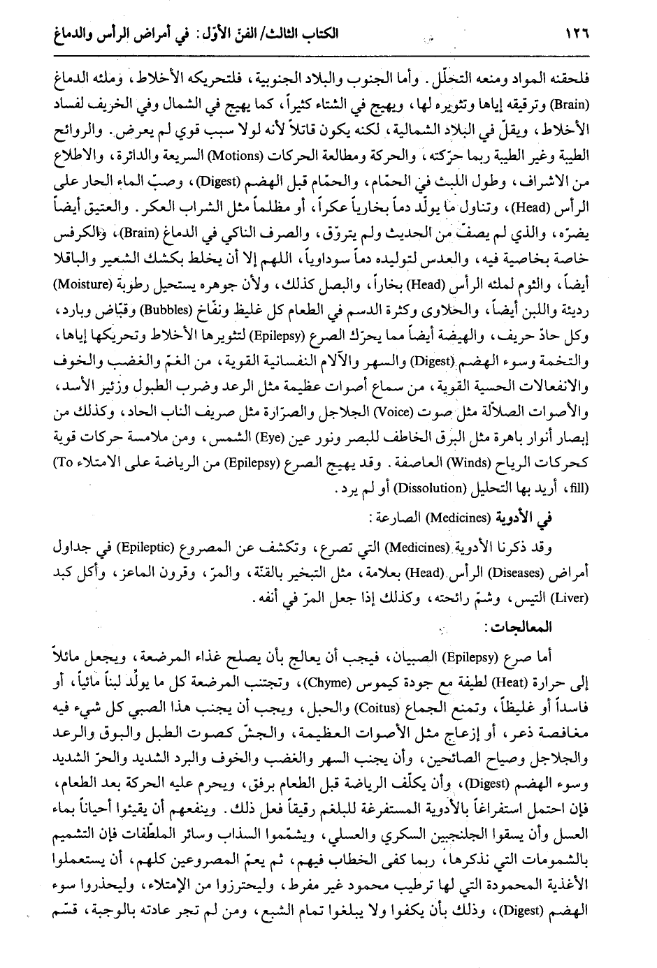 فلحقنه الْموَاد وَمنعه التَّحَلُّل. وَأما الْجنُوب والبلاد الجنوبية فلتحريكه الأخلاط وملئه الدِّمَاغ وترقيقه إِيَّاهَا وتثويره لَهَا ويهيج فِي الشتَاء كثيرا كَمَا يهيج فِي الشمَال وَفِي الخريف لفساد الأخلاط ويقل فِي الْبِلَاد الشمالية لكنه يكون قَاتلا لِأَنَّهُ لَوْلَا سَبَب قوي لم يعرض. والروائح الطّيبَة وَغير الطّيبَة رُبمَا حركته وَالْحَرَكَة ومطالعة الحركات السريعة والدائرة والاطلاع من الاشراف وَطول اللّّبْث فِي الْحمام وَالْحمام قبل الهضم وصب المَاء الْحَار على الرَّأْس وَتَنَاول مَا يُولد دَمًا بخارياً عكراً أَو مظلماً مثل الشَّرَاب العكر. والعتيق أَيْضا يضرّهُ وَالَّذِي لم يصفّ من الحَدِيث وَلم يتروق وَالصرْف الناكي فِي الدِّمَاغ والكرفس خَاصَّة بخاصية فِيهِ والعدس لتوليده دَمًا سوداوياً اللَّهُمَّ إِلَّا أَنه يخلط بكشك الشّعير والباقلا أَيْضا والثوم لملئه الرَّأْس بخاراً والبصل كَذَلِك وَلِأَن جوهره يَسْتَحِيل رُطُوبَة رَدِيئَة وَاللَّبن أَيْضا والحلاوى وَكَثْرَة الدسم فِي الطَّعَام كل غليظ ونفّاخ وقباض وبارد وكل حادّ حريف والهيضة أَيْضا مِمَّا يحرّك الصرع لتثويرها الأخلاط وتحريكه إِيَّاهَا والتخمة وَسُوء الهضم والسهر والآلام النفسانية القوية من الغمّ وَالْغَضَب وَالْخَوْف والانفعالات الحسية القوية من سَماع أصوات عَظِيمَة مثل الرَّعْد وَضرب الطبول وزئير الْأسد والأصوات الصلاّلة مثل صَوت الجلاجل والصرّارة مثل صريف الناب الحاد وَكَذَلِكَ من إبصار أنوار باهرة مثل الْبَرْق الخاطف لِلْبَصَرِ وَنور عين الشَّمْس وَمن ملامسة حركات قَوِيَّة كحركات الرِّيَاح الْعَاصِفَة. وَقد يهيج الصرع من الرياضة على الامتلاء أُرِيد بهَا التَّحْلِيل أَو لم يرد. فِي الْأَدْوِيَة الصارعة: وَقد ذكرنَا الْأَدْوِيَة الَّتِي تصرع وَتكشف عَن المصروع فِي جداول أمراض الرَّأْس بعلامة مثل التبخير بالقنّة والمر وقرون الماعز وَأكل كبد التيس وشمّ رَائِحَته وَكَذَلِكَ إِذا جعل المرّ فِي أَنفه. المعالجات: أما صرع الصّبيان فَيجب أَن يعالج بِأَن يصلح غذَاء الْمُرضعَة وَيجْعَل مائلاً إِلَى حرارة لَطِيفَة مَعَ جودة كيموس وتجتنب الْمُرضعَة كل مَا يولِّد لَبَنًا مائياً أَو فَاسِدا أَو غليظاً وتمنع الْجِمَاع وَالْحَبل وَيجب أَن يجنب هَذَا الصَّبِي كل شَيْء فِيهِ مغافصة ذعر أَو إزعاج مثل الْأَصْوَات الْعَظِيمَة والجشّ كصوت الطبل والبوق والرعد والجلاجل وصياح الصائحين وَأَن يجنب السهر وَالْغَضَب وَالْخَوْف وَالْبرد الشَّديد والحرّ الشَّديد وَسُوء الهضم وَأَن يكلّف الرياضة قبل الطَّعَام بِرِفْق وَيحرم عَلَيْهِ الْحَرَكَة بعد الطَّعَام فَإِن احْتمل استفراغاً بالأدوية المستفرغة للبلغم رَقِيقا فعل ذَلِك. وينفعهم أَن يقيئوا أَحْيَانًا بِمَاء الْعَسَل وَأَن يسقوا الجلنجبين السكرِي والعسلي ويشمموا السذاب وَسَائِر الملطّفات فَإِن التشميم بالشمومات الَّتِي نذكرها رُبمَا كفى الْخطاب فيهم ثمَّ يعم المصروعينكلهم أَن يستعملوا الأغذية المحمودة الَّتِي لَهَا ترطيب مَحْمُود غير مفرط وليحترزوا من الامتلاء وليحذروا سوء الهضم وَذَلِكَ بِأَن يكفوا وَلَا يبلغُوا تَمام الشِّبَع وَمن لم تجر عَادَته بالوجبة قسّم