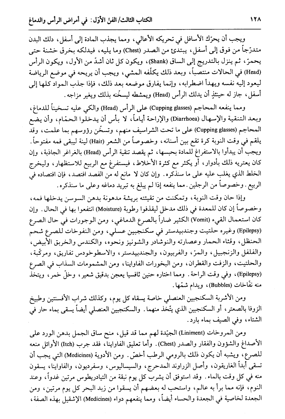 وَيجب أَن يُحَرك الأسافل فِي تحريكه الأعالي وَمِمَّا يجذب الْمَادَّة إِلَى أَسْفَل دلك الْبدن متحرجاً من فَوق إِلَى أَسْفَل يَبْتَدِئ من الصَّدْر وَمَا يَلِيهِ فيدلكه بخرق خشنة حَتَّى يحمر ثمَّ ينزل بالتدريج إِلَى السَّاق وَيكون كل ثَان أشدّ من الأول وَيكون الرَّأْس فِي الْحَالَات منتصباً وَبعد ذَلِك يكلّفه الْمَشْي وَيجب أَن يريحه فِي مَوضِع الرياضة ليعود إِلَيْهِ نَفسه ويهدأ اضطرابه وَإِنَّمَا يُفَارق موضعَه بعد ذَلِك فَإِذا جذب الْموَاد كلهَا إِلَى أَسْفَل جَازَ لَهُ حِينَئِذٍ أَن يدلك الرَّأْس ويمشطه ليسخنه بذلك ويغير مزاجه. وَمِمَّا يَنْفَعهُ المحاجم على الرَّأْس والكي عَلَيْهِ تسخيناً للدماغ وَبعد التنقية والإسهال والإراحة أَيَّامًا لَا بَأْس أَن يدخلُوا الحمّام وَأَن يضع المحاجم على مَا تَحت الشراسيف مِنْهُم وتسخن رؤوسهم بِمَا علمت وَقد يلقم فِي وَقت النّوبَة كرة تقع بَين أَسْنَانه وخصوصاً من الشّعْر لينَة ليبقى فَمه مَفْتُوحًا. وَيجب أَن يبدءوا بالاستفراغ للمادة بحبسها ثمَّ يقْصد تنقية الرَّأْس بالغراغر الجاذبة وَإِن كَانَ يَعْتَرِيه ذَلِك بأدوار أَو يكثر مَعَ كَثْرَة الأخلاط فيستفرغ مَعَ الرّبيع للاستظهار وليخرج الْخَلْط الَّذِي يغلب عَلَيْهِ على مَا سَنذكرُهُ وَإِن كَانَ لَا مَانع لَهُ من الفصد افتصد فَإِن افتصاده فِي الرّبيع - وخصوصاً من الرجلَيْن - مِمَّا يَنْفَعهُ إِذا لم يبلغ بِهِ تبريد دماغه وعَلى مَا سَنذكرُهُ. وَإِذا حَان وَقت النّوبَة وتمكنت من تقيئته بريشة مدهونة بدهن السوسن يدخلهَا فَمه وخصوصاً إِن كَانَ للمعدة فِي ذَلِك مدْخل ليقذفوا رُطُوبَة انتفعوا بهَا فِي الْحَال. وَإِن كَانَ اسْتِعْمَال الْقَيْء الْكثير ضاراً بالصرع الدماغي وَمن الوجورات فِي حَال الصرع وَغَيره حلتيت وجندبيدستر فِي سكنجبين عَسَلِي وَمن النفوخات للصرع شَحم الحنظل وقثاء الْحمار وعصارته والنوشادر والشونير وَنَحْوه والكندس والخربق الْأَبْيَض والفلفل والزنجبيل والمرّ والفربيون والجندبيدستر والاسطوخودس تفاريق ومركّبة والحلتيت والزفت والقطران وَمن البخورات الفاواينا وَمن المشمومات السذاب فِي الصرع وَفِي وَقت الرَّاحَة. وَمِمَّا اخْتَارَهُ حنين ثافسيا يعجن بدقيق شعير وخل خمر ويتخذ مِنْهُ نفّاخات ويدام شمّها. وَمن الْأَشْرِبَة السكنجبين العنصلي خَاصَّة يسقاه كل يَوْم وَكَذَلِكَ شراب الأفسنتين وطبيخ الزوفا بالصعتر أَو السكنجبين الَّذِي يتّخذ مِنْهُمَا والسكنجبين العنصلي أَيْضا يسقى بِمَاء حَار فِي الشتَاء وَفِي الصَّيف بِمَاء بَارِد. وَمن المروخات الجيّدة لَهُم مِمَّا قد قيل منح سَاق الْجمل بدهن الْورْد على الأصداغ والشؤون والفقار والصدر. وَأما تَعْلِيق الفاواينا فقد جرب الْأَوَائِل مَنعه للصرع وَيُشبه أَن يكون ذَلِك بالرومي الرطب أخصّ. وَمن الْأَدْوِيَة الَّتِي يجب أَن تسقى أبدا الغاريقون وأصل الزراوند المدحرج والسيساليوس وسفرديون والفاواينا يسقون مِنْهُ فِي كل وَقت بِالْمَاءِ. وَقد استوفق أَن يشرب كل يَوْم نبقة من التيادريطوس مرَّتَيْنِ غدواً وَعند النّوم فَإِنَّهُ مِمَّا برأَ بِهِ عَالم واستجب لَهُ بَعضهم أَن يسقوا من زبد الْبَحْر كل يَوْم مرَّتَيْنِ وَمن الجعدة لخاصية فِي الجعدة والحساء أَيْضا وَمِمَّا يَنْفَعهُمْ دَوَاء الإشقيل بِهَذِهِ الصّفة