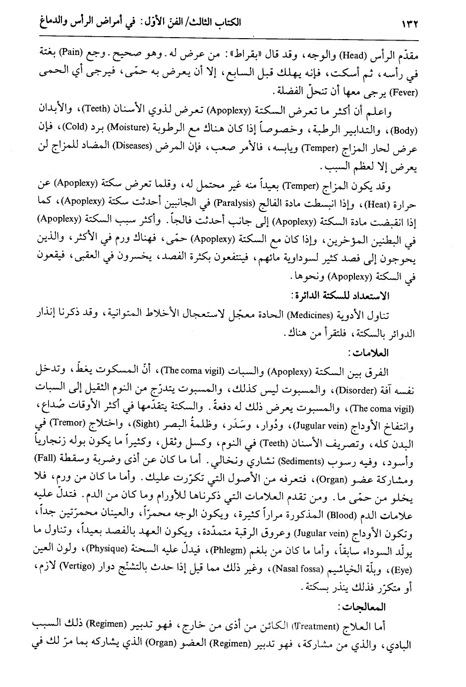 مقدّم الرَّأْس وَالْوَجْه وَقد قَالَ بقراط: من عرض لَهُ - وَهُوَ صَحِيح - وجع بَغْتَة فِي رَأسه ثمَّ أسكت فَإِنَّهُ يهْلك قبل السَّابِع إِلَّا أَن يعرض بِهِ حمى فيرجى أَي الْحمى يُرْجَى مَعهَا أَن تنحلّ الفضلة. وَاعْلَم أَن أَكثر مَا تعرض السكتة تعرض لِذَوي الْأَسْنَان والأبدان والتدابير الرّطبَة وخصوصاً إِذا كَانَ هُنَاكَ مَعَ الرُّطُوبَة برد فَإِن عرض لحار المزاج ويابسه فَالْأَمْر صَعب فَإِن الْمَرَض المضاد للمزاج لن يعرض إِلَّا لعظم السَّبَب. وَقد يكون المزاج بَعيدا مِنْهُ غير مُحْتَمل لَهُ وقلما تعرض سكتة عَن حرارة وَإِذا انبسطت مَادَّة الفالج فِي الْجَانِبَيْنِ أحدثت سكتة كَمَا إِذا انقبضت مَادَّة السكتة إِلَى جَانب أحدثت فالجاً. وَكثر سَبَب السكتة فِي البطنين المؤخرين وَإِذا كَانَ مَعَ السكتة حمّى فهناك ورم فِي الْأَكْثَر وَالَّذِي يحوجون إِلَى فصد كثير لسوداوية مَائِهِمْ فينتفعون بِكَثْرَة الفصد يخسرون فِي العقبى فيقعون فِي السكتة وَنَحْوهَا. الاستعداد للسكتة الدائرة: تنَاول الْأَدْوِيَة الحادة معجل لاستعجال الأخلاط المتوانية وَقد ذكرنَا إنذار الدَّوَائِر بالسكتة فلتقرأ من هُنَاكَ. العلامات: الْفرق بَين السكتة والسبات أنّ الْمَسْكُوت يغطّ وَتدْخل نَفسه آفَة والمسبوت لَيْسَ كَذَلِك والمسبوت يتدرّج من النّوم الثقيل إِلَى السبات والمسبوت يعرض ذَلِك لَهُ دفْعَة. والسكتة يتقدمها فِي أَكثر الْأَوْقَات صُداع وانتفاخ الْأَوْدَاج ودُوار وسَدر وظلمةُ البَصر واختلاج فِي الْبدن كُله وتريف الْأَسْنَان فِي النّوم وكسل وَثقل وَكَثِيرًا مَا يكون بَوْله زنجارياً وأسود وَفِيه رسوب نشاري ونخالي. أما مَا كَانَ عَن أَذَى وضربة وسقطة ومشاركة عُضْو فتعرفه من الْأُصُول الَّتِي تكرّرت عَلَيْك. وَأما مَا كَانَ من ورم فَلَا يخلوَ من حمى مَا. وَمن تقدم العلامات الَّتِي ذَكرنَاهَا للأورام وَمَا كَانَ من الدَّم. فَيدل عَلَيْهِ عَلَامَات الدَّم الْمَذْكُورَة مرَارًا كَثِيرَة وَيكون الْوَجْه محمراً والعينان محمرّتين جدا وَتَكون الْأَوْدَاج وعروق الرَّقَبَة متمدّدة وَيكون الْعَهْد بالفصد بَعيدا وَتَنَاول مَا يُولد السَّوْدَاء سَابِقًا وَأما مَا كَانَ من بلغم فَيدل عَلَيْهِ السحنة ولون الْعين وبلّة الخياشيم وَغير ذَلِك مِمَّا قيل إِذا حدث بالتشنّج دوار لَازم أَو متكرّر فَذَلِك ينذر بسكتة. المعالجات: أما العلاج الْكَائِن من أَذَى من خَارج فَهُوَ تَدْبِير ذَلِك السَّبَب البادي وَالَّذِي من مُشَاركَة فَهُوَ تَدْبِير الْعُضْو الَّذِي يُشَارِكهُ بِمَا مر لَك فِي