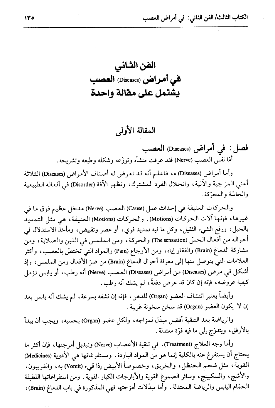 أمّا نفس العصب فقد عرفت منشأة وتوزّعه وشكله وطبعه وتشريحه. وَأما أمراضه فَاعْلَم أَنه قد تعرض لَهُ أَصْنَاف الْأَمْرَاض الثَّلَاثَة أَعنِي المزاجية والآلية وانحلال الْفَرد الْمُشْتَرك وَتظهر الآفة فِي أَفعاله الطبيعية والحاسّة والمحرّكة. والحركات العنيفة فِي إِحْدَاث علل العصب مدْخل عَظِيم فَوق مَا فِي غَيرهَا فَإِنَّهَا آلَات الحركات. والحركات العنيفة هِيَ مثل التمديد بالحبل وَرفع الشَّيْء الثقيل وكل مَا فِيهِ تمديد قوي أَو عصر وتقبيض ومأخذ الِاسْتِدْلَال فِي أَحْوَاله من أَفعَال الحسّ وَالْحَرَكَة وَمن الملمس فِي اللين والصلابة وَمن مُشَاركَة الدِّمَاغ والفقار إِيَّاه وَمن الأوجاع والمواد الَّتِي تختصّ بالعصب وَأكْثر العلامات الَّتِي يتَوَصَّل مِنْهَا إِلَى معرفَة أَحْوَال الدِّمَاغ من ضرّ الْأَفْعَال وَمن الملمس وَإِذ أشكل فِي مرض من أمراض العصب أَنه رطب أَو يَابِس تؤمل كَيْفيَّة عروضه فَإِنَّهُ إِن كَانَ قد عرض دفْعَة لم يشك أَنه رطب. وَأَيْضًا يعْتَبر انتشاف الْعُضْو للدهن فَإِنَّهُ إِن نشفه بِسُرْعَة لم يشك أَنه يَابِس بعد أَن لَا يكون الْعُضْو قد سخن سخونة غَرِيبَة. والرياضة بعد التنقية أفضل مبدّل لمزاجه وَلكُل عُضْو بِحَسبِهِ وَيجب أَن يبْدَأ بالأرفق ويتدرّج إِلَى مَا فِيهِ قوّة معتدلة. وَأما وَجه العلاج فِي تنقية الأعصاب وتبديل أمزجتها فَإِن أَكثر مَا يحْتَاج أَن يستفرغ عَنهُ بِالْكُلِّيَّةِ إِنَّمَا هُوَ من الْموَاد الْبَارِدَة. ومستفرغاتها هِيَ الْأَدْوِيَة القوية مثل شَحم الحنظل والخربق وخصوصاً الْأَبْيَض إِذا قيء بِهِ والفربيون والأشج والسكبينج وَسَائِر الصموغ القوية والأيارجات الْكِبَار القوية. وَمن استفراغاتها اللطيفة الْحمام الْيَابِس والرياضة المعتدلة. وَأما مبدّلات أمزجتها فَهِيَ الْمَذْكُورَة فِي بَاب الدِّمَاغ