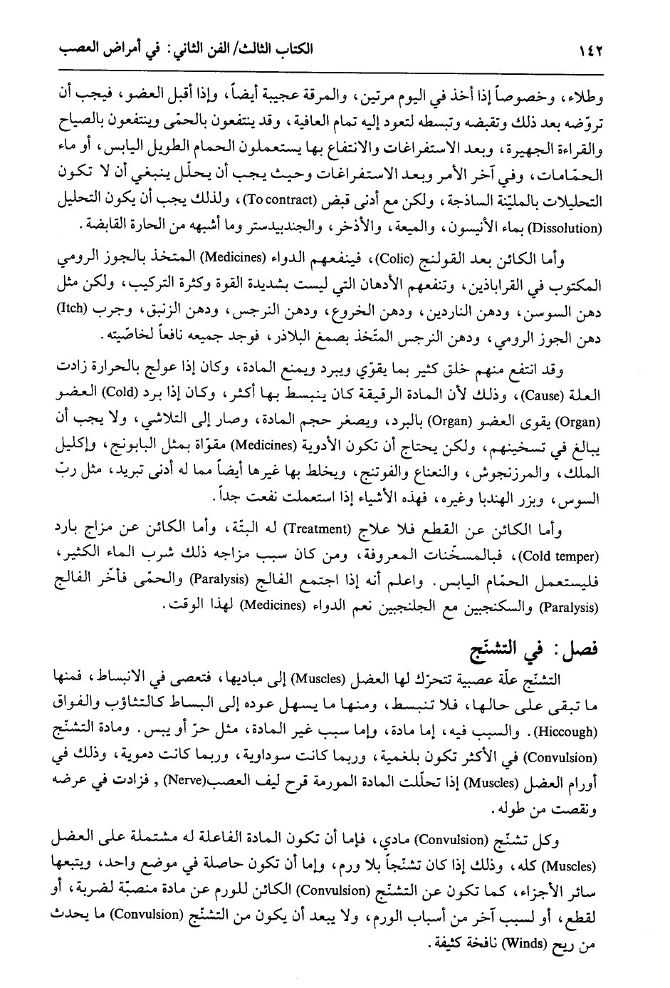 وطلاء وخصوصاً إِذا أَخذ فِي الْيَوْم مرَّتَيْنِ والمرقة عَجِيبَة أَيْضا وَإِذا أقبل الْعُضْو فَيجب أَن تروّضه بعد ذَلِك وتقبضه وتبسطه لتعود إِلَيْهِ تَمام الْعَافِيَة وَقد يَنْتَفِعُونَ بالحمّى وينتفعون بالصياح وَالْقِرَاءَة الجهيرة وَبعد الاستفراغات وَالِانْتِفَاع بهَا يستعملون الْحمام الطَّوِيل الْيَابِس أَو مَاء الحمّامات وَفِي آخر الْأَمر وَبعد الاستفراغات وَحَيْثُ يجب أَن يحلّل يَنْبَغِي أَن لَا تكون التحليلات بالمليّنة الساذجة وَلَكِن مَعَ أدنى قبض وَلذَلِك يجب أَن يكون التَّحْلِيل بِمَاء الأنيسون والميعة والأذخر والجندبيدستر وَمَا أشبهه من الحارة القابضة. وَأما الْكَائِن بعد القولنج فينفعهم الدَّوَاء الْمُتَّخذ بالجوز الرُّومِي الْمَكْتُوب فِي القراباذين وينفعهم الأدهان الَّتِي لَيست بشديدة الْقُوَّة وَكَثْرَة التَّرْكِيب وَلَكِن مثل دهن السوسن ودهن الناردين ودهن الخروع ودهن النرجس ودهن الزنبق وجرب دهن الْجَوْز الرُّومِي ودهن النرجس الْمُتَّخذ بصمغ البلاذر فَوجدَ جَمِيعه نَافِعًا لخاصيته. وَقد انْتفع مِنْهُم خلق كثير بِمَا يقوّي ويبرد وَيمْنَع الْمَادَّة وَكَانَ إِذا عولج بالحرارة زَادَت الْعلَّة وَذَلِكَ لِأَن الْمَادَّة الرقيقة كَانَ ينبسط بهَا أَكثر وَكَانَ إِذا برد الْعُضْو يقوى الْعُضْو بالبرد ويصغر حجم الْمَادَّة وَصَارَ إِلَى التلاشي وَلَا يجب أَن يُبَالغ فِي تسخينهم وَلَكِن يحْتَاج أَن تكون الْأَدْوِيَة مقوّاة بِمثل البابونج وإكليل الْملك والمرزنجوش والنعناع والفوتنج ويخلط بهَا غَيرهَا أَيْضا مِمَّا لَهُ أدنى تبريد مثل رب السوس وبزر الهندبا وَغَيره فَهَذِهِ الْأَشْيَاء إِذا اسْتعْملت نَفَعت جدا. وَأما الكَائن عَن الْقطع فَلَا علاج لَهُ الْبَتَّةَ وَأما الْكَائِن عَن مزاج بَارِد فبالمسخّنات الْمَعْرُوفَة وَمن كَانَ سَبَب مزاجه ذَلِك شرب المَاء الْكثير فليستعمل الحمّام الْيَابِس. وَاعْلَم أَنه إِذا اجْتمع الفالج فصل فِي التشنّج التشنج عِلّة عصبية تتحرّك لَهَا العضل إِلَى مباديها فتعصى فِي الانبسَاط فَمِنْهَا مَا تبقى على حَالهَا فَلَا تنبسط وَمِنْهَا مَا يسهل عوده إِلَى الْبسَاط كالتثاؤب والفواق. وَالسَّبَب فِيهِ إِمَّا مَادَّة وَإِمَّا سَبَب غير الْمَادَّة مثل حر أَو يبس. ومادة التشنّج فِي الْأَكْثَر تكون بلغمية وَرُبمَا كَانَت سوداوية وَرُبمَا كَانَت دموية وَذَلِكَ فِي أورام العضل إِذا تحللت الْمَادَّة المورمة قرح لِيف العصب فزادت فِي عرضه ونقصت من طوله. وكل تشنّج مادي فإمَّا أَن تكون الْمَادَّة الفاعلة لَهُ مُشْتَمِلَة على العضل كُله وَذَلِكَ إِذا كَانَ تشنجاً بِلَا ورم وَإِمَّا أَن تكون حَاصِلَة فِي مَوضِع وَاحِد ويتبعها سَائِر الْأَجْزَاء كَمَا تكون عَن التشنج الْكَائِن للورم عَن مَادَّة منصبة لضربة أَو لقطع أَو لسَبَب آخر من أَسبَاب الورم وَلَا يبعد أَن يكون من التشنج مَا يحدث من ريح نافخة كثيفة.