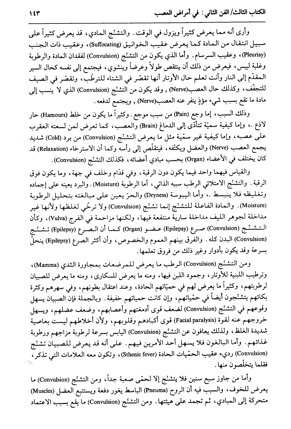 وَأرى أَنه مِمَّا يعرض كثيرا وَيَزُول فِي الْوَقْت. والتشنج المادي قد يعرض كثيرا على سَبِيل انْتِقَال من الْمَادَّة كَمَا يعرض عقيب الخوانيق وعقيب ذَات الْجنب وعقيب السرسام. وَأما الَّذِي يكون من التشنج لفقدان الْمَادَّة والرطوبة وَغَلَبَة ليبس فَيعرض من ذَلِك أَن ينتقص طولا وعرضاً وينشوي فيجتمع إِلَى نَفسه كَحال السّير المقدّم إِلَى النَّار وَأَنت تعلم حَال الأوتار أَنَّهَا تقصر فِي الشتَاء للترطب وتقصر فِي الصَّيف للتجفف وَكَذَلِكَ حَال العصب وَقد يكون من التشنّج الَّذِي لَا ينْسب إِلَى مَادَّة مَا تقع بِسَبَب شَيْء مؤذٍ ينفر عَنهُ العصب ويجتمع لدفعه. وَذَلِكَ السَّبَب إِمَّا وجع من سَبَب موجع وَكَثِيرًا مَا يكون من خلط حَار لاذع وَإِمَّا كَيْفيَّة سميَّة تتأدى إِلَى الدِّمَاغ والعصب كَمَا تعرض لمن لسعته الْعَقْرَب على عصبه وَإِمَّا كَيْفيَّة غير سميَّة مثل مَا يعرض التشنّج من برد شَدِيد يجمع العصب والعضل ويكتفه فيتقلص إِلَى رَأسه وكما أَن الاسترخاء قد كَانَ يخْتَلف فِي الْأَعْضَاء بِحَسب مبادي أَعْضَائِهِ فَكَذَلِك التشنّج. وَالْقِيَاس فيهمَا وَاحِد فِيمَا يكون دون الرَّقَبَة وَفِي قُدَّام وَخلف فِي جِهَة وَمَا يكون فَوق الرَّقَبَة. والتشنّج الامتلائي الرطب سَببه الذاتي أما الرُّطُوبَة وَالْبرد يُعينهُ على إجماده وتغليظه فَلَا ينبسط وَأما اليبوسة والحرّ يعين على مبالغته بتحليل الرُّطُوبَة. والمادة الفاعلة للتشنج إِنَّمَا تشنج وَلَا ترخي لغلظها وَلِأَنَّهَا غير مداخلة لجوهر الليف مداخلة سَارِيَة منتفعة فِيهَا وَلكنهَا مزاحمة فِي الْفرج وَكَأن التشنج صرع عُضْو كَمَا أَن الصرع تشنج الْبدن كُله. وَالْفرق بَينهم الْعُمُوم وَالْخُصُوص وَأَن أَكثر الصرع ينحلّ بِسُرْعَة وَقد يكون بأدوار وَغير ذَلِك من فروق تعلمهَا. وَمن التشنج الرطب مَا يعرض للمرضعات بمجاورة الثدي وترطيب اللبنية للأوتار وجمود اللَّبن فِيهَا وَمِنْه مَا يعرض للسكارى وَمِنْه مَا يعرض للصبيان لرطوبتهم وَكَثِيرًا مَا يعرض لَهُم فِي حميّاتهم الحادة وَعند اعتقال بطونهم وَفِي سهرهم وَكَثْرَة بكائهم يتشنّجون أَيْضا فِي حمّياتهم وَإِن كَانَت حمياتهم خَفِيفَة. وَبِالْجُمْلَةِ فَإِن الصّبيان يسهل وقوعهم فِي التشنج لضعف قوى أدمغتهم وأعصابهم وَضعف عضلهم ويسهل خُرُوجهمْ عَنهُ لقُوَّة قوى أكبادهم وَقُلُوبهمْ وَلِأَن أخلاطهم لَيست بعاصية شَدِيدَة الغلظ وَلذَلِك يعافون عَن التشنج الْيَابِس بِسُرْعَة لرطوبة مزاجهم ورطوبة غذائهم. وَأما البالغون فَلَا يسهل أحد الْأَمريْنِ فيهم. على أَنه قد يعرض للصبيان تشنج رَدِيء عقيب الحميات الحادة وَتَكون مَعَه العلامات الَّتِي تذكر فقلما يتخلصون مِنْهَا. وَأما من جَاوز سبع سِنِين فَلَا يتشنج إِلَّا لحمى صعبة جدا وَمن التشنّج مَا يعرض للخوف وَالسَّبَب فِيهِ أَن الرّوح الباسط يغور دفْعَة ويستتبع العضل متحركة إِلَى المبادي ثمَّ تجمد على هيئتها. وَمن التشنج مَا يَقع بِسَبَب الِاعْتِمَاد