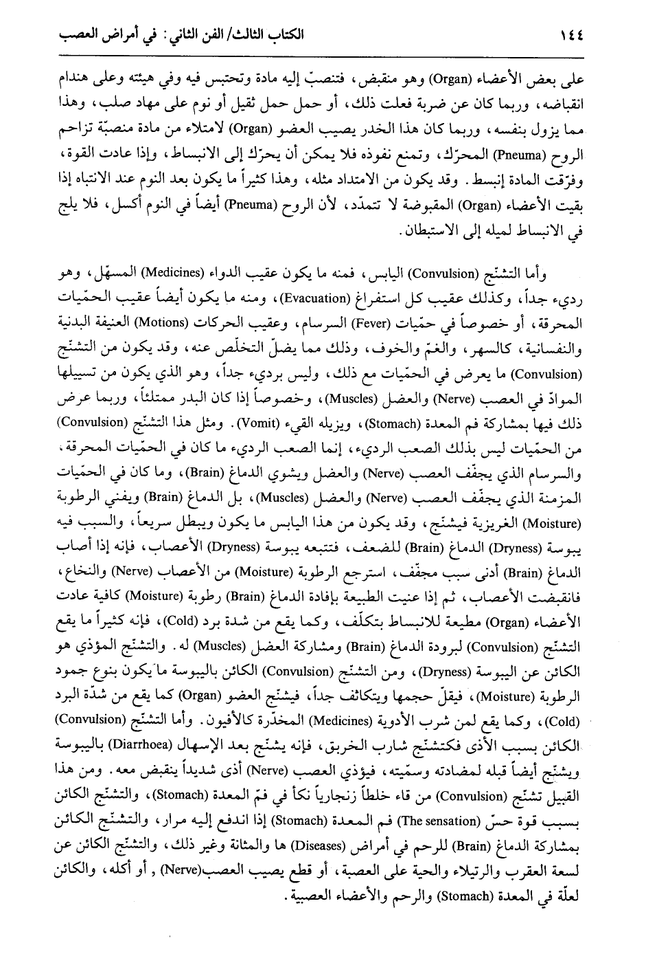 على بعض الْأَعْضَاء وَهُوَ منقبض فتنصب إِلَيْهِ مَادَّة وتحتبس فِيهِ وَفِي هَيئته وعَلى هندام انقباضه وَرُبمَا كَانَ عَن ضَرْبَة فعلت ذَلِك أَو حمل حمل ثقيل أَو نوم على مهاد صلب وَهَذَا مِمَّا يَزُول بِنَفسِهِ وَرُبمَا كَانَ هَذَا الخدر يُصِيب الْعُضْو لامتلاء من ماد منصبة تزاحم الرّوح المحرّك وتمنع نُفُوذه فَلَا يُمكن أَن يُحَرك إِلَى الانبساط وَإِذا عَادَتْ الْقُوَّة وفرّقت الْمَادَّة انبسط. وَقد يكون من الامتداد مثله وَهَذَا كثيرا مَا يكون بعد النّوم عِنْد الانتباه إِذا بقيت الْأَعْضَاء المقبوضة لَا تتمدد لِأَن الرّوح أَيْضا فِي النّوم أكسل فَلَا يلج فِي وَأما التشنج الْيَابِس فَمِنْهُ مَا يكون عقيب الدَّوَاء المسهل وَهُوَ رَدِيء جدا وَكَذَلِكَ عقيب كل استفراغ وَمِنْه مَا يكون أَيْضا عقيب الحميات المحرقة أَو خُصُوصا فِي حمّيات السرسام وعقيب الحركات العنيفة الْبَدَنِيَّة والنفسانية كالسهر وَالْغَم وَالْخَوْف وَذَلِكَ مِمَّا يضل التَّخَلُّص عَنهُ وَقد يكون من التشنج مَا يعرض فِي الحمّيات مَعَ ذَلِك وَلَيْسَ برديء جدا وَهُوَ الَّذِي يكون من تسييلها الْموَاد فِي العصب والعضل وخصوصاً إِذا كَانَ الْبَدْر ممتلئاً وَرُبمَا عرض ذَلِك فِيهَا بمشاركة فَم الْمعدة ويزيله الْقَيْء. وَمثل هَذَا التشنّج من الحميات لَيْسَ بذلك الصعب الرَّدِيء إِنَّمَا الصعب الرَّدِيء مَا كَانَ فِي الحميات المحرقة والسرسام الَّذِي يجفف العصب والعضل ويشوي الدِّمَاغ وَمَا كَانَ فِي الحمّيات المزمنة الَّذِي يجفف العصب والعضل بل الدِّمَاغ ويفني الرُّطُوبَة الغريزية فيشنّج وَقد يكون من هَذَا الْيَابِس مَا يكون وَيبْطل سَرِيعا وَالسَّبَب فِيهِ يبوسة الدِّمَاغ للضعف فيتبعه يبوسة الأعصاب فَإِنَّهُ إِذا أصَاب الدِّمَاغ أدنى سَبَب مجفف اسْترْجع الرُّطُوبَة من الأعصاب والنخاع فانقبضت الأعصاب ثمَّ إِذا عنيت الطبيعة بإفادة الدِّمَاغ رُطُوبَة كَافِيَة عَادَتْ الْأَعْضَاء مطيعة للانبساط بتكلف وكما يَقع من شدَّة برد فَإِنَّهُ كثيرا مَا ينفع التشنج لبرودة الدِّمَاغ ومشاركة العضل لَهُ. والتشنّج المؤذي هُوَ الْكَائِن عَن اليبوسة وَمن التشنج الْكَائِن باليبوسة مَا يكون بِنَوْع جمود الرُّطُوبَة فيقل حجمها ويتكاثف جماً فيشنج الْعُضْو كَمَا يَقع من شدَّة الْبرد وكما يَقع لمن شرب الْأَدْوِيَة المخدرة كالأفيون. وَأما التشنج الْكَائِن بِسَبَب الْأَذَى فكتشنج شَارِب الخربق فَإِنَّهُ يشنج بعد الإسهال باليبوسة ويشنج أَيْضا قبله لمضادته وسميته فيؤذي العصب أَذَى شَدِيدا ينقبض مَعَه. وَمن هَذَا الْقَبِيل تشنج من قاء خلطاً زنجارياً نكأ فِي فَم الْمعدة والتشنّج الْكَائِن بِسَبَب قُوَّة حس فَم الْمعدة إِذا انْدفع إِلَيْهِ مرار والتشنج الْكَائِن بمشاركة الدِّمَاغ للرحم فِي أمراضها والمثانة وَغير ذَلِك والتشنج الْكَائِن عَن لسعة الْعَقْرَب والرتيلاء والحية على الْعصبَة أَو قطع يُصِيب العصب أَو كُله والكائن لعِلَّة فِي الْمعدة وَالرحم والأعضاء العصبية.