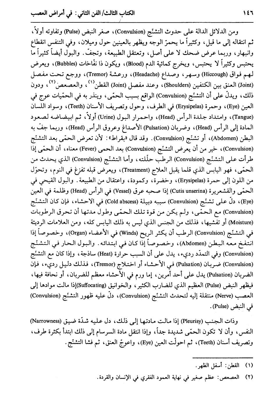 وَمن الدَّلَائِل الدَّالَّة على حُدُوث التشنّج صغر النبض وتفاوته أَولا ثمَّ انْتِقَاله إِلَى مَا قيل وَكَثِيرًا مَا يحمر الْوَجْه وَيظْهر بالعينين حول وميلان وَفِي التنفس انْقِطَاع وانبهار وَرُبمَا عرض ضحك لَا على أصل وتعتقل الطبيعة وتجفّ. وَالْبَوْل أَيْضا كثيرا مَا يحتبس وَكَثِيرًا لَا يحتبس وَيخرج كمائية الدَّم وَيكون ذَا نفاخات ويعرض لَهُم فوَاق وسهر وصداع ورعشة ووجع تَحت مفصل الْعُنُق بَين الْكَتِفَيْنِ وَعند مفصل الْقطن والعصعص وَدون ذَلِك ويدلّ على أَن التشنج الْوَاقِع بِسَبَب الْحمى وينذر بِهِ فِي الحميات عوج فِي الْعين وَحُمرَة فِي الطّرف وحول وتصريف الْأَسْنَان وَسَوَاد اللِّسَان وامتداد جلدَة الرَّأْس واحمرار الْبَوْل أَولا ثمَّ ابيضاضه لصعود الْمَادَّة إِلَى الرَّأْس وضربان الأصداغ وعروق الرَّأْس وَرُبمَا جف بِهِ الْبَطن أَو تشنج. وَقد قَالَ بقراط: لِأَن تعرض الْحمى بعد التشنج خير من أَن يعرض التشنج بعد الْحمى مَعْنَاهُ أَن الحمّى إِذا طرأت على التشنج الرطب حللته وَأما التشنج الَّذِي يحدث من الْحمى فَهُوَ الْيَابِس الَّذِي قَلما يقبل العلاج ويعرض قبله تفزع فِي النّوم وتحول من اللَّوْن إِلَى حمرَة وخضرة وكمودة واعتقال من الطبيعة. وَالْبَوْل القيحي فِي الحمّى والقشعريرة إِذا صَحبه عرق فِي الرَّأْس وظلمة فِي الْعين دلّ على تشنّج سَببه دبيلة فِي الأحشاء فَإِن كَانَ التشنّج مَعَ الْحمى وَلم يكن من قُوَّة تِلْكَ الحمّى وَطول مدَّتهَا أَن تحرق الرطوبات أَو تفشيها فَذَلِك من الْجِنْس الَّذِي لَيْسَ بِهِ ذَلِك الْيَابِس كُله وَمن العلامات الرَّديئَة فِي التشنّج الرطب أَن فِي الرّيح فِي الْأَعْضَاء وخصوصاً إِذا انتفخ مَعَه الْبَطن وخصوصاً إِذا كَانَ فِي ابْتِدَائه. وَالْبَوْل الْحَار فِي التشنّج وَفِي التمدّد رَدِيء يدل على أَن السَّبَب حرارة ساذجة وَإِذا كَانَ مَعَ التشنّج ضَرْبَان فِي الأحشاء أَو اخْتِلَاج فَذَلِك دَلِيل رَدِيء فَإِن الضربان يدل على أحد أَمريْن إِمَّا ورم فِي الأحشاء مُعظم للضربان أَو نحافة فِيهَا فَيظْهر النبض الْعَظِيم الَّذِي للضارب الْكثير والخوانيق إِذا مَالَتْ موادها إِلَى العصب منتقلة إِلَيْهِ لتحدث التشنّج دلّ عَلَيْهِ ظُهُور التشنّج فِي النبض. وَذَات الْجنب إِذا مَالَتْ مادتها إِلَى ذَلِك دلّ عَلَيْهِ شدّة ضيق النَّفس وَأَن لَا تكون الْحمى شَدِيدَة جدا وَإِذا انْتقل مَادَّة السرسام إِلَى ذَلِك ابْتَدَأَ بِكَثْرَة طرف وتصريف أَسْنَان ثمَّ احولت الْعين واعوجّ الْعُنُق ثمَّ فَشَا التشنّج.