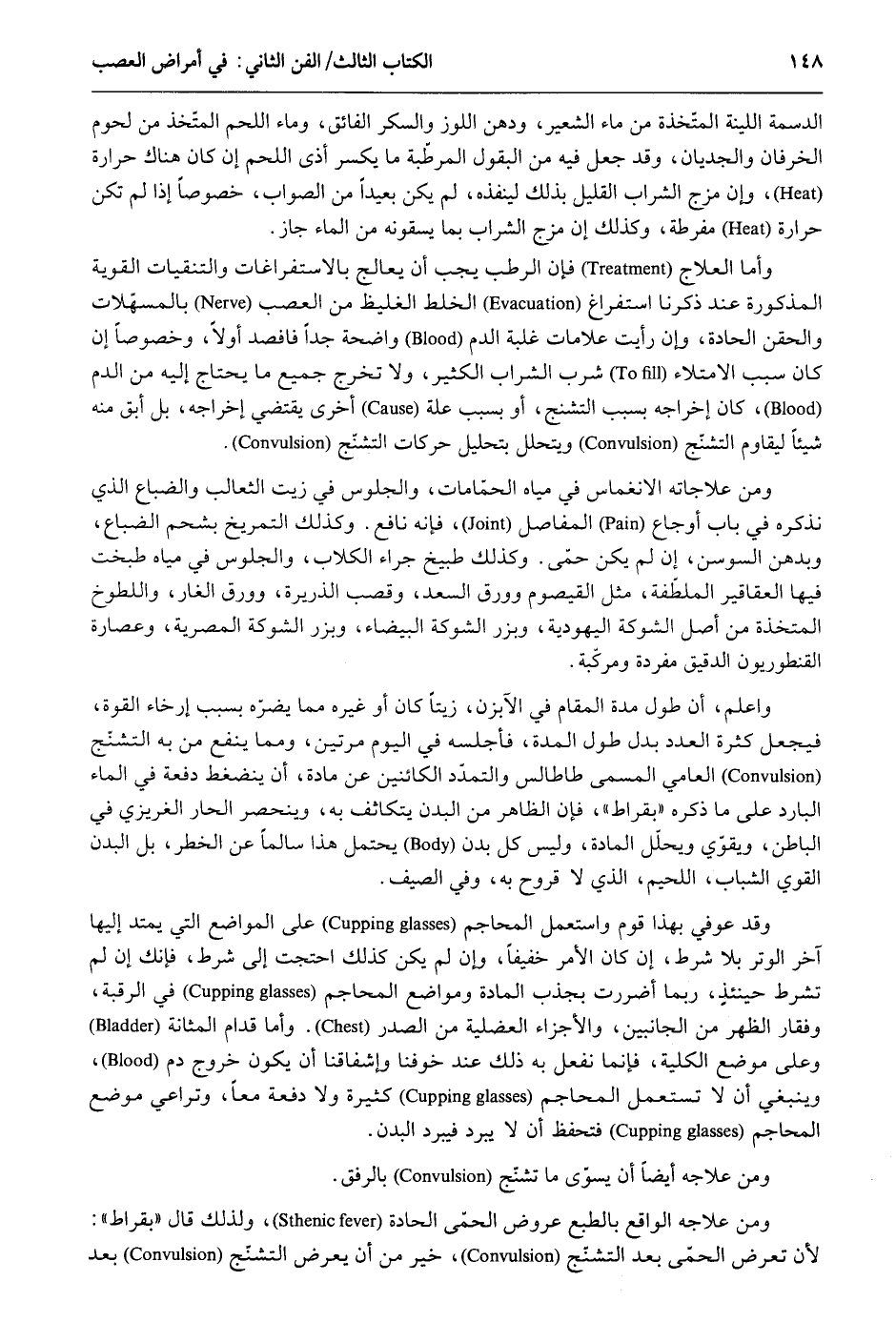 الدسمة اللينة المتخذة من مَاء الشّعير ودهن الوز وَالسكر الْفَائِق وَمَاء اللَّحْم الْمُتَّخذ من لُحُوم الخرفان والجديان وَقد جعل فِيهِ من الْبُقُول المرطّبة مَا يكسر أَذَى اللَّحْم إِن كَانَ هُنَاكَ حرارة وَإِن مزج الشَّرَاب الْقَلِيل بذلك لينفذه لم يكن بَعيدا من الصَّوَاب خُصُوصا إِذا لم تكن حرارة مفرطة وَكَذَلِكَ إِن مزج الشَّرَاب بِمَا يسقونه من المَاء جَازَ. وَأما العلاج فَإِن الرطب يجب أَن يعالج بالاستفراغات والتنقيات القوية الْمَذْكُورَة عِنْد ذكرنَا استفراغ الْخَلْط الغليظ من العصب بالمسهّلات والحقن الحادة وَإِن رَأَيْت عَلَامَات غَلَبَة الدَّم وَاضِحَة جدا فافصد أَولا وخصوصاً إِن كَانَ سَبَب الامتلاء شرب الشَّرَاب الْكثير وَلَا تخرج جَمِيع مَا يحْتَاج إِلَيْهِ من الدَّم كَانَ إِخْرَاجه بِسَبَب التشنج أَو بِسَبَب عِلّة أُخْرَى يَقْتَضِي إِخْرَاجه بل آبق مِنْهُ شَيْئا ليقاوم التشنّج ويتحلل بتحليل حركات التشنج. وَمن علاجاته الانغماس فِي مياه الحمّامات وَالْجُلُوس فِي زَيْت الثعالب والضباع الَّذِي نذكرهُ فِي بَاب أوجاع المفاصل فَإِنَّهُ نَافِع. وَكَذَلِكَ التمريخ بشحم الضباع وبدهن السوسن إِن لم يكن حمى. وَكَذَلِكَ طبيخ جراء الْكلاب وَالْجُلُوس فِي مياه طبخ فِيهَا العقاقير الملطّفة مثل القيصوم وورق السعد وقصب الفريرة وورق الْغَار واللطوخ المتخذة من أصل الشَّوْكَة الْيَهُودِيَّة وبزر الشَّوْكَة الْبَيْضَاء وبزر الشَّوْكَة المصرية وعصارة القنطوريون الدَّقِيق مُفْردَة ومركبة. وَاعْلَم أَن طول مُدَّة الْمقَام فِي الآبزن زيتاً كَانَ أَو غَيره مِمَّا يضرّهُ بِسَبَب إرخاء الْقُوَّة فَيجْعَل كَثْرَة الْعدَد بدل طول الْمدَّة فأجلسه فِي الْيَوْم مرَّتَيْنِ وَمِمَّا ينفع من بِهِ التشنج الْعَاميّ الْمُسَمّى طاطالس والتمدد الكائنين عَن مَادَّة أَن ينضغط دفْعَة فِي المَاء الْبَارِد على مَا ذكره بقراط فَإِن الظَّاهِر من الْبدن يتكاثف بِهِ وينحصر الْحَار الغريزي فِي الْبَاطِن وَيُقَوِّي ويحلل الْمَادَّة وَلَيْسَ كل بدن يحْتَمل هَذَا سالما عَن الْخطر بل الْبدن الْقوي الشَّبَاب اللحيم الَّذِي لَا قُرُوح بِهِ وَفِي الصَّيف. وَقد عوفي بِهَذَا قوم وَاسْتعْمل المحاجم على الْمَوَاضِع الَّتِي يَمْتَد إِلَيْهَا آخر الْوتر بِلَا شَرط إِن كَانَ الْأَمر خَفِيفا وَإِن لم يكن كَذَلِك احتجت إِلَى شَرط فَإنَّك إِن لم تشرط حِينَئِذٍ رُبمَا أضررت بجذب الْمَادَّة ومواضع المحاجم فِي الرَّقَبَة وفقار الظّهْر من الْجَانِبَيْنِ والأجزاء العضلية من الصَّدْر. وَأما قُدَّام المثانة وعَلى مَوضِع الْكُلية فَإِنَّمَا نَفْعل بِهِ ذَلِك عِنْد خوفنا وإشفاقنا أَن يكون خُرُوج دم وَيَنْبَغِي أَن لَا تسْتَعْمل المحاجم كَثِيرَة وَلَا دفْعَة مَعًا وتراعي مَوضِع المحاجم فتحفظ أَن لَا يبرد فيبرد الْبدن. وَمن علاجه أَيْضا أَن يسوى مَا تشنج بالرفق. وَمن علاجه الْوَاقِع بالطبع عرُوض الحمّى الحادة وَلذَلِك قَالَ بقراط: لِأَن تعرض الْحمى بعد التشنج خير من أَن يعرض التشنّج بعد