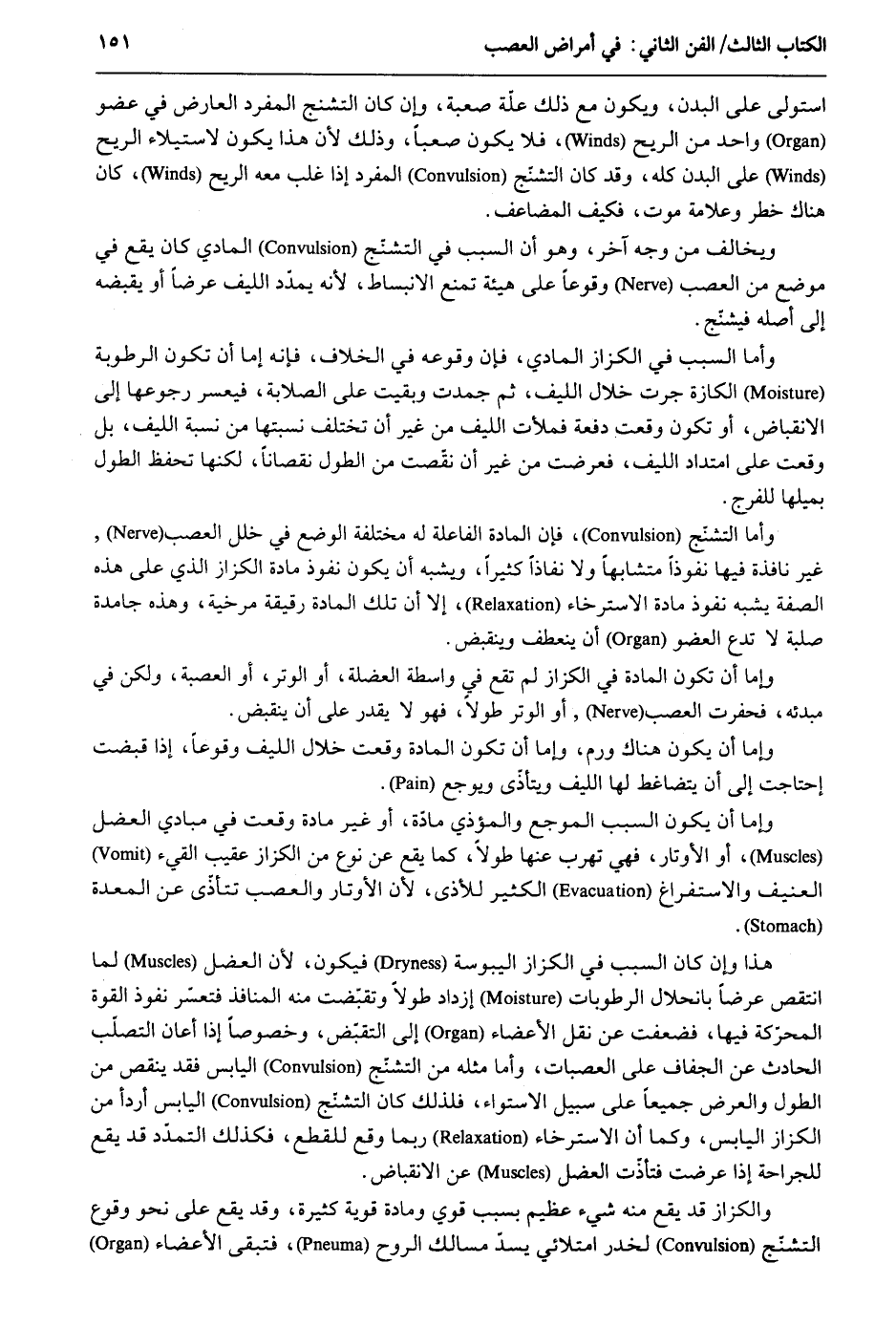 استولى على الْبدن وَيكون مَعَ ذَلِك عِلّة صعبة وَإِن كَانَ التشنج الْمُفْرد الْعَارِض فِي عُضْو وَاحِد من الرّيح فَلَا يكون صعباً وَذَلِكَ لِأَن هَذَا يكون لاستيلاء الرّيح على الْبدن كُله وَقد كَانَ التشنج الْمُفْرد إِذا غلب مَعَه الرّيح كَانَ هُنَاكَ خطر وعلامة موت فَكيف المضاعف. وَيُخَالف من وَجه آخر وَهُوَ أَن السَّبَب فِي التشنج المادي كَانَ يَقع فِي مَوضِع من العصب وقوعاً على هَيْئَة تمنع الانبساط لِأَنَّهُ يمدد الليف عرضا أَو يقبضهُ إِلَى أَصله فيشنج. وَأما السَّبَب فِي الكزاز المادي فَإِن وُقُوعه فِي الْخلاف فَإِنَّهُ إِمَّا أَن تكون الرطربة الكازة جرت خلال الليف ثمَّ جمدت وَبقيت على الصلابة فيعسر رُجُوعهَا إِلَى الانقباض أَو تكون وَقعت دفْعَة فملأت الليف من غير أَن تخْتَلف نسبتها من نِسْبَة الليف بل وَقعت على امتداد الليف فعرضت من غير أَن نقصت من الطول نُقْصَانا لَكِنَّهَا تحفظ الطول بميلها لِلْفَرجِ. وَأما التشنج فَإِن الْمَادَّة الفاعلة لَهُ مُخْتَلفَة الْوَضع فِي خلل العصب غير نَافِذَة فِيهَا نفوذاً متشابهاً وَلَا نفاذاً كثيرا وَيُشبه أَن يكون نُفُوذ مَادَّة الكزاز الَّذِي على هَذِه الصّفة يشبه نُفُوذ مَادَّة الاسترخاء إِلَّا أَن تِلْكَ الْمَادَّة رقيقَة مرخية وَهَذِه جامدة صلبة لَا تدع الْعُضْو أَن يَنْعَطِف وَإِمَّا أَن تكون الْمَادَّة فِي الكزاز لم تقع فِي وَاسِطَة العضلة أَو الْوتر أَو الْعصبَة وَلَكِن فِي مبدئه فحفرت العصب أَو الْوتر طولا فَهُوَ لَا يقدر على أَن ينقبض. وَإِمَّا أَن يكون هُنَاكَ ورم وَإِمَّا أَن تكون الْمَادَّة وَقعت خلال الليف وقوعاً إِذا قبضت احْتَاجَت إِلَى أَن يتضاغط لَهَا الليف ويتأذى ويوجع. وَإِمَّا أَن يكون السَّبَب الموجع والمؤذي مادّة أَو غير مَادَّة وَقعت فِي مبادي العضل أَو الأوتار فَهِيَ تهرب عَنْهَا طولا كَمَا يَقع عَن نوع من الكزاز عقيب الْقَيْء العنيف والاستفراغ الْكثير للأذى لِأَن الأوتار والعصب تتأذّى عَن الْمعدة. هَذَا وَإِن كَانَ السَّبَب فِي الكزاز اليبوسة فَيكون لِأَن العضل لما انْتقصَ عرضا بانحلال الرطوبات ازْدَادَ طولا وتقبّضت مِنْهُ المنافذ فتعسّر نُفُوذ الْقُوَّة المحرّكة فِيهَا فضعفت عَن نقل الْأَعْضَاء إِلَى التقبّض وخصوصاً إِذا أعَان التصلّب الْحَادِث عَن الْجَفَاف على الْعَصَبَات وَأما مثله من التشنّج الْيَابِس فقد ينقص من الطول وَالْعرض جَمِيعًا على سَبِيل الاسْتوَاء فَلذَلِك كَانَ التشنّج الْيَابِس أردأ من الكزاز الْيَابِس وكما أَن الاسترخاء رُبمَا وَقع للْقطع فَكَذَلِك التمدّد قد يَقع للجراحة إِذا عرضت فتأذّت العضل عَن الانقباض. والكزاز قد يَقع مِنْهُ شَيْء عَظِيم بِسَبَب قوي ومادة قَوِيَّة كَثِيرَة وَقد يَقع على نَحْو وُقُوع التشنج لخدر امتلائي يسدّ مسالك الرّوح فَتبقى الْأَعْضَاء