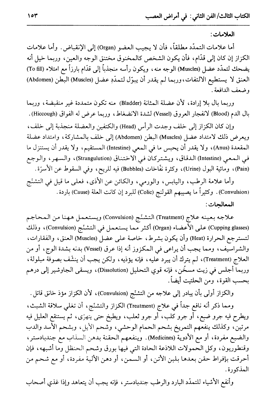 العلامات أما عَلَامَات التمدّد مُطلقًا فَأن لَا يُجيب الْعُضْو إِلَى الانقباض. وَأما عَلَامَات الكزاز إِن كَانَ إِلَى قُدَّام فَأن يكون الشَّخْص كالمخنوق مختنق الْوَجْه وَالْعين وَرُبمَا خيل أَنه يضْحك لتمدد عضل الْوَجْه مِنْهُ وَيكون رَأسه منجذباً إِلَى قُدَّام بارزاً مَعَ امتلاء الْعُنُق لَا يَسْتَطِيع الِالْتِفَات وَرُبمَا لم يقدر أَن ببول لتمددِ عضل الْبَطن وَضعف الدافعة. وَرُبمَا بَال بِلَا إِرَادَة لِأَن عضلة المثانة مِنْهُ تكون متمددة غير منقبضة وَرُبمَا بَال الدَّم لأنفجار الْعُرُوق لشدَّة الانضغاط وَرُبمَا عرض لَهُ الفواق. وَإِن كَانَ الكزاز إِلَى خلف وجدت الرَّأْس والكتفين والعضلة منجذبة إِلَى خلف ويعرض ذَلِك لامتداد عضل الْبَطن إِلَى خلف بالمشاركة وامتداد عضلة المقعدة وَلَا يقدر أَن يحبس مَا فِي المعي الْمُسْتَقيم وَلَا يقدر أَن يسْتَنْزل مَا فِي المعي الدقاق ويشتركان فِي الاختناق والسهر والوجع ومائية الْبَوْل وَكَثْرَة نفاخات فِيهِ للريح وَفِي السُّقُوط عَن الأسرّة. وَأما عَلامَة الرطب واليابس والورمي والكائن عَن الْأَذَى فعلى مَا قيل فِي التشنّج. وَكَثِيرًا مَا يصيبهم القولنج للبرد إِن كَانَت الْعلَّة بَارِدَة. المعالجات: علاجه بِعَيْنِه علاج التشنّج وَيسْتَعْمل هَهُنَا من المحاجم على الْأَعْضَاء أَكثر مِمَّا يسْتَعْمل فِي التشنج وَذَلِكَ لتسترجع الْحَرَارَة وَأَن يكون بِشَرْط خَاصَّة على عضل الْعُنُق والفقارات والشراسيف وَمِمَّا يجب أَن يُرَاعى فِي المكزوز أَنه إِذا عرق بَدَنَة بِشدَّة الوجع أَو من العلاج لم يتْرك أَن يبرد عَلَيْهِ فَإِنَّهُ يُؤْذِيه وَلَكِن يجب أَن ينشّف بصوفة مبلولة وَرُبمَا أَجْلِس فِي زَيْت مسخن فَإِنَّهُ قوي التَّحْلِيل ويسقى الجاوشير إِلَى دِرْهَم بِحَسب الْقُوَّة وَمن الحلتيت أَيْضا. والكزاز أولى بِأَن يُبَادر إِلَى علاجه من التشنج لِأَن الكزاز مؤذ خانق قَاتل. وَمِمَّا ذكر أَنه نَافِع جدا فِي علاج الكزاز والتشنج أَن تغلي سلاقة الشبث ويطرح فِيهِ جرو ضبع أَو جرو كلب أَو جرو ثَعْلَب ويطبخ حَتَّى يتهرى ثمَّ يستنقع العليل فِيهِ مرَّتَيْنِ وَكَذَلِكَ يَنْفَعهُمْ التمريخ شَحم الْحمام الوحشي وشحم الأيل وبشحم الْأسد والدب والضبع مُفْردَة أَو مَعَ الْأَدْوِيَة. وينفعهم الحقنة بدهن السذاب مَعَ جندبادستر وقنطوريون وكل الحمولات اللاذعة الحادة الَّتِي فِيهَا بورق وشحم الحنظل وَمَا أشبهه فَإِن أحرقت بإفراط حقن بعْدهَا بِلَبن الأتن أَو السّمن أَو دهن الألية مُفْردَة أَو مَعَ شَحم من الْمَذْكُورَة. وأنفع الْأَشْيَاء للتمدد الْبَارِد وَالرّطب جندبادستر فَإِنَّهُ يجب أَن يتَعَاهَد وَإِذا غذي أَصْحَاب