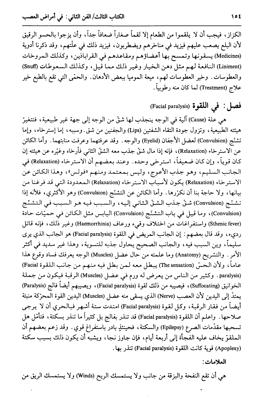 الكزاز فَيجب أَن لَا يلقموا من الطَّعَام إِلَّا لقماً صغَارًا ضعافاً جدا وَأَن يزجوا بالحسو الرَّقِيق لِأَن البلع يصعب عَلَيْهِم فيزيد فِي مناخرهم ويضطربون فيزيد ذَلِك فِي علتهم وَقد ذكرنَا أدوية يسقونها وَيمْسَح بهَا أعضاؤهم ومقاعدهم فِي القراباذين وَكَذَلِكَ المروخات النافعة لَهُم مثل دهن الْخِيَار وَغير ذَلِك مِمَّا قيل وَكَذَلِكَ السعوطات والعطوسات. وَخير العطوسات لَهُم ميعة الموميا بِبَعْض الأدهان. والحمّى الَّتِي تقع بالطبع خير علاج لما كَانَ مِنْهُ رطوبياً. فصل فِي اللقوة هِيَ عِلّة آلية فِي الْوَجْه ينجذب لَهَا شقّ من الْوَجْه إِلَى جِهَة غير طبيعية فتتغير هَيئته الطبيعية وتزول جودة التقاء الشفتين والجفنين من شقّ. وَسَببه إِمَّا استرخاء وَإِمَّا تشنج لعضل الأجفان وَالْوَجْه. وَقد عرفتهما وَعرفت منابتهما. وَأما الْكَائِن عَن الاسترخاء فَإِنَّهُ إِذا مَال شقّ جذب مَعَه الشقّ الثَّانِي فأرخاه وغيّره عَن هَيئته إِن كَانَ قَوِيا وَإِن كَانَ ضَعِيفا استرخى وَحده. وَعند بَعضهم أَن الاسترخاء فِي الْجَانِب السَّلِيم وَهُوَ جذب الأعوج وَلَيْسَ بمعتمد وَمِنْهُم فولس وَهَذَا الْكَائِن عَن الاسترخاء يكون لأسباب الاسترخاء المعدودة الَّتِي قد فَرغْنَا من بَيَانهَا وَلَا حَاجَة بِنَا أَن نكرّرها. وَأما الْكَائِن عَن التشنّج وَهُوَ الأكثري فَلِأَنَّهُ إِذا تشنّج شقّ جذب الشق الثَّانِي إِلَيْهِ وَالسَّبَب فِيهِ هُوَ السَّبَب فِي التشنّج وَمَا قيل فِي بَاب التشنّج الْيَابِس مثل الْكَائِن فِي حميات حادة واستفراغات من اخْتِلَاف وقيء ورعاف وَغير ذَلِك فَإِنَّهُ قَاتل رَدِيء وَقد قَالَ بَعضهم: إِن الْجَانِب الْمَرِيض فِي اللقوة هُوَ الْجَانِب الَّذِي يرى سليما وَأَن السَّبَب فِيهِ والجانب الصَّحِيح يحاول جذبه للتسوية وَهَذَا غير سديد فِي أَكثر الْأَمر. والتشريح وَمَا عَلمته من حَال عضل الْوَجْه يعرفك فَسَاد وُقُوع هَذَا عَاما وَلِأَن الْحس يبطل مَعَه لمن بَطل فِيهِ مِنْهُم من جَانب اللقوة. وَكثير من النَّاس مَا يعرض لَهُ ورم فِي عضل الرَّقَبَة فَيكون من جملَة الخوانيق فَيُصِيبهُ من ذَلِك لقُوَّة ويصيبهم أَيْضا فالج يمتدّ إِلَى الْيَدَيْنِ لِأَن العصب الَّذِي يسقى مِنْهُ عضل الْيَدَيْنِ الْقُوَّة المحرّكة منبته أَيْضا من فقار الرَّقَبَة وكل لقُوَّة امتدت سِتَّة أشهر فبالحري أَن لَا يُرْجَى صَلَاحهَا. وَاعْلَم أَن اللقوة قد تنذر بفالج بل كثيرا مَا تنذر بسكتة فَتَأمل هَل تصحبها مُقَدمَات الصرع والسكتة فَحِينَئِذٍ بَادر باستفراغ قوي. وَقد زعم بَعضهم أَن الملقو يخَاف عَلَيْهِ الْفجأَة إِلَى أَرْبَعَة أَيَّام فَإِن جَاوز نجا وَيُشبه أَن يكون ذَلِك بِسَبَب سكتة قَوِيَّة كَانَت اللقوة تنذر بهَا. العلامات: هِيَ أَن تقع النفخة والبزقة من جَانب وَلَا يسْتَمْسك الرّيح وَلَا يسْتَمْسك الرِّيق من