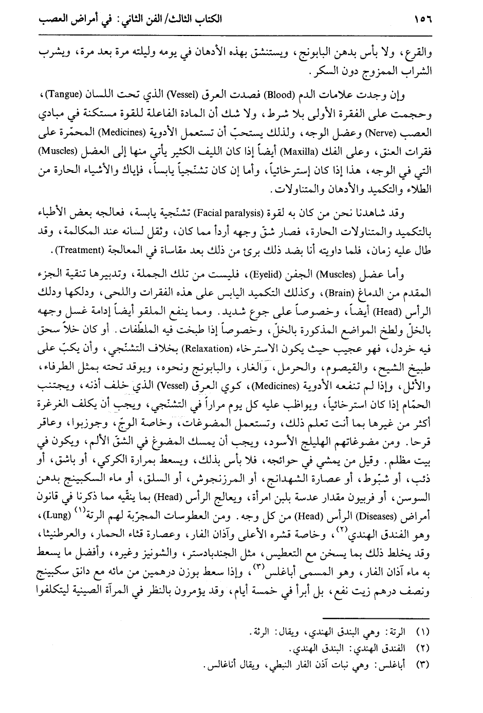 والقرع وَلَا بَأْس بدهن البابونج ويستنشق بِهَذِهِ الأدهان فِي يَوْمه وَلَيْلَته مرّة بعد مرّة وَيشْرب الشَّرَاب الممزوج دون السكر. وَإِن وجدت عَلَامَات الدَّم فصدت الْعرق الَّذِي تَحت اللِّسَان وحجمت على الْفَقْرَة الأولى بِلَا شَرط وَلَا شكّ أَن الْمَادَّة الفاعلة للقوة مستكنة فِي عبَادي العصب وعضل الْوَجْه وَلذَلِك يستحبّ أَن تسْتَعْمل الْأَدْوِيَة المحمّرة على فقرات الْعُنُق وعَلى الفك أَيْضا إِذا كَانَ الليف الْكثير يَأْتِي مِنْهَا إِلَى العضل الَّتِي فِي الْوَجْه هَذَا إِذا كَانَ استرخائياً وَأما إِن كَانَ تشنّجياً يَابسا فإياك والأشياء الحارة من الطلاء والتكميد والأدهان والمتناولات. وَقد شاهدنا نَحن من كَانَ بِهِ لقُوَّة تشنجية يابسة فعالجه بعض الْأَطِبَّاء بالتكميد والمتناولات المحارة فَصَارَ شقّ وَجهه أردأ مِمَّا كَانَ وَثقل لِسَانه عِنْد المكالمة وَقد طَال عَلَيْهِ زمَان فَلَمَّا داويته أَنا بضد ذَلِك برِئ من ذَلِك بعد مقاساة فِي المعالجة. وَأما عضل الجفن فَلَيْسَتْ من تِلْكَ الْجُمْلَة وتدبيرها تنقية الْجُزْء الْمُقدم من الدِّمَاغ وَكَذَلِكَ التكميد الْيَابِس على ِ هَذِه الفقرات واللحى ودلكها ودلك الرَّأْس أَيْضا وخصوصاً على جوع شَدِيد. وَمِمَّا ينفع الملقو أَيْضا إدامة غسل وَجهه بالخل ولطخ الْمَوَاضِع الْمَذْكُورَة بالخلّ وخصوصاً إِذا طبخ فِيهِ الملطفات. أَو كَانَ خلا سحق فِيهِ خَرْدَل فَهُوَ عَجِيب حَيْثُ يكون الاسترخاء بِخِلَاف التشنّجي وَأَن يكب على طبيخ الشيح والقيصوم والحرمل والغار والبابونج وَنَحْوه ويوقد تَحْتَهُ بِمثل الطرفاء والأثل وَإِذا لم يَنْفَعهُ الْأَدْوِيَة كوي الْعرق الَّذِي خلف أُذُنه ويجتنب الْحمام إِذا كَانَ استرخائياً ويواظب عَلَيْهِ كل يَوْم مرَارًا فِي التشنّجي وَيجب أَن يُكَلف الغرغرة أَكثر من غَيرهَا بِمَا أَنْت تعلم ذَلِك وتستعمل المضوغات وخاصة الوفي وجوزبوا وعاقر قرحا. وَمن مضوغاتهم الهليلج الْأسود وَيجب أَن يمسك المضوغ فِي الشق الْأَلَم وَيكون فِي بَيت مظلم. وَقيل من يمشي فِي حَوَائِجه فَلَا بَأْس بذلك ويسعط بمرارة الكركي أَو باشق أَو ذِئْب أَو شبوط أَو عصارة الشهدانج أَو الموزنجوش أَو السلق أَو مَاء السكبينج بدهن السوسن أَو فربيون مِقْدَار عدسة بِلَبن امْرَأَة ويعالج الرَّأْس بِمَا ينقيه مِمَّا ذكرنَا فِي قانون أمراض الرَّأْس من كل وَجه. وَمن العطوسات المجربة لَهُم الرتة وَهُوَ الفندق الْهِنْدِيّ وخاصة قشره الْأَعْلَى وآذان الفار وعصارة قثاء الْحمار والعرطنيثا وَقد يخلط ذَلِك بِمَا يسخن مَعَ التعطيس مثل الجندبادستر والشونيز وَغَيره وَأفضل مَا يسعط بِهِ مَاء آذان الفار وَهُوَ الْمُسَمّى أباغلس وَإِذا سعط بِوَزْن دِرْهَمَيْنِ من مَائه مَعَ دانق سكبينج وَنصف دِرْهَم زَيْت نفع بل أَبْرَأ فِي خَمْسَة أَيَّام وَقد يؤمرون بِالنّظرِ فِي الْمَرْأَة الصينية ليتكلفوا