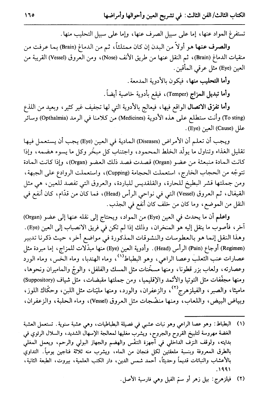 تستفرغ الْموَاد عَنْهَا إِمَّا على سَبِيل الصّرْف عَنْهَا وَإِمَّا على سَبِيل التحليب مِنْهَا. وَالصرْف عَنْهَا هُوَ أَولا من الْبدن إِن كَانَ ممتلئاً ثمَّ من الدِّمَاغ بِمَا عرفت من منقيات الدِّمَاغ ثمَّ النَّقْل عَنْهَا من طَرِيق الْأنف وَمن الْعُرُوق الْقَرِيبَة من الْعين مثل عرقي المأقين. وَأما التحليب مِنْهَا فَيكون بالأدوية المدمعة. وَأما تَبْدِيل المزاج فَيَقَع بأدوية خاصية أَيْضا. وَأما تفرق الِاتِّصَال الْوَاقِع فِيهَا فيعالج بالأدوية الَّتِي لَهَا تجفيف غير كثير وبعيد من اللذع وَأَنت ستطلع على هَذِه الْأَدْوِيَة من كلامنا فِي الرمد وَسَائِر علل الْعين. وَيجب أَن تعلم أَن الْأَمْرَاض المادية فِي الْعين يجب أَن يسْتَعْمل فِيهَا تقليل الْغذَاء وَتَنَاول مَا يُولد الْخَلْط الْمَحْمُود وَاجْتنَاب كل مبخر وكل مَا يسوء هضمه وَإِذا كَانَت الْمَادَّة منبعثة من عُضْو قصدت فصد ذَلِك الْعُضْو وَإِذا كَانَت الْمَادَّة تتَوَجَّه من الْحجاب الْخَارِج اسْتعْملت الْحجامَة واستعملت الرواح على الْجَبْهَة وَمن جُمْلَتهَا قشر الْبِطِّيخ للحارة والقلقديس للباردة وَالْعُرُوق الَّتِي تفصد للعين هِيَ مثل القيفال ثمَّ الْعُرُوق الَّتِي فِي نواحي الرَّأْس فَمَا كَانَ من قدّام كَانَ أَنْفَع فِي النَّقْل من الْموضع وَمَا كَانَ من خلف كَانَ أَنْفَع فِي الجذب. وَاعْلَم أَن مَا يحدث فِي الْعين من الْموَاد وَيحْتَاج إِلَى نَقله عَنْهَا إِلَى عُضْو آخر فأصوب مَا ينْقل إِلَيْهِ هُوَ المنخران وَذَلِكَ إِذا لم تكن فِي فريق الانصباب إِلَى الْعين. وَهَذَا النَّقْل إِنَّمَا هُوَ بالعطوسات والنشوقات الْمَذْكُورَة فِي مَوَاضِع أخر حَيْثُ ذكرنَا تَدْبِير أوجاع الرَّأْس. وأدوية الْعين مِنْهَا مبدلات للمزاج إِمَّا مبردة مثل عصارات عِنَب الثَّعْلَب وعصا الرَّاعِي وَهُوَ البطباط وَمَاء الهندبا وَمَاء الخس وَمَاء الْورْد وعصارته ولعاب بزر قطونا وَمِنْهَا مسخنات مثل الْمسك والفلفل والوج والماميران وَنَحْوهَا وَمِنْهَا مجففات مثل التوتيا والأثمد والإقليميا وَمن جُمْلَتهَا مقبضات مثل شياف ماميثا وَالصَّبْر والفيلزهرج والزعفران والورد وَمِنْهَا ملينات مثل اللَّبن وحكاك اللوز وَبَيَاض الْبيض واللعاب وَمِنْهَا منضجّات مثل الْعُرُوق وَمَاء الخلبة والزعفران
