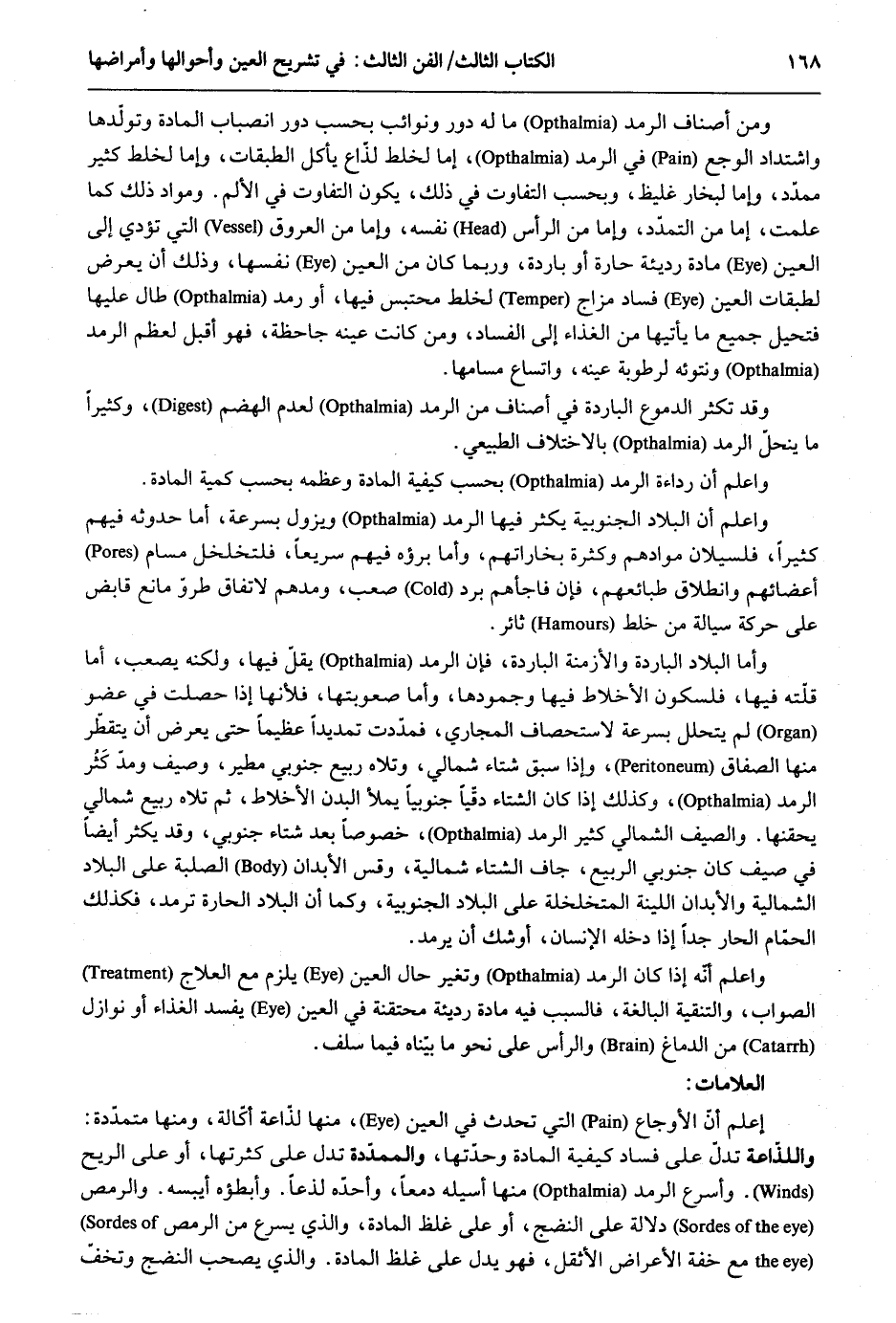 وَمن أَصْنَاف الرمد مَا يتبع الجرب فِي الْعين وَيكون السَّبَب فِيهِ خدشة للعين وَهُوَ يجْرِي فِي أول الْأَمر مجْرى التكدر وَإِنَّمَا يَتَأَتَّى علاجه بعد حكّ الجرب. وَأما الرمد بِالْجُمْلَةِ فَهُوَ ورم فِي الملتحمة فَمِنْهُ مَا هُوَ ورم بسيط غير مجاوز للحد فِي درور الْعُرُوق والسيلان والوجع وَمِنْه مَا هُوَ عَظِيم مجاوز للحد فِي الْعظم يَرْبُو فِيهِ الْبيَاض على الحدقة فيغطيها وَيمْنَع التغميض وَيُسمى كيموسيس وَيعرف عندنَا بالوردينج. وَكَثِيرًا مَا يعرض للصبيان بِسَبَب كَثْرَة موادهم وَضعف أَعينهم وَلَيْسَ يكون عَن مَادَّة حارة فَقَط بل وَعَن البلغمية والسوداوية وَلما كَانَ الرمد الْحَقِيقِيّ ورماً فِي الحدقة بل الملتحمة وكل ورم إِمَّا أَن يكون عَن دم أَو صفراء أَو بلغم أَو سَوْدَاء أَو ريح فَكَذَلِك الرمد لَا يَخْلُو سَببه عَن أحد هَذِه الْأَسْبَاب وَرُبمَا كَانَ الْخَلْط الموزم متولّداً فِيهَا وَرُبمَا كَانَ صائراً إِلَيْهَا من الدِّمَاغ على سَبِيل النزلة من طَرِيق الْحجاب الْخَارِج المجلّل للرأس أَو من طَرِيق الْحجاب الدَّاخِل وَبِالْجُمْلَةِ من الدِّمَاغ ونواحيه فَإِنَّهُ إِذا اجْتمع فِي الدِّمَاغ مواد كَثِيرَة وامتلاء فأقمن بِالْعينِ أَن ترمد إِلَّا أَن تكون قَوِيَّة جدا وَرُبمَا كَانَت الشرايين هِيَ الَّتِي تصمت إِلَيْهَا فضولها إِذا كَانَت الفضول تكْثر فِيهَا سَوَاء كَانَت الشرايين من الدَّاخِلَة أَو الْخَارِجَة. وَرُبمَا لم تكن الْمَادَّة صائرة إِلَيْهَا من نَاحيَة الدِّمَاغ وَالرَّأْس بل تكون صائرة إِلَيْهَا من الْأَعْضَاء الْأُخْرَى وخصوصاً إِذا كَانَت الْعين قد لحقها سوء مزاج وأضعفها وَجعلهَا قَابِلَة للآفات وَهِي الَّتِي تصب إِلَيْهَا تِلْكَ الفضول. وَمن أَصْنَاف الرمد مَا لَهُ دور ونوائب بِحَسب دور انصباب الْمَادَّة ولولدها واشتداد الوجع فِي الرمد إِمَّا لخلط لذّاع يَأْكُل الطَّبَقَات وَإِمَّا لخلط كثير ممدّد وَإِمَّا لبخار غليظ وبحسب التَّفَاوُت فِي ذَلِك يكن التَّفَاوُت فِي الْأَلَم. ومواد ذَلِك كَمَا علمت إِمَّا من التمدد وَإِمَّا من الرَّأْس نَفسه وَإِمَّا من الْعُرُوق الَّتِي تُؤدِّي إِلَى الْعين مَادَّة رَدِيئَة حارة أَو بَارِدَة وَرُبمَا كَانَ من الْعين نَفسهَا وَذَلِكَ أَن يعرض لطبقات الْعين فَسَاد مزاج لخلط محتبس فِيهَا أَو رمد طَال عَلَيْهَا فتحيل جَمِيع مَا يَأْتِيهَا من الْغذَاء إِلَى الْفساد وَمن كَانَت عينه جاحظة فَهُوَ أقبل لعظم الرمد ونتوئه لرطوبة عينه واتساع مسامها. وَقد تكْثر الدُّمُوع الْبَارِدَة فِي أَصْنَاف من الرمد لعدم الهضم وَكَثِيرًا مَا ينحلّ الرمد بالاختلاف الطبيعي. وَاعْلَم أَن رداءة الرمد بِحَسب كَيْفيَّة الْمَادَّة وعظمه بِحَسب كمية الْمَادَّة. وَاعْلَم أَن الْبِلَاد الجنوبية يكثر فِيهَا الرمد وَيَزُول بِسُرْعَة أما حُدُوثه فيهم كثيرا فلسيلان موادهم وَكَثْرَة بخاراتهم وَأما بُرْؤُهُ فيهم سَرِيعا فلتخلخل مسام أعضائهم وانطلاق طبائعهم فَإِن فاجأهم برد صَعب ومدهم لِاتِّفَاق طرُو مَانع قَابض على حَرَكَة سيالة من خلط ثَائِر. وَأما الْبِلَاد الْبَارِدَة والأزمنة الْبَارِدَة فَإِن الرمد يقل فِيهَا وَلكنه يصعب أما قلته فِيهَا فلسكون الأخلاط فِيهَا وجمودها وَأما صعوبتها فَلِأَنَّهَا إِذا حصلت فِي عُضْو لم يتَحَلَّل بِسُرْعَة لاستحصاف المجاري فمددت تمديداً عَظِيما حَتَّى يعرض أَن يتقطر مِنْهَا الصفاق وَإِذا سبق شتاء شمَالي وتلاه ربيع جنوبي مطير وصيف وَمد كَثُر الرمد وَكَذَلِكَ إِذا كَانَ الشتَاء دقياً جنوبياً يمْلَأ الْبدن الأخلاط ثمَّ تلاه ربيع شمَالي يحقنه. والصيف الشمالي كثير الرمد خُصُوصا بعد شتاء جنوبي وَقد يكثر أَيْضا فِي صيف كَانَ جنوبي الرّبيع جَاف الشتَاء شمالية وَقس الْأَبدَان الصلبة على الْبِلَاد الشمالية والأبدان اللينة المتخلخلة على الْبِلَاد 