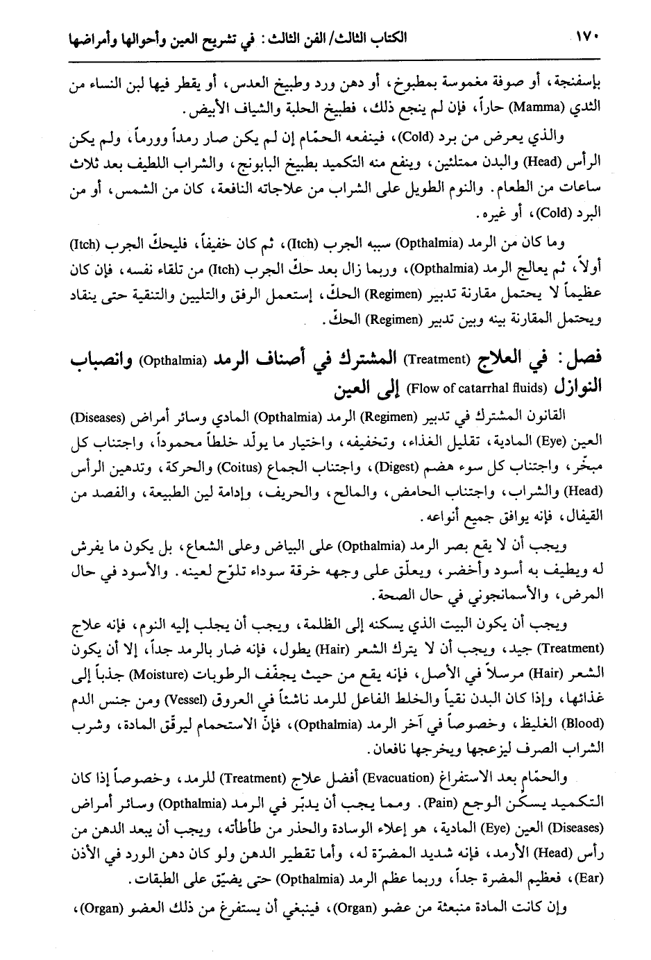 بإسفنجة أَو صوفة مغموسة بمطبوخ أَو دهن ورد وطبيخ العدس أَو يقطر فِيهَا لبن النِّسَاء من الثدي حاراً فَإِن لم ينجع ذَلِك فطبيخ الحلبة والشياف الْأَبْيَض. وَالَّذِي يعرض من برد فينفعه الحمّام إِن لم يكن صَار رمداً وورماً وَلم يكن الرَّأْس وَالْبدن ممتلئين وينفع مِنْهُ التكميد بطبيخ البابونج وَالشرَاب اللَّطِيف بعد ثَلَاث سَاعَات من الطَّعَام. وَالنَّوْم الطَّوِيل على الشَّرَاب من علاجاته النافعة كَانَ من الشَّمْس أَو من الْبرد أَو غَيره. وَمَا كَانَ من الرمد سَببه الجرب ثمَّ كَانَ خَفِيفا فليحك الجرب أَولا ثمَّ يعالج الرمد وَرُبمَا زَالَ بعد حكّ الجرب من تِلْقَاء نَفسه فَإِن كَانَ عَظِيما لَا يحْتَمل مُقَارنَة تَدْبِير الحك اسْتعْمل الرِّفْق والتليين والتنقية حَتَّى ينقاد وَيحْتَمل الْمُقَارنَة بَينه وَبَين تَدْبِير الحك. فصل فِي العلاج الْمُشْتَرك فِي أَصْنَاف الرمد وانصباب النَّوَازِل إِلَى الْعين القانون الْمُشْتَرك فِي تَدْبِير الرمد المادي وَسَائِر أمراض الْعين المادية تقليل الْغذَاء وتخفيفه وَاخْتِيَار مَا يولّد خلطاً مَحْمُودًا وَاجْتنَاب كل مبخّر وَاجْتنَاب كل سوء هضم وَاجْتنَاب الْجِمَاع وَالْحَرَكَة وتدهين الرَّأْس وَالشرَاب وَاجْتنَاب الحامض والمالح والحريف وإدامة لين الطبيعة والفصد من القيفال فَإِنَّهُ يُوَافق جَمِيع أَنْوَاعه. وَيجب أَن لَا يَقع بصر الرمد على الْبيَاض وعَلى الشعاع بل يكون مَا يفوش لَهُ ويطيف بِهِ أسود وأخضر ويعلق على وَجهه خرقَة سَوْدَاء تلوح لعَينه. وَالْأسود فِي حَال الْمَرَض والأسمانجوني فِي حَال الصِّحَّة. وَيجب أَن يكون الْبَيْت الَّذِي يسكنهُ إِلَى الظلمَة وَيجب أَن يجلب إِلَيْهِ النّوم فَإِنَّهُ علاج جيد وَيجب أَن لَا يتْرك الشّعْر يطول فَإِنَّهُ ضار بالرمد جدا إِلَّا أَن يكون الشّعْر مُرْسلا فِي الأَصْل فَإِنَّهُ يَقع من حَيْثُ يجفف الرطوبات جذباً إِلَى غذائها وَإِذا كَانَ الْبدن نقياً والخلط الْفَاعِل للرمد ناشئاً فِي الْعُرُوق وَمن جنس الدَّم الغليظ وخصوصاً فِي تَخِر الرمد فَإِن الاستحمام ليرقق الْمَادَّة وَشرب الشَّرَاب الصّرْف ليزعجها ويخرجها نافعان وَالْحمام بعد الاستفراغ أفضل علاج للرمد وخصوصاً إِذا كَانَ التكميد يسكن الوجع وَمِمَّا يجب أَن يدبر فِي الرمد وَسَائِر أمراض الْعين المادية هُوَ إعلاء الوسادة والحذر من طأطأته وَيجب أَن يبعد الدّهن من رَأس الأرمد فَإِنَّهُ شَدِيد الْمضرَّة لَهُ وَأما تقطير الدّهن وَلَو كَانَ دهن الْورْد فِي وَإِن كَانَت الْمَادَّة منبعثة من عُضْو فَيَنْبَغِي أَن يستفرغ من ذَلِك الْعُضْو