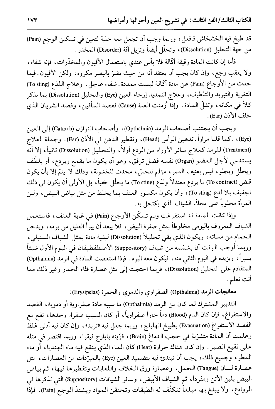 قد طبخ فِيهِ الخشخاش فافعل وَرُبمَا وَجب أَن تجْعَل مَعَه حلبة لتعين فِي تسكين الوجع من جِهَة التَّحْلِيل وتحلّل أَيْضا وتزيل آفَة المخدر. فَأَما إِن كَانَت الْمَادَّة رقيقَة أكالة فَلَا بَأْس عِنْدِي بِاسْتِعْمَال الأفيون والمخدرات فَإِنَّهُ شِفَاء وَلَا يعقب وجعاً وَإِن كَانَ يجب أَن يعْتَقد أَنه من حَيْثُ يضر بالبصر مَكْرُوه وَلَكِن الأفيون فِيمَا حدث من الأوجاع عَن مَادَّة أكّالة لَيست ممددة شِفَاء عَاجل. وعلاج اللذع التغرية والتبريد والتلطيف وعلاج التمديد إرخاء الْعين والتحليل بِمَا نذْكر كلاّ فِي مَكَانَهُ وتقل الْمَادَّة. وَإِذا أزمنت الْعلَّة ففصد المأقين وفصد الشريان الَّذِي خلف الْأذن. وَيجب أَن يجْتَنب أَصْحَاب الرمد وَأَصْحَاب النَّوَازِل إِلَى الْعين - كَمَا. قُلْنَا مرَارًا - تدهين الرَّأْس وتقطير الدّهن فِي الْأذن. وَجُمْلَة العلاج للرمد كعلاج سَائِر الأورام من الردع أَولا والتحليل ثَانِيًا إِلَّا أَنه يَسْتَدْعِي لأجل الْعُضْو نَفسه فضل ترفق وَهُوَ أَن يكون مَا يقمع ويردع أَو يلطف ويحلّل ويجلو لَيْسَ بعنيف الْمَمَر مؤلم للحس مُحدث للخشونة وَذَلِكَ لَا يتم إِلَّا بِأَن يكون قبض مَا يردع معتدلاً ولذع مَا يحلل خفِيا بل الأولى أَن يكون فِي ذَلِك تجفيف بِلَا لذع وَأَن يكون مكسور العنف بِمَا يخلط من مثل بَيَاض الْبيض وَلبن الْمَرْأَة محلوباً على محك الشيافِ الَّذِي وَإِذا كَانَت الْمَادَّة قد استفرغت وَلم تسكّن الأوجاع فِي غَايَة العنف فَاسْتعْمل الشياف الْمَعْرُوف باليومي مخلوطاً بِمثل صفرَة الْبيض فَلَا يبعد أَن يبرأ العليل من يَوْمه وَيدخل الْحمام من مسائه وَيكون الَّذِي بَقِي تَحْلِيل لبَقيَّة مَادَّة بِمثل الشياف السنبلي وَرُبمَا أوجب الْوَقْت أَن يشمّمه من شياف الأصطفطيقان فِي الْيَوْم الأول شَيْئا يَسِيرا ويزيده فِي الْيَوْم الثَّانِي مِنْهُ فَيكون مَعَه الْبُرْء. فَإِذا اسْتَعْصَتْ الْمَادَّة فِي الرمد المتقادم على التَّحْلِيل فَرُبمَا احتجت إِلَى مثل عصارة قثّاء الْحمار وَغير ذَلِك مِمَّا أَنْت تعلم. معالجات الرمد الصفراوي والدموي والحمرة: التَّدْبِير الْمُشْتَرك لما كَانَ من الرمد مَا سَببه مَادَّة صفراوية أَو دموية الفصد والاستفراغ فَإِن كَانَ الدَّم دَمًا حاراً صفراوياً أَو كَانَ السَّبَب صفراء وَحدهَا نفع مَعَ الفصد الاستفراغ بطبيخ الهليلج وَرُبمَا جعل فِيهِ تَرَبد وَإِن كَانَ فِيهِ أدنى غلظ وَعلمت أَن الْمَادَّة متشربة فِي حجب الدِّمَاغ قوّيته بأيارج فيقرا وَرُبمَا اقْتصر فِي مثله على نَقِيع الصَّبْر. وَإِن كَانَ هُنَاكَ حرارة كَانَ المَاء الَّذِي ينقع فِيهِ مَاء الهندبا أَو مَاء الْمَطَر وَجَمِيع ذَلِك يجب أَن تبتدئ فِيهِ بتضميد الْعين بالمبرّدات من انعصارات مثل عصارة لِسَان الْحمل وعصارة ورق الْخلاف واللعابات وتقطيرها فِيهَا ثمَّ بَيَاض الْبيض بِلَبن الأتن ومفرداً ثمَّ الشياف الْأَبْيَض وَسَائِر الشيافات الَّتِي نذكرها فِي الروادع وَلَا يبلغ بهَا مبلغا تتكثِّف لَهُ الطَّبَقَات وتحتقن الْموَاد ويشتدّ الوجع. فَإِذا