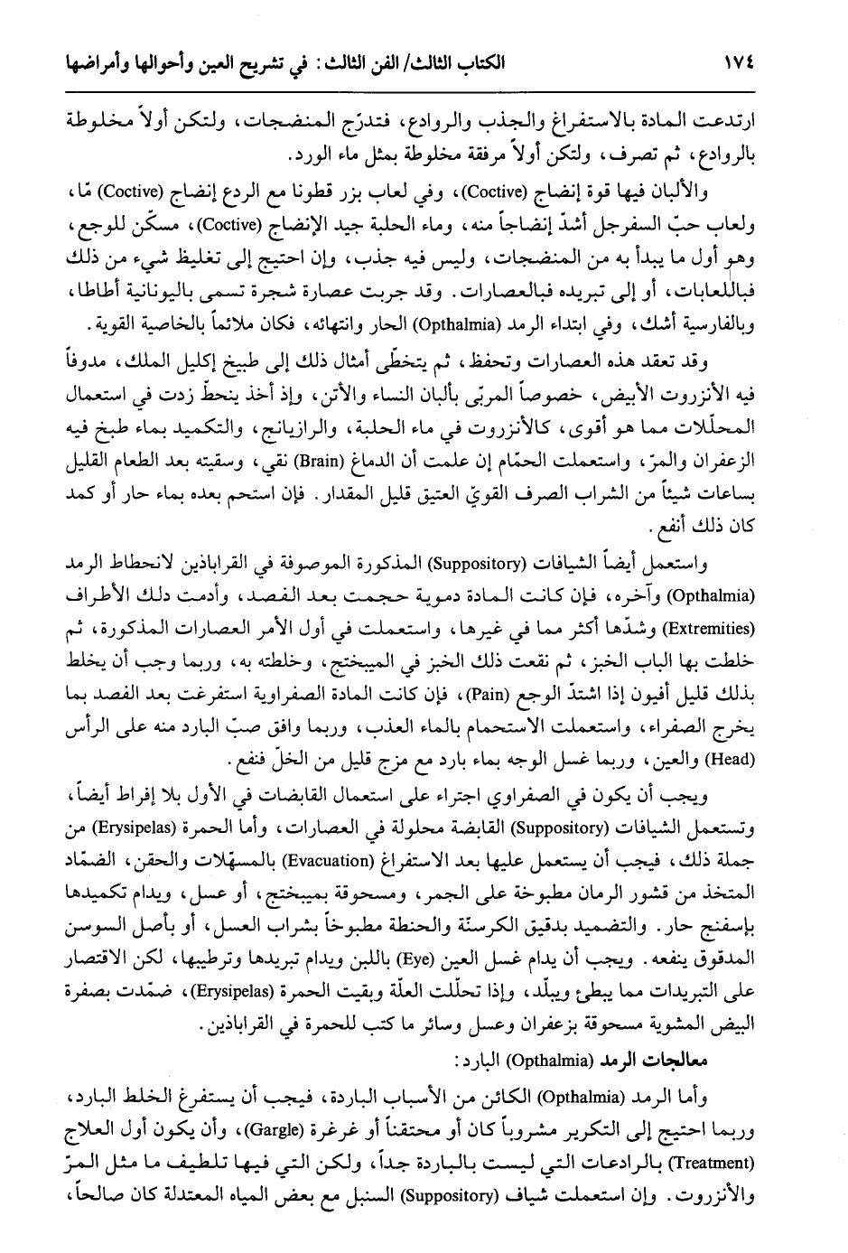 ارتدعت الْمَادَّة بالاستفراغ والجذب والرواح فتمرّج المنضجات ولتكن أَولا مخلوطة بالرواح ثمَّ تصرف ولتكن أَولا مرفقة مخلوطة بِمثل مَاء الْورْد. والألبان فِيهَا قُوَّة انضاج وَفِي لعاب بزر قطونا مَعَ الردع انضاج مّا ولعاب حبّ السفرجل أشدّ إنضاجاً مِنْهُ وَمَاء الحلبة جيد الإنضاج مسكّن للوجع وَهُوَ أول يبْدَأ بِهِ من المنضجات وَلَيْسَ فِيهِ جذب وَإِن احْتِيجَ إِلَى تَغْلِيظ شَيْء من ذَلِك فبالعابات أَو إِلَى تبريده فبالعصارات. وَقد جربت عصارة شَجَرَة تسمى باليونانية أطاطا وبالفارسية أَشك وَفِي ابْتِدَاء الرمد الْحَار وانتهائه فَكَانَ ملائماً بالخاصية القوية. وَقد تعقد هَذِه العصارات وَتحفظ ثمَّ يتخطّى أَمْثَال ذَلِك إِلَى طبيخ إكليل الْملك مدوفاً فِيهِ الأنزروت الْأَبْيَض خُصُوصا المربّى بألبان النِّسَاء والأتن وَإِذ أَخذ ينحطّ زِدْت فِي اسْتِعْمَال المحلّلات مِمَّا هُوَ أقوى كالأنزروت فِي مَاء الحلبة والرازيانج والتكميد بِمَاء طبخ فِيهِ الزَّعْفَرَان والمرّ واستعملت الحمّام إِن علمت أَن الدِّمَاغ نقي وسقيته بعد الطَّعَام الْقَلِيل بساعات شَيْئا من الشَّرَاب انْصَرف القويّ الْعَتِيق قَلِيل الْمِقْدَار. فَإِن استحم بعده بِمَاء حَار أَو كمد كَانَ ذَلِك أَنْفَع. وَاسْتعْمل أَيْضا الشيفات الْمَذْكُورَة الموصوفة فِي القراباذين لانحطاط الرمد وَآخره فَإِن كَانَت الْمَادَّة دموية حجمت بعد الفصد وأدمت دلك الْأَطْرَاف وشدها أَكثر مِمَّا فِي غَيرهَا واستعملت فِي أول الْأَمر العصارات الْمَذْكُورَة ثمَّ خلطت بهَا ألباب الْخبز ثمَّ نقعت ذَلِك الْخبز فِي الميبختج وخلطته بِهِ وَرُبمَا وَجب أَن يخلط بذلك قَلِيل أفيون إِذا اشتدّ الوجع فَإِن كَانَت الْمَادَّة الصفراوي استفرغت بعد الفصد بِمَا يخرج الصَّفْرَاء واستعملت الاستحمام بِالْمَاءِ العذب وَرُبمَا وَافق صبّ الْبَارِد مِنْهُ على الرَّأْس وَالْعين وَرُبمَا غسل الْوَجْه بِمَاء بَارِد مَعَ مزج قَلِيل مَعَ الخلّ فنفع. وَيجب أَن يكون فِي الصفراوي اجتراء على اسْتِعْمَال القابضات فِي الأول بِلَا إفراط أَيْضا وَيسْتَعْمل الشيافات القابضة محلولة فِي العصارات وَأما الْحمرَة من جملَة ذَلِك فَيجب أَن يسْتَعْمل عَلَيْهَا بعد الاستفراغ بالمسهّلات والحقن الضمّاد الْمُتَّخذ من قشور الرُّمَّان مطبوخة على الْجَمْر ومسحوقة بميبختج أَو عسل ويدام تكميدها بإسفنج حَار. والتضميد بدقيق الكرسنّة وَالْحِنْطَة مطبوخاً بشراب الْعَسَل أَو بِأَصْل السوسن المدقوق يَنْفَعهُ. وَيجب أَن يدام غسل الْعين بِاللَّبنِ ويدام تبريدها وترطيبها لَكِن الِاقْتِصَار على التبريدات مِمَّا يبطئ ويبلّد وَإِذا تحلّلت العلّة وَبقيت الْحمرَة ضمدت بصفرة الْبيض المشوية مسحوقة بزعفران وَعسل وَسَائِر مَا كتب للحمرة فِي القراباذين. معالجات الرمد الْبَارِد: وَأما الرمد الْكَائِن من الْأَسْبَاب الْبَارِدَة فَيجب أَن يستفرغ الْخَلْط الْبَارِد وَرُبمَا احْتِيجَ إِلَى التكرير مشروباً كَانَ أَو محتقناً أَو غرغرة وَأَن يكون أول العلاج بالرادعات الَّتِي لَيست بالباردة جدا وَلَكِن الَّتِي فِيهَا تلطيف مَا مثل المر والأنزروت. وَإِن اسْتعْملت شياف السنبل مَعَ بعض الْمِيَاه المعتدلة كَانَ صَالحا