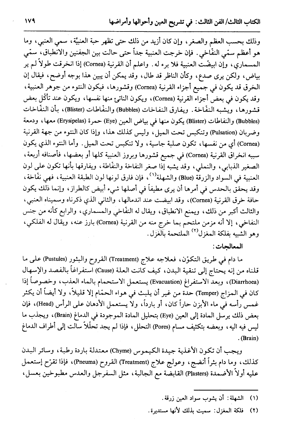 وَذَلِكَ بِحَسب الْعظم والصغر وَإِن كَانَ أَزِيد من ذَلِك حَتَّى تظهر حَبَّة العنبية سمي العنبي وَمَا هُوَ أعظم سمّي النفاخي. فَإِن خرجت العنبية جدا حَتَّى حَالَتْ بَين الجفنين والانطباق سمّي المسماري وَإِن ابْيَضَّتْ العنبية فَلَا برْء لَهُ. وَاعْلَم أَن القرنية إِذا انخرقت طولا لم ير بَيَاض وَلَكِن يرى صدع وَكَأن النَّاظر قد طَال وَقد يُمكن أَن يبين هَذَا بِوَجْه أوضح فَيُقَال أَن الْخرق قد يكون فِي جَمِيع أَجزَاء القرنية وقشورها فَيكون النتوء من جَوْهَر العنبية وَقد يكون فِي بعض أَجزَاء القرنية وَيكون الناتئ مِنْهَا نَفسهَا وَيكون عِنْد تَأْكُل بعض قشورها وَيُشبه النفّاخة. وَيُفَارق النفاخات والنفّاطات بِأَن النفاخات والنفاطات يكون مِنْهَا فِي بَيَاض الْعين حمرَة مَعهَا ودمعة وضربان وتنكبس تَحت الْميل وَلَيْسَ كَذَلِك هَذَا وَإِذا كَانَ النتؤ من جِهَة القرنية أَي من نَفسهَا تكون صلبة جاسية وَلَا تنكبس تَحت الْميل. وَأما النتوء الَّذِي يكون سَببه انخراق القرنية فِي جَمِيع قشورها وبروز العنبية كلهَا أَو بَعْضهَا فأصنافه أَرْبَعَة الصَّغِير الذبابي والنملي وَقد يشبه إِذا صغر النفاخة والنفّاطة ويفارقها بِأَنَّهَا تكون على لون العنبية فِي السوَاد والزرقة والشهلة فَإِن فَارق لَوْنهَا لون الطَّبَقَة العنبية فَهِيَ نفّاخة وَقد يُحَقّق بالحدس فِي أمرهَا أَن يرى مطيفاً فِي أَصْلهَا شَيْء أَبيض كالطراز وَإِنَّمَا ذَلِك يكون حافة خرق القرنية وَقد ابْيَضَّتْ عِنْد اندمالها وَالثَّانِي الَّذِي ذَكرْنَاهُ وسميناه العنبي وَالثَّالِث أكبر من ذَلِك وَيمْنَع الانطباق وَيُقَال لَهُ النفّاخي والمسماري وَالرَّابِع كَأَنَّهُ من جنس النفاخي إِلَّا أَنه مزمن ملتحم بِمَا خرج مِنْهُ من القرنية بارز عَنهُ وَيُقَال لَهُ الفلكي وَهُوَ الشبيه بفلكة المغزل الملتحمة بالغزل. المعالجات: مَا دَامَ فِي طَرِيق التكوّن فعلاجه علاج القروح والبثور على مَا قُلْنَاهُ من أَنه يحْتَاج إِلَى تنقية الْبدن كَيفَ كَانَت الْعلَّة استفراغاً بالفصد والإسهال وَبعد الاستفراغ يسْتَعْمل الاستحمام بِالْمَاءِ العذب وخصوصاً إِذا كَانَ فِي المزاج حِدة من غير أَن يلبث فِي هَوَاء الْحمام إِلَّا قَلِيلا وَلَا أَيْضا أَن يكثر غمس رَأسه فِي مَاء الإبزن حاراً كَانَ أَو بَارِدًا وَلَا يسْتَعْمل الأدهان على الرَّأْس فَإِن بعض ذَلِك يُرْسل الْمَادَّة إِلَى الْعين بتحليل الْمَادَّة الْمَوْجُودَة فِي الدِّمَاغ ويجذب مَا لَيْسَ فِيهِ إِلَيْهِ وَبَعضه بتكثيف مسام التَّحَلُّل فَإِذا لم يجد تحللاً سَالَتْ إِلَى أَطْرَاف الدِّمَاغ. وَيجب أَن تكون الأغذية جَيِّدَة الكيموس معتدلة بَارِدَة رطبَة وَسَائِر الْبدن كَذَلِك وَمَا دَامَ بثراً أنضج وعولج علاج القروح فَإِذا تقرح اسْتعْمل عَلَيْهِ أَولا الأضمدة القابضة مَعَ الجالبة مثل السفرجل والعدس مطبوخين بِعَسَل