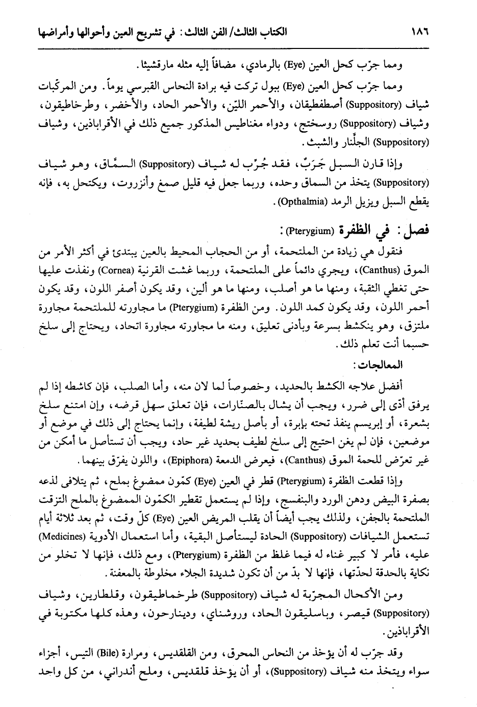 وَمِمَّا جرّب كحل الْعين ببول ترك فِيهِ برادة النّحاس القبرسي يَوْمًا. وَمن المركّبات شياف أصطفطيقان والأحمر الليّن والأحمر الحاد والأخضر وطرخاطيقون وشياف روسختج ودواء مغناطيس الْمَذْكُور جَمِيع ذَلِك فِي الأقراباذين وشياف الجلنار والشبث. وَإِذا قَارن السبل جَرب فقد جُرّب لَهُ شياف السماق وَهُوَ شياف يتَّخذ من السماق وَحده وَرُبمَا جعل فِيهِ قَلِيل صمغ وأنزروت ويكتحل بِهِ فَإِنَّهُ يقطع السبل ويزيل الرمد. فصل فِي الظفرة فَنَقُول هِيَ زِيَادَة من الملتحمة أَو من الْحجاب الْمُحِيط بِالْعينِ يَبْتَدِئ فِي أَكثر الْأَمر من الموق وَيجْرِي دَائِما على الملتحمة وَرُبمَا غشت القرنية ونفذت عَلَيْهَا حَتَّى تغطي الثقبة وَمِنْهَا مَا هُوَ أَصْلَب وَمِنْهَا مَا هُوَ أَلين وَقد يكون أصفر اللَّوْن وَقد يكون أَحْمَر اللَّوْن وَقد يكون كمد اللَّوْن. وَمن الظفرة مَا مجاورته للملتحمة مجاورة ملتزق وَهُوَ ينكشط بِسُرْعَة وبأدنى تَعْلِيق وَمِنْه مَا مجاورته مجاورة اتِّحَاد وَيحْتَاج إِلَى سلخ حَسْبَمَا أَنْت تعلم ذَلِك. المعالجات: أفضل علاجه الكشط بالحديد وخصوصاً لما لَان مِنْهُ وَأما الصلب فَإِن كاشطه إِذا لم يرفق أدّى إِلَى ضَرَر وَيجب أَن يشال بالصنارات فَإِن تعلق سهل قرضه وَإِن امْتنع سلخ بشعرة أَو إبريسم ينفذ تَحْتَهُ بإبرة أَو بِأَصْل ريشة لَطِيفَة وَإِنَّمَا يحْتَاج إِلَى ذَلِك فِي مَوضِع أَو موضِعين فَإِن لم يغن احْتِيجَ إِلَى سلخ لطيف بحديد غير حاد ويجبَ أَن تستأصل مَا أمكن من غير تعرض للحمة الموق فَيعرض الدمعة واللون يفرق بَينهمَا. وَإِذا قطعت الظفرة قطر فِي الْعين كمون ممضوغ بملح ثمَّ يتلافى لذعه بصفرة الْبيض ودهن الْورْد والبنفسج وَإِذا لم يسْتَعْمل تقطير الكمون الممضوغ بالملح التزقت الملتحمة بالجفن وَلذَلِك يجب أَيْضا أَن يقلب الْمَرِيض الْعين كلّ وَقت ثمَّ بعد ثَلَاثَة أَيَّام يسْتَعْمل الشيافات الحادة ليستأصل الْبَقِيَّة وَأما اسْتِعْمَال الْأَدْوِيَة عَلَيْهِ فَأمر لَا كَبِير غناء لَهُ فِيمَا غلظ من الظفرة وَمَعَ ذَلِك فَإِنَّهَا لَا تَخْلُو من نكاية بالحدقة لحدتها فَإِنَّهَا لَا بُد من أَن تكون شَدِيدَة الْجلاء مخلوطة بالمعفنة. وَمن الأكحال المجربة لَهُ شياف طرخماطيقون وقلطارين وشياف قَيْصر وباسليقون الحاد وروشناي ودينارحون وَهَذِه كلهَا مَكْتُوبَة فِي الأقراباذين. وَقد جرب لَهُ أَن يُؤْخَذ من النّحاس المحرق وَمن القلقديس ومرارة التيس أَجزَاء سَوَاء ويتخذ مِنْهُ شياف أَو أَن يُؤْخَذ قلقديس وملح أندراني من كل وَاحِد