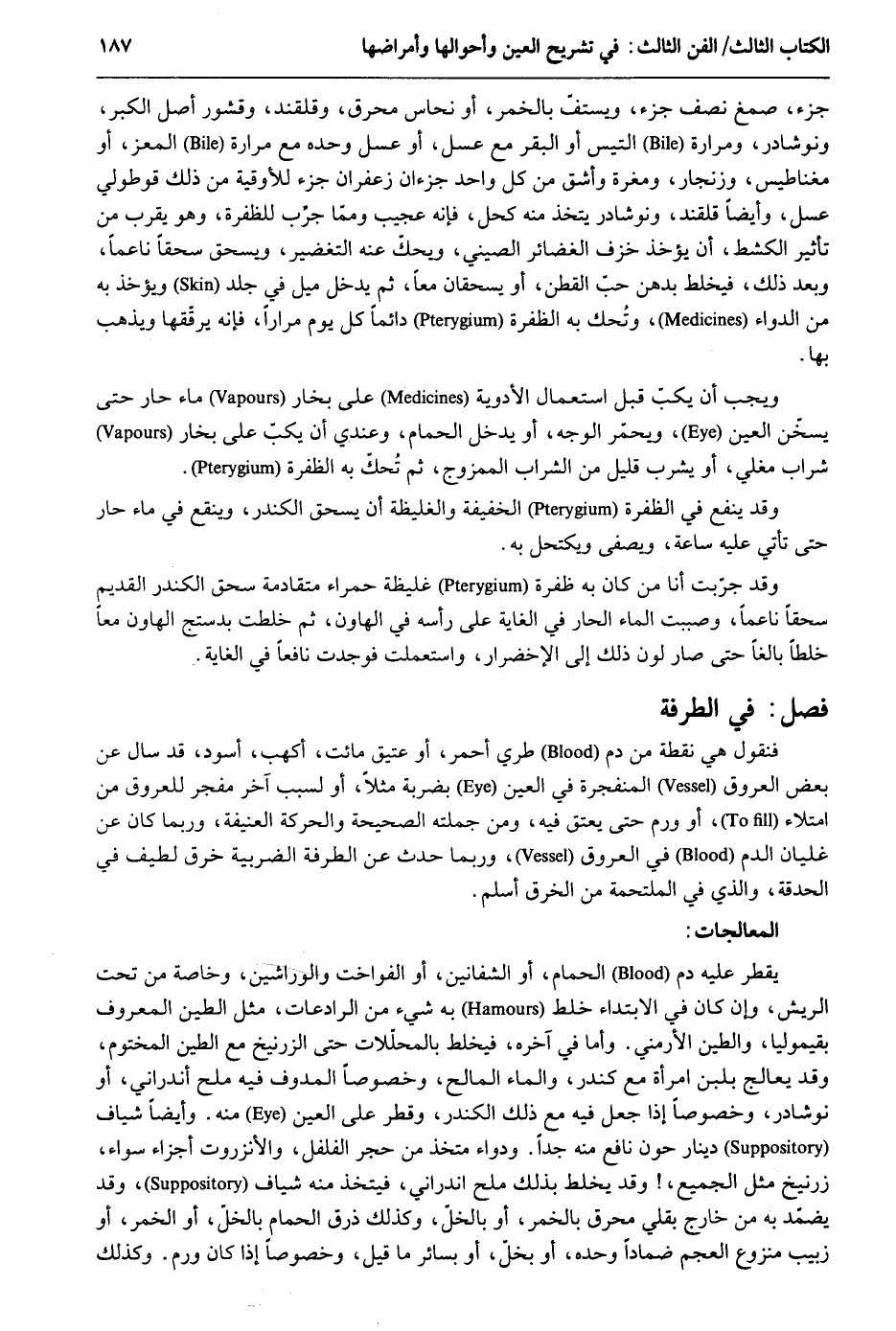 جُزْء صمغ نصف جُزْء ويستفّ بِالْخمرِ أَو نُحَاس محرق وقلقند وقشور أصل الْكبر ونوشادر ومرارة التيس أَو الْبَقر مَعَ عسل أَو عسل وَحده مَعَ مرَارَة الْمعز أَو مغناطيس وزنجار ومغرة وأشق من كل وَاحِد جزءان زعفران جُزْء للأوقية من ذَلِك قوطولي عسل وَأَيْضًا قلقند ونوشادر يتَّخذ مِنْهُ كحل فانه عَجِيب للظفرة وَهُوَ يقرب من تَأْثِير الكشط أَن يُؤْخَذ خزف الغضائر الصيني ويحكّ عَنهُ التغضير ويسحق سحقاً نَاعِمًا وَبعد ذَلِك فيخلط بدهن حبّ الْقطن أَو يسحقان مَعًا ثمَّ يدْخل ميل فِي جلد وَيُؤْخَذ بِهِ من الدَّوَاء وَيحك بِهِ الظفرة دَائِما كل يَوْم مرَارًا فَإِنَّهُ يرقّقها وَيذْهب بهَا. وَيجب أَن يكبّ قبل اسْتِعْمَال الْأَدْوِيَة على بخار مَاء حَار حَتَّى يسخّن الْعين ويحمر الْوَجْه أَو يدْخل الْحمام وَعِنْدِي أَن يكبّ على بخار شراب مغلي أَو يشرب قَلِيل من الشَّرَاب الممزوج ثمَّ يحك بِهِ الظفرة. وَقد ينفع فِي الظفرة الْخَفِيفَة والغليظة أَن يسحق الكندر وينقع فِي مَاء حَار حَتَّى يَأْتِي عَلَيْهِ سَاعَة ويصفى ويكتحل بِهِ. وَقد جرّبت أَنا من كَانَ بِهِ ظفرة غَلِيظَة حَمْرَاء متقادم سحق الكندر الْقَدِيم سحقاً نَاعِمًا وصببت المَاء الْحَار فِي الْغَايَة على رَأسه فِي الهاون ثمَّ خلطت بدستج الهاون مَعًا خلطاً بَالغا حَتَّى صَار لون ذَلِك إِلَى الإخضرار واستعملت فَوجدت نَافِعًا فِي الْغَايَة. فصل فِي الطرفة فَنَقُول هِيَ نقطة من دم طري أَحْمَر أَو عَتيق مائت أكهب أسود قد سَالَ عَن بعض الْعُرُوق المنفجرة فِي الْعين بضربة مثلا أَو لسَبَب آخر مفجر للعروق من امتلاء أَو ورم حَتَّى يعْتق فِيهِ وَمن جملَته الصَّحِيحَة وَالْحَرَكَة العنيفة وَرُبمَا كَانَ عَن غليان الدَّم فِي الْعُرُوق وَرُبمَا حدث عَن الطرفة الضربية خرق لطيف فِي الحدقة وَالَّذِي فِي الملتحمة من الْخرق أسلم. المعالجات: يقطر عَلَيْهِ دم الْحمام أَو الشفانين أَو الفواخت والوراشين وخاصة من تَحت الريش وَإِن كَانَ فِي الِابْتِدَاء خلط بِهِ شَيْء من الرادعات مثل الطين الْمَعْرُوف بقيموليا والطين الأرمني. وَأما فِي آخِره فيخلط بالمحللات حَتَّى الزرنيج مَعَ الطين الْمَخْتُوم وَقد يعالج بِلَبن امْرَأَة مَعَ كندر وَالْمَاء المالح وخصوصاً والمدوف فِيهِ ملح أندراني أَو نوشادر وخصوصاً إِذا جعل فِيهِ مَعَ ذَلِك الكندر وقطر على الْعين مِنْهُ. وَأَيْضًا شياف دِينَار دون نَافِع مِنْهُ جدا. ودواء متخذ من حجر الفلفل والأنزروت أَجزَاء سَوَاء زرنيخ مثل الْجَمِيع وَقد يخلط بذلك ملح اندراني فيتخذ مِنْهُ شياف وَقد يضمد بِهِ من خَارج بقلي محرق بِالْخمرِ أَو بالخل وَكَذَلِكَ فرق الْحمام بالخل أَو الْحمر أَو زبيب منزوع الْعَجم ضماداً وَحده أَو بخل أَو بِسَائِر مَا قيل وخصوصاً إِذا كَانَ ورم. وَكَذَلِكَ