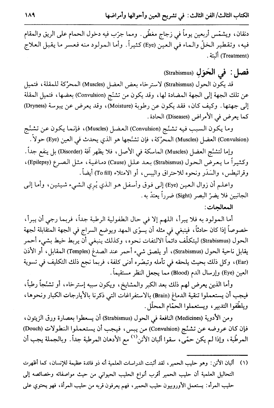 دنقان ويشمس أَرْبَعِينَ يَوْمًا فِي زجاج مغطى. وَمِمَّا جرب فِيهِ دُخُول الْحمام على الرِّيق وَالْمقَام فِيهِ وتقطير الخلّ وَالْمَاء فِي الْعين كثيرا. وَأما الْمَوْلُود مِنْهُ فعسر مَا يقبل العلاج الْبَتَّةَ. قد يكون الْحول لاسترخاء بعض العضل المحركة للمقلة فتميل عَن تِلْكَ الْجِهَة إِلَى الْجِهَة المضادة لَهَا وَقد يكون من تشنج بَعْضهَا فتميل المقلة إِلَى جِهَتهَا. وَكَيف كَانَ فقد يكون عَن رطربة وَقد يعرض عَن يبوسة كَمَا يعرض فِي الْأَمْرَاض الحادة. وَمَا يكون السَّبَب فِيهِ تشنج العضل فَإِنَّمَا يكون عَن تشنج العضل المحركة فَإِن تشنجها هُوَ الَّذِي يحدث فِي الْعين حولا. وَإِمَّا لتشنج العضل الماسكة فِي الأَصْل فَلَا يظْهر آفَة بل ينفع جدا. وَكَثِيرًا مَا يعرض الْحول بعد علل دماغية مثل الصرع وقرانيطس والسَدر وَنَحْوه للاحتراق واليبس أَو الامتلاء أَيْضا. وَاعْلَم أَن زَوَال الْعين إِلَى فَوق وأسفل هُوَ الَّذِي يُرِي الشَّيْء شَيْئَيْنِ وَأما إِلَى الْجَانِبَيْنِ فَلَا يضر الْبَصَر ضَرَرا يعْتد بِهِ. المعالجات: أما الْمَوْلُود بِهِ فَلَا يبر اللَّهُمَّ إِلَّا فِي حَال الطفولية الرّطبَة جدا فَرُبمَا رُجي أَن يبرأ خُصُوصا إِذا كَانَ حَادِثا فَيَنْبَغِي فِي مثله أَن يسوّى المهد وَيُوضَع السراج فِي الْجِهَة المتقابلة لجِهَة الْحول ليتكلف دَائِما الِالْتِفَات نَحوه وَكَذَلِكَ يَنْبَغِي أَن يرْبط خيط بِشَيْء أَحْمَر يُقَابل نَاحيَة الْحول أَو يلصق شَيْء أَحْمَر عِنْد الصدغ الْمُقَابل أَو الْأذن وكل ذَلِك بِحَيْثُ يلْحقهُ فِي تَأمله وتبصّره أدنى كلفة فَرُبمَا نجع ذَلِك التَّكْلِيف فِي تَسْوِيَة الْعين وإرسال الدَّم مِمَّا يَجْعَل النّظر مُسْتَقِيمًا. وَأما الَّذين يعرض لَهُم ذَلِك بعد الْكبر والمشايخ وَيكون سَببه استرخاء أَو تشنجاً رطبا فَيجب أَن يستعملوا تنقية الدِّمَاغ بالاستفراغات الَّتِي ذكرنَا بالأيارجات الْكِبَار وَنَحْوهَا ويلطفوا التَّدْبِير ويستعملوا الْحمام المحلّل. وَمن الْأَدْوِيَة النافعة فِي الْحول أَن يسعطوا بعصارة ورق الزَّيْتُون فَإِن كَانَ عروضه عَن تشنّج من يبس فَيجب أَن يستعملوا النطولات المرطبة وَإِذا لم يكن حمى سقوا ألبان الأتن مَعَ الأدهان المرطبة جدا. وَبِالْجُمْلَةِ يجب أَن
