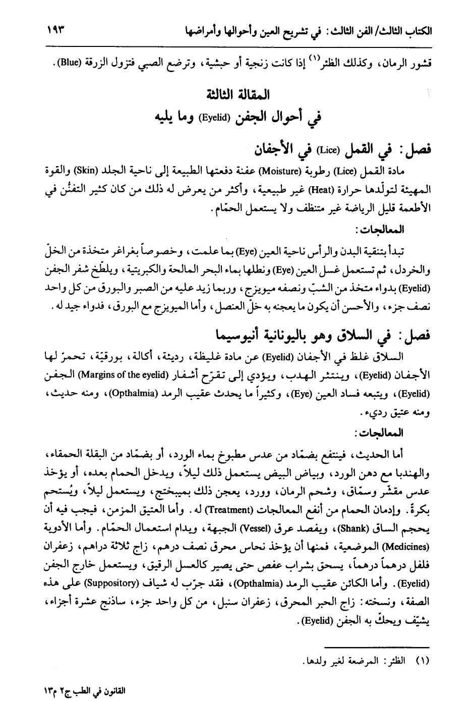 قشور الرُّمَّان وَكَذَلِكَ الظِّئْر إِذا كَانَت زنجية أَو حبشية وترضع الصَّبِي فتزول الزرقة. الْمقَالة الثَّالِثَة فصل فِي الْقمل فِي الأجفان مَادَّة الْقمل رُطُوبَة عفنة دفعتها الطبيعة إِلَى نَاحيَة الْجلد وَالْقُوَّة المهيئة لتولّدها حرارة غير طبيعية وَأكْثر من يعرض لَهُ ذَلِك من كَانَ كثير التفنُّن فِي الْأَطْعِمَة قَلِيل الرياضة غير متنظف وَلَا يسْتَعْمل الحمّام. المعالجات: تبدأ بتنقية الْبدن وَالرَّأْس نَاحيَة الْعين بِمَا علمت وخصوصاً بغراغر متخذة من الْخلّ والخردل ثمَّ تسْتَعْمل غسل الْعين ونطلها بِمَاء الْبَحْر المالحة والكبريتية ويلطّخ شفر الجفن بدواء متخذ من الشبّ وَنصفه ميويزج وَرُبمَا زيد عَلَيْهِ من الصَّبْر والبورق من كل وَاحِد نصف جُزْء وَالْأَحْسَن أَن يكون مَا يعجنه بِهِ خل العنصل وَأما الميويزج مَعَ البورق فدواء جيد لَهُ. فصل فِي السلاق وَهُوَ باليونانية أنيوسيما: السلاق غلظ فِي الأجفان عَن مَادَّة غَلِيظَة رَدِيئَة أكالة بورقيّة تحمرّ لَهَا الأجفان وينتثر الهدب وَيُؤَدِّي إِلَى تقرّح أشفار الجفن ويتبعه فَسَاد الْعين وَكَثِيرًا مَا يحدث عقيب الرمد وَمِنْه حَدِيث وَمِنْه عَتيق رَدِيء. المعالجات: أما الحَدِيث فينتفع بضمّاد من عدس مطبوخ بِمَاء بَارِد أَو بضمّاد من البقلة الحمقاء والهندبا مَعَ دهن الْورْد وَبَيَاض الْبيض يسْتَعْمل ذَلِك لَيْلًا وَيدخل الْحمام بعده أَو يُؤْخَذ عدس مقشّر وسقاق وشحم الرُّمَّان وَورد يعجن ذَلِك بميبختج وَيسْتَعْمل لَيْلًا ويُستحم بكرَة. وإدمان الْحمام من أَنْفَع المعالجات لَهُ. وَأما الْعَتِيق المزمن فَيجب فِيهِ أَن يحجم السَّاق ويفصد عرق الْجَبْهَة ويدام اسْتِعْمَال الْحمام. وَأما الْأَدْوِيَة الموضعية فَمِنْهَا أَن يُؤْخَذ نُحَاس محرق نصف دِرْهَم زاج ثَلَاثَة دَرَاهِم زعفران فلفل درهما درهما يسحق بشراب عفص حَتَّى يصير كالعسل الرَّقِيق وَيسْتَعْمل خَارج الجفن. وَأما الْكَائِن عقيب الرمد فقد جرب لَهُ شياف على هَذِه الصّفة ونسخته: زاج الحبر المحرق زعفران سنبل من كل وَاحِد جُزْء ساذنج عشرَة أَجزَاء يشتف وَيحك بِهِ الجفن.