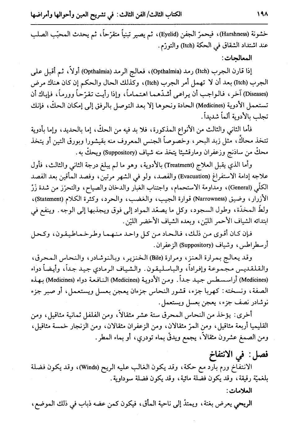 خشونة فيحمرّ الجفن ثمَّ يصير تبنياً متقرّحاً ثمَّ يحدث المحبب الصلب عِنْد اشتداد الشقاق فِي الحكة والتورّم. المعالجات: إِذا قَارن الجرب رمد فعالج الرمد أَولا ثمَّ أقبل على الجرب بعد أَن لَا تهمل أَمر الجرب وَكَذَلِكَ الْحَال وَالْحكم إِن كَانَ هُنَاكَ مرض آخر فَالْوَاجِب أَن يُرَاعِي أشدّهما اهتماماً وَإِذا رَأَيْت تقرّحاً وورماً فإياك أَن تسْتَعْمل الْأَدْوِيَة الحادة وَنَحْوهَا إِلَّا بعد التَّوَصُّل بالرفق إِلَى إِمْكَان الحك فَإنَّك لجلب بالأدوية ألماً شَدِيدا. فَأَما الثَّانِي وَالثَّالِث من الْأَنْوَاع الْمَذْكُورَة فَلَا بُد من الحك إِمَّا بالحديد وَإِمَّا بأدوية تتَّخذ محاك مثل زبد الْبَحْر وخصوصاً الْجِنْس الْمَعْرُوف مِنْهُ بقيشورا وبورق التِّين أَو يتَّخذ محك من ساذنج وزعفران ومارقشيثا يتَّخذ مِنْهُ شياف وَيحك بِهِ. وَأما الَّذِي يقبل العلاج بالأدوية وَهُوَ مَا لم يبلغ دَرَجَة الثَّانِي وَالثَّالِث فَأول علاجه إدامة الاستفراغ والفصد وَلَو فِي الشَّهْر مرَّتَيْنِ وفصد المأقين بعد الفصد الكلّي ومداومة الاستحمام وَاجْتنَاب الْغُبَار وَالدُّخَان والصياح والتحرّز من شدَّة زَرِّ الأزرار وضيق قوارة الجيب وَالْغَضَب والحرد وَكَثْرَة الْكَلَام ولط المخدة وَطول السُّجُود وكل مَا يصمد الْموَاد إِلَى فَوق ويجذبها إِلَى الْوَجْه. وينفع فِي ابْتِدَائه الشياف الْأَحْمَر الليّن وَبعده الشياف الْأَخْضَر الليّن. فَإِن كَانَ أقوى من ذَلِك فالحاد من كل وَاحِد مِنْهُمَا وطرخماطيقون وكحل أرسطراطس وشياف الزَّعْفَرَان. وَقد يعالج بمرارة العنز ومرارة الْخِنْزِير وبالنوشادر والنحاس المحرق والقلقديس مَجْمُوعَة وأفراداً والباسليقون. والشياف الرَّمَادِي جيد جدا وَأَيْضًا دَوَاء أراسسطس جيد جدا. وَمن الْأَدْوِيَة النافعة دَوَاء بِهَذِهِ الصّفة ونسخته: كهربا جُزْء قشور النّحاس جزءان يعجن بِعَسَل وَيسْتَعْمل أَو صَبر جُزْء نوشادر نصف جُزْء يعجن بِعَسَل وَيسْتَعْمل. أُخْرَى: يُؤْخَذ من النّحاس المحرق سِتَّة عشر مِثْقَالا وَمن الفلفل ثَمَانِيَة مَثَاقِيل وَمن القليميا أَرْبَعَة مَثَاقِيل وَمن المر مثقالان وَمن الزَّعْفَرَان مثقالان وَمن الزنجار خَمْسَة مَثَاقِيل وَمن الصمغ عشرُون مِثْقَالا يجمع ويحقّ بِمَاء تودري أَو بِمَاء الْمَطَر. فصل فِي الانتفاخ الانتفاخ ورم بَارِد مَعَ حكة وَقد يكون الْغَالِب عَلَيْهِ الرّيح وَقد يكون فضلَة بلغمية رقيقَة وَقد يكون فضلَة مائية وَقد يكون فضلَة سوداوية. العلامات: الريحي يعرض بَغْتَة ويمتدّ إِلَى نَاحيَة المأق فَيكون كمن عضه ذُبَاب فِي ذَلِك الْموضع