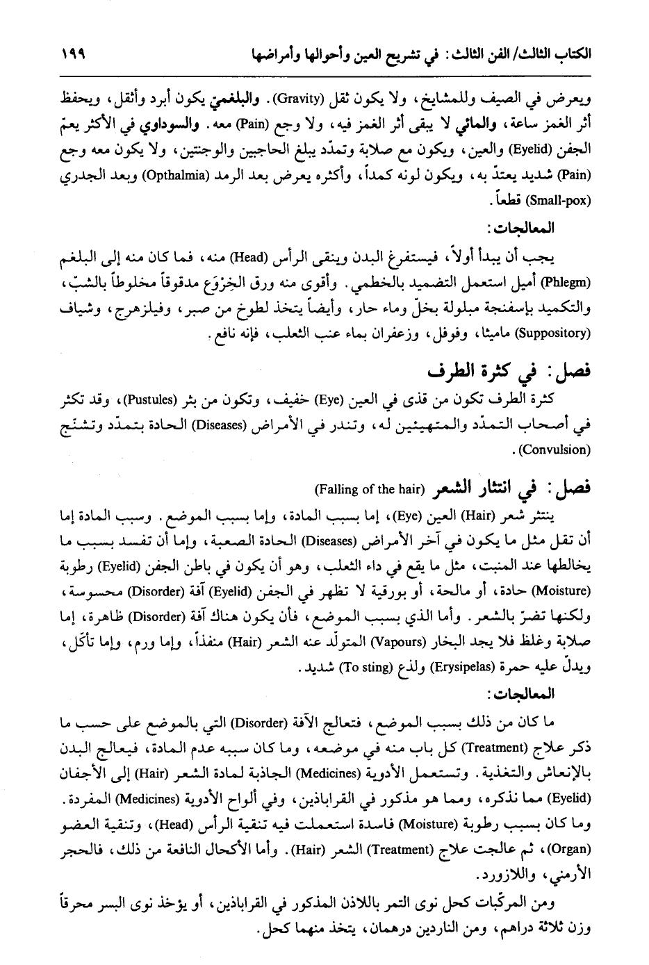 ويعرض فِي الصَّيف وللمشايخ وَلَا يكون ثقل. والبلغمي يكون أبرد وأثقل ويحفظ أثر الغمز سَاعَة والمائي لَا يبْقى أثر الغمز فِيهِ وَلَا وجع مَعَه. والسوداوي فِي الْأَكْثَر يعم الجفن وَالْعين وَيكون مَعَ صلابة وتمدد يبلغ الحاجبين والوجنتين وَلَا يكون مَعَه وجع شَدِيد يعتدّ بِهِ وَيكون لَونه كمداً وَأَكْثَره يعرض بعد الرمد وَبعد الجدري قطعا. المعالجات: يجب أَن يبْدَأ أَولا فيستفرغ الْبدن وينقى الرَّأْس مِنْهُ فَمَا كَانَ مِنْهُ إِلَى البلغم أميل اسْتعْمل التضميد بالخطمي. وَأقوى مِنْهُ ورق الخِروَع مدقوقاً مخلوطاً بالشبّ والتكميد بإسفنجة مبلولة بخلّ وَمَاء حَار وَأَيْضًا يتَّخذ لطوخ من صَبر وفيلزهرج وشياف ماميثا وفوفل وزعفران بِمَاء عِنَب الثَّعْلَب فَإِنَّهُ نَافِع. فصل فِي كَثْرَة الطّرف كَثْرَة الطّرف تكون من قذى فِي الْعين خَفِيف وَتَكون من بثر وَقد تكْثر فِي أَصْحَاب التمدد والمتهيئين لَهُ وتندر فِي الْأَمْرَاض الحادة بتمدد وتشنّج. فصل فِي انتثار الشّعْر ينتثر شعر الْعين إِمَّا بِسَبَب الْمَادَّة وَإِمَّا بِسَبَب الْموضع. وَسبب الْمَادَّة إِمَّا أَن تقل مثل مَا يكون فِي آخر الْأَمْرَاض الحادة الصعبة وَإِمَّا أَن تفْسد بِسَبَب مَا يخالطها عِنْد المنبت مثل مَا يَقع فِي دَاء الثَّعْلَب وَهُوَ أَن يكون فِي بَاطِن الجفن رُطُوبَة حادة أَو مالحة أَو بورقية لَا تظهر فِي الجفن آفَة محسوسة وَلكنهَا تضر بالشعر. وَأما الَّذِي بِسَبَب الْموضع فَأن يكون هُنَاكَ آفَة ظَاهِرَة إِمَّا صلابة وَغلظ فَلَا يجد البخار الْمُتَوَلد عَنهُ الشّعْر منفذاً وَإِمَّا ورم وَإِمَّا تَأْكُل ويدلّ عَلَيْهِ حمرَة ولذع شَدِيد. المعالجات: مَا كَانَ من ذَلِك بِسَبَب الْموضع فتعالج الآفة الَّتِي بالموضع على حسب مَا ذكر علاج كل بَاب مِنْهُ فِي مَوْضِعه وَمَا كَانَ سَببه عدم الْمَادَّة فيعالج الْبدن بالإنعاش والتغذية. وتستعمل الْأَدْوِيَة الجاذبة لمادة الشّعْر إِلَى الأجفان مِمَّا نذكرهُ وَمِمَّا هُوَ مَذْكُور فِي القراباذين وَفِي أَلْوَاح الْأَدْوِيَة المفردة. وَمَا كَانَ بِسَبَب رُطُوبَة فَاسِدَة اسْتعْملت فِيهِ تنقية الرَّأْس وتنقية الْعُضْو ثمَّ عَالَجت علاج الشّعْر. وَأما الأكحال النافعة من ذَلِك فالحجر الأرمنيَ واللازورد. وَمن المركبات كحل نوى التَّمْر باللاذن الْمَذْكُور فِي القراباذين أَو يُؤْخَذ نوى الْبُسْر محرقاً وزن ثَلَاثَة دَرَاهِم وَمَرَّتْ الناردين درهما يتَّخذ مِنْهُمَا كحل.