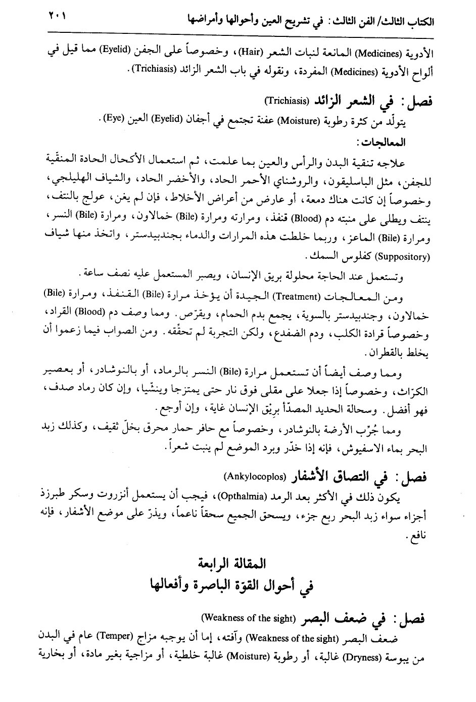 الْأَدْوِيَة الْمَانِعَة لنبات الشّعْر وخصوصاً على الجفن مِمَّا قيل فِي أَلْوَاح الْأَدْوِيَة المفردة ونقوله فِي بَاب الشّعْر الزَّائِد. فصل فِي الشّعْر الزَّائِد المعالجات: علاجه تنقية الْبدن وَالرَّأْس وَالْعين بِمَا علمت ثمَّ اسْتِعْمَال الأكحال الحادة المنقّية للجفن مثل الياسليقون والروشناي الْأَحْمَر الحاد والأخضر الحاد والشياف الهليلجي وخصوصاً إِن كَانَت هُنَاكَ دمعة أَو عَارض من أَعْرَاض الأخلاط فَإِن لم يغن عولج بالنتف ينتف ويطلى على منبته دم قنفذ ومرارته ومرارة خمالاون ومرارة النسْر ومرارة الماعز وَرُبمَا خلطت هَذِه المرارات والدماء بجندبيدستر وَاتخذ مِنْهَا شياف كفلوس السّمك. وتستعمل عِنْد الْحَاجة محلولة بريق الْإِنْسَان ويصبر الْمُسْتَعْمل عَلَيْهِ نصف سَاعَة. وَمن المعالجات الجيدة أَن يُؤْخَذ مرَارَة الْقُنْفُذ ومرارة خمالاون وجندبيدستر بِالسَّوِيَّةِ يجمع بِدَم الْحمام ويقرص. وَمِمَّا وصف دم القراد وخصوصاً قرادة الْكَلْب وَدم الضفدع وَلَكِن التجربة لم تحقَقه. وَمن الصَّوَاب فِيمَا زَعَمُوا أَن يخلط بالقطران. وَمِمَّا وصف أَيْضا أَن تسْتَعْمل مرَارَة النسْر بالرماد أَو بالنوشادر أَو بعصير الكراث وخصوصاً إِذا جعلا على مقلى فَوق نَار حَتَّى يمتزجا وينشى وَإِن كَانَ رماد صدف فَهُوَ أفضل وسحالة الْحَدِيد المصدأ برِيق الْإِنْسَان غَايَة وَإِن أوجع. وَمِمَّا جُرب الأرضة بالنوشادر وصوصاً مَعَ حافر حمَار محرق بخل ثَقِيف وَكَذَلِكَ زبد الْبَحْر بِمَاء الاسفيوش فَإِنَّهُ إِذا خدر وَبرد الْموضع لم ينْبت شعرًا. يكون ذَلِك فِي الْأَكْثَر بعد الرمد فَيجب أَن يسْتَعْمل أنزروت وسكر طبرزذ أَجزَاء سَوَاء زبد الْبَحْر ربع جُزْء ويسحق الْجَمِيع سحقاً نَاعِمًا ويذر على مَوضِع الأشفار فَإِنَّهُ نَافِع. الْمقَالة الرَّابِعَة أَحْوَال القوّة الباصرة وأفعالها فصل فِي ضعف الْبَصَر ضعف الْبَصَر وآفته إِمَّا أَن يُوجِبهُ مزاج عَام فِي الْبدن من يبوسة غالبة أَو رُطُوبَة غالبة خلطية أَو مزاجية بِغَيْر مَادَّة أَو بخارية