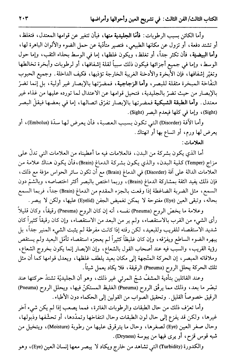 وَأما الْكَائِن بِسَبَب الرطوبات: فأمّا الجليدية مِنْهَا فبأن تَتَغَيَّر عَن قوامها المعتدل فتغلظ أَو تشتد دفْعَة أَو تَزُول عَن مَكَانهَا الطبيعي فَتَصِير متأذّية عَن حمل الضَّوْء والألوان الباهرة لَهَا وَأما البيضية فَأن تكْثر جدا أَو تغلظ وَيكون غلظها إِمَّا فِي الْوسط بحذاء النقب وَإِمَّا حول الْوسط وَإِمَّا فِي جَمِيع أَجْزَائِهَا فَيكون ذَلِك سَببا لقلَّة إشفافها أَو لرطوبات وأبخرة تخالطها وَتغَير إشفافها فَإِن الأبخرة والأدخنة الغريبة الْخَارِجَة تؤذيها فَكيف الدَّاخِلَة. وَجَمِيع الْحُبُوب النفّاخة المبخرة مثقلة لِلْبَصَرِ وَأما الزجاجية فمضرّتها بالإبصار غير أولية بل إِنَّمَا تضرّ بالإبصار من حَيْثُ تضرّ بالجليدية فتحيل قوامها عَن الِاعْتِدَال لما تورده عَلَيْهَا من غذَاء غير معتدل. وَأما الطَّبَقَة الشبكية فمضرتها بالإبصار تفرق اتصالها إِمَّا فِي بَعْضهَا فيقل الْبَصَر وَإِمَّا فِي كلهَا فيعدم الْبَصَر. وَأما الآفة الَّتِي تكون بِسَبَب الْعصبَة فَأن يعرض لَهَا سدّة أَو يعرض لَهَا ورم أَو اتساع بهَا أَو انهتاك. العلامات: أما الَّذِي يكون بشركة من الْبدن فالعلامات فِيهِ مَا أعطيناه من العلامات الَّتِي تدل على مزاج كُلية الْبدن وَالَّذِي يكون بشركة الدِّمَاغ فَأن يكون هُنَاكَ عَلامَة من العلامات الدَّالَّة على آفَة فِي الدِّمَاغ مَعَ أَن تكون سَائِر الْحَواس مؤفة مَعَ ذَلِك فَإِن ذَلِك يُفِيد الثِّقَة بمشاركة الدِّمَاغ وَرُبمَا اخْتصَّ بالبصر أَكثر اخْتِصَاصه وبالشم دون السّمع مثل الضَّرْبَة الضاغطة إِذا وَقعت بالجزء الْمُقدم من الدِّمَاغ جدا فَرُبمَا السّمع بِحَالهِ وَتبقى الْعين مَفْتُوحَة لَا يُمكن تغميض الجفن عَلَيْهَا وَلَكِن لَا يبصر. وعلامة مَا يخصّ الرّوح نَفسه إِنَّه إِن كَانَ الرّوح رَقِيقا وَكَانَ قَلِيلا رأى الشَّيْء من الْقرب بالاستقصاء وَلم ير من الْبعد من الِاسْتِقْصَاء وَإِن كَانَ رَقِيقا كثيرا كَانَ شَدِيد الِاسْتِقْصَاء للقريب وللبعيد لَكِن رقته إِذا كَانَت مفرطة لم يثبت الشَّيْء الْمُنِير جدا بل يبهره الضَّوْء الساطع ويفرّقه وَإِن كَانَ غليظاً كثيرا لم يعجزه استقصاء تَأمل الْبعيد وَلم يستقص رُؤْيَة الْقَرِيب وَالسَّبَب فِيهِ عِنْد أَصْحَاب القَوْل بالشعاع وَإِن الإبصار إِنَّمَا يكون بِخُرُوج الشعاع وملاقاته المبصر إِن الْحَرَكَة المتّجهة إِلَى مَكَان بعيد يلطف غلظها ويعدل قوامها كَمَا أَن مثل تِلْكَ الْحَرَكَة يحلل الرّوح الرقيقة فَلَا يكَاد يعْمل شَيْئا. وَعند الْقَائِلين بتأدية المشف شجّ المرئي غير ذَلِك وَهُوَ أَن الجليدية تشتدّ حركتها عِنْد تبصّر مَا بعد وَذَلِكَ مِمَّا يرقّق الرّوح الغليظ المستكنّ فِيهَا ويحلل الرّوح الرَّقِيق خُصُوصا الْقَلِيل. وَتَحْقِيق الصَّوَاب من الْقَوْلَيْنِ إِلَى الْحُكَمَاء دون الْأَطِبَّاء. وَأما تعرّف ذَلِك من حَال الطَّبَقَات والرطوبات الغائرة فمما يصعب إِذا لم يكن شَيْء آخر غَيرهَا وَلَكِن قد يفزع إِلَى حَال لون الطَّبَقَات وَحَال انتفاخها وتمددها أَو تحشّفها وذبولها وَحَال صغر الْعين لصغرها وَحَال مَا يترقرق عَلَيْهَا من رُطُوبَة ويتخيل من شبه قَوس قزَح أَو يرى فِيهَا من يبوسة. والكدورة الَّتِي تشاهد من خَارج ويكاد لَا بصر مَعهَا إِنْسَان الْعين وَهُوَ