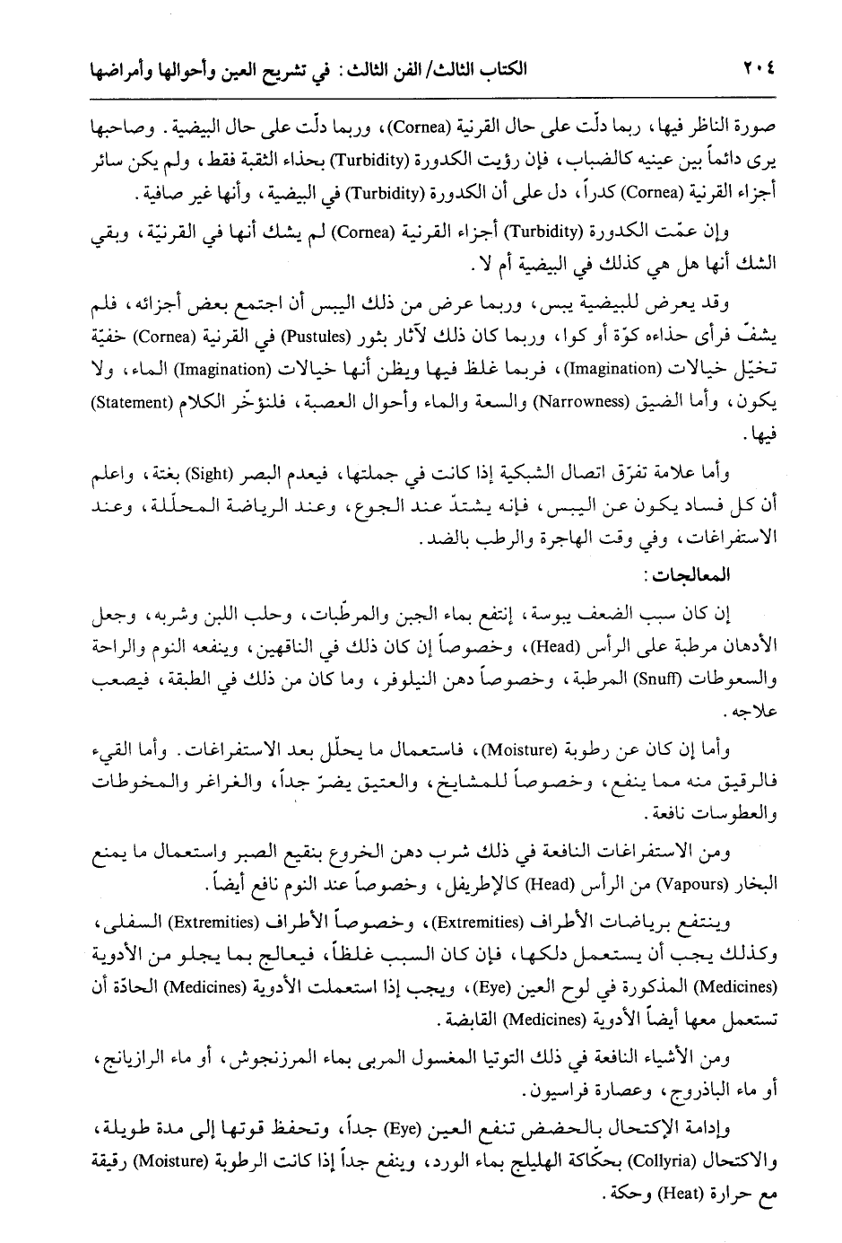 صُورَة النَّاظر فِيهَا رُبمَا دلّت على حَال القرنية وَرُبمَا دلّت على حَال البيضية. وصاحبها يرى دَائِما بَين عَيْنَيْهِ كالضباب فَإِن رؤيت الكدورة بحذاء الثقبة فَقَط وَلم يكن سَائِر أَجزَاء القرنية كدراً دلّ على أَن الكدورة فِي البيضية وَأَنَّهَا غير صَافِيَة. وَإِن عَمت الكدورة أَجزَاء القرنية لم يشك أَنَّهَا فِي القرنية وَبَقِي الشَّك أَنَّهَا هَل هِيَ كَذَلِك فِي البيضية أم لَا. وَقد يعرض للبيضة يبس وَرُبمَا عرض من ذَلِك اليبس أَن اجْتمع بعض أَجْزَائِهِ فَلم يشفّ فَرَأى حذاءه كوَّة أَو كوى وَرُبمَا كَانَ ذَلِك لآثار بثور فِي القرنية خفيّة تختل خيالات فَرُبمَا غلظ فِيهَا ويظن أَنَّهَا خيالات المَاء وَلَا يكون وَأما الضّيق وَالسعَة وَالْمَاء وأحوال الْعصبَة فلنؤخر الْكَلَام فِيهَا. وَأما عَلامَة تفرق اتِّصَال الشبكية إِذا كَانَت فِي جُمْلَتهَا فيعدم الْبَصَر بَغْتَة وَاعْلَم أَن كل فَسَاد يكون عَن اليبس فَإِنَّهُ يشْتَد عِنْد الْجُوع وَعند الرياضة المحللة وَعند الاستفراغات وَفِي وَقت الهاجرة وَالرّطب بالضد. المعالجات: إِن كَانَ سَبَب الضعْف يبوسة انْتفع بِمَاء الْجُبْن والمرطبات وحلب اللَّبن وشربه وَجعل الأدهان مرطبة على الرَّأْس وخصوصاً إِن كَانَ ذَلِك فِي الناقهين وينفعه النّوم والراحة والسعوطات المرطبة وخصوصاً دهن النيلوفر وَمَا كَانَ من ذَلِك فِي الطَّبَقَة فيصعب علاجه. وَأما إِن كَانَت عَن رُطُوبَة فاستعمال مَا يحلل بعد الاستفراغات. وَأما الْقَيْء فالرقيق مِنْهُ مِمَّا ينفع وخصوصاً للمشايخ والعتيق يضرّ جدا والغراغر والمخوطات والعطوسات نافعة. وَمن الإستفراغات النافعة فِي ذَلِك شرب دهن الخروع بنقيع الصَّبْر وَاسْتِعْمَال مَا يمْنَع البخار من الرَّأْس كالإطريفل وخصوصاً عِنْد النّوم نَافِع أَيْضا. وَينْتَفع برياضات الْأَطْرَاف وخصوصاً الْأَطْرَاف السُّفْلى وَكَذَلِكَ يجب أَن يسْتَعْمل دلكها فَإِن كَانَ السَّبَب غلظاً فيعالج بِمَا يجلو من الْأَدْوِيَة الْمَذْكُورَة فِي لوح الْعين وَيجب إِذا اسْتعْملت الْأَدْوِيَة الحادّة أَن تسْتَعْمل مَعهَا أَيْضا الْأَدْوِيَة القابضة. وَعَن الْأَشْيَاء النافعة فِي ذَلِك التوتيا المغسول المربى بِمَاء المرزنجوش أَو مَاء الرازيانج أَو مَاء الباذروخ وعصارة فراسيون. وإدامة الاكتحال بالحضض تَنْفَع الْعين جدا وَتحفظ قوتها إِلَى مُدَّة طَوِيلَة والاكتحال بحكّاكة الهليلج بِمَاء الْورْد وينفع جدا إِذا كَانَت الرُّطُوبَة رقيقَة مَعَ حرارة وحكة.