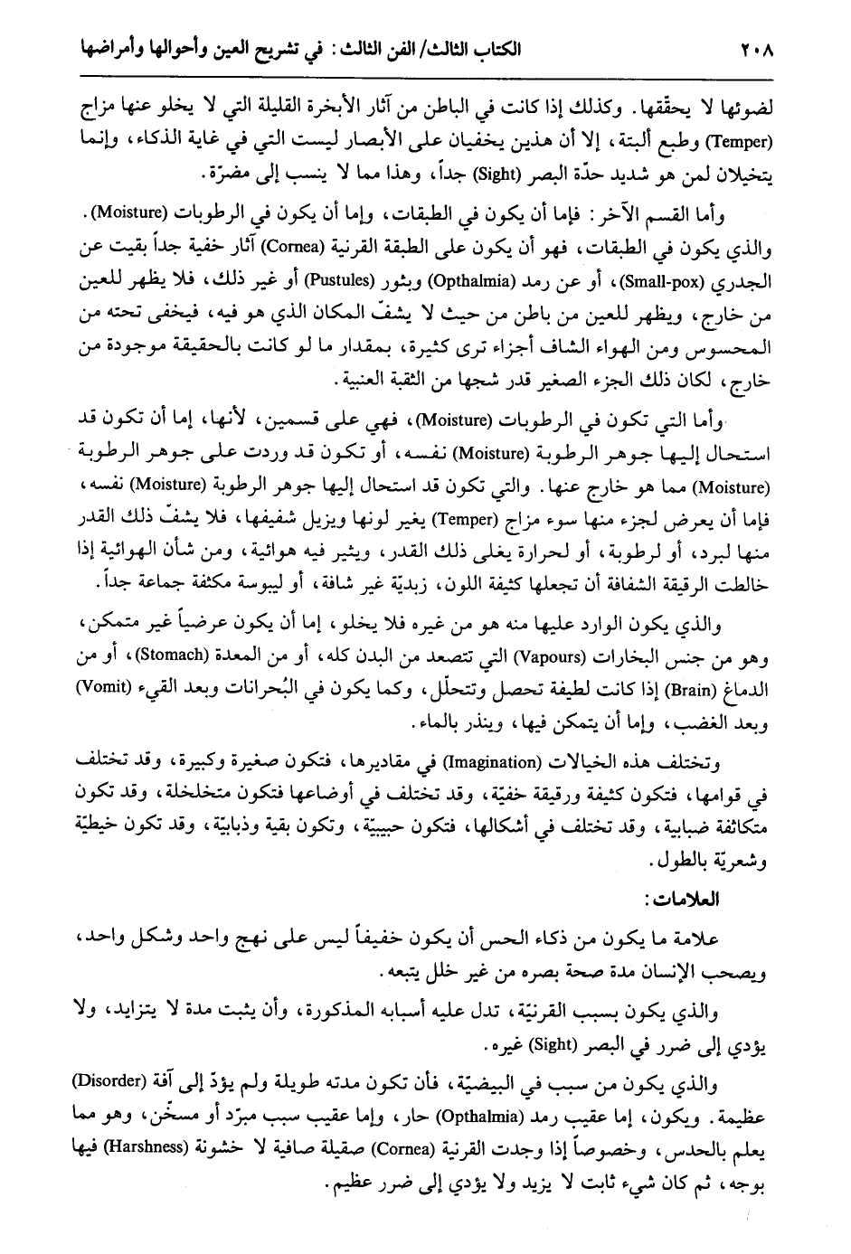 لضوئها لَا يحققها. وَكَذَلِكَ إِذا كَانَت فِي الْبَاطِن من آثَار الأبخرة القليلة الَّتِي لَا يَخْلُو عَنْهَا مزاج وطبع الْبَتَّةَ إِلَّا أَن هذَيْن يخفيان على الْأَبْصَار لَيست الَّتِي فِي غَايَة الذكاء وَإِنَّمَا يتخيلان لمن هُوَ شَدِيد حِدة الْبَصَر جدا وَهَذَا مِمَّا لَا ينْسب إِلَى مضرَّة. وَأما الْقسم الآخر: فإمَّا أَن يكون فِي الطَّبَقَات وَإِمَّا أَن يكون فِي الرطوبات. وَالَّذِي يكون فِي الطَّبَقَات فَهُوَ أَن يكون على الطَّبَقَة القرنية آثَار خُفْيَة جدا بقيت عَن الجدري أَو عَن رمد وبثور أَو غير ذَلِك فَلَا يظْهر للعين من خَارج وَيظْهر للعين من بَاطِن من حَيْثُ لَا يشف الْمَكَان الَّذِي هُوَ فِيهِ فيخفى تَحْتَهُ من المحسوس وَمن الْهَوَاء الشاف أَجزَاء ترى كَثِيرَة بِمِقْدَار مَا لَو كَانَت بِالْحَقِيقَةِ مَوْجُودَة من خَارج لَكَانَ ذَلِك الْجُزْء الصَّغِير قدر شجها من الثقبة العنبية. وَأما الَّتِي تكون فِي الرطوبات فَهِيَ على قسمَيْنِ لِأَنَّهَا إِمَّا أَن تكون قد اسْتَحَالَ إِلَيْهَا جَوْهَر الرُّطُوبَة نَفسه أَو تكون قد وَردت على جَوْهَر الرُّطُوبَة مِمَّا هُوَ خَارج عَنْهَا. وَالَّتِي تكون قد اسْتَحَالَ إِلَيْهَا جَوْهَر الرُّطُوبَة نَفسه فإمَّا أَن يعرض لجزء مِنْهَا سوء مزاج يُغير لَوْنهَا ويزيل شفيفها فَلَا يشفّ ذَلِك الْقدر مِنْهَا لبرد أَو لرطوبة أَو لحرارة يغلى ذَلِك الْقدر ويثير فِيهِ هوائية وَمن شَأْن الهوائية إِذا خالطت الرقيقة الشفافة أَن تجعلها كثيفة اللَّوْن زبدية غير شافة أَو ليبوسة مكثفة جمَاعَة جدا. وَالَّذِي يكون الْوَارِد عَلَيْهَا مِنْهُ هُوَ من غَيره فَلَا يَخْلُو إِمَّا أَن يكون عرضياً غير مُتَمَكن وَهُوَ من جنس البخارات الَّتِي تتصعد من الْبدن كُله أَو من الْمعدة أَو من الدِّمَاغ إِذا كَانَت لَطِيفَة تحصل وتتحلل وكما يكون فِي البُحرانات وَبعد الْقَيْء وَبعد الْغَضَب وَإِمَّا أَن يتَمَكَّن فِيهَا وينذر بِالْمَاءِ. وتختلف هَذِه الخيالات فِي مقاديرها فَتكون صَغِيرَة وكبيرة وَقد تخْتَلف فِي قوامها فَتكون كثيفة ورقيقة خُفْيَة وَقد تخْتَلف فِي أوضاعه فَتكون متخلخلة وَقد تكون متكاثفة ضبابية وَقد تخْتَلف فِي أشكالها فَتكون حبيبية وَتَكون بَقِيَّة وذبابية وَقد تكون خيطية وشعرية بالطول. العلامات: عَلامَة مَا يكون من ذكاء الْحس أَن يكون خَفِيفا لَيْسَ على نهج وَاحِد وشكل وَاحِد ويصحب الْإِنْسَان مُدَّة صِحَة بَصَره من غير خلل يتبعهُ. وَالَّذِي يكون بِسَبَب القرنية تحل عَلَيْهِ أَسبَابه الْمَذْكُورَة وَأَن يثبت مُدَّة لَا يتزايد وَلَا يُؤَدِّي إِلَى ضَرَر فِي الْبَصَر غَيره. وَالَّذِي يكون من سَبَب فِي البيضية فَأن تكون مدَّته طَوِيلَة وَلم يؤد إِلَى آفَة عَظِيمَة وَيكون إِمَّا عقيب رمد حَار وَإِمَّا عقيب سَبَب مبرد أَو مسخن وَهُوَ مِمَّا يعلم بالحدس وخصوصاً إِذا وجدت القرنية صقيلة صَافِيَة لَا خشونة فِيهَا بِوَجْه ثمَّ كَانَ شَيْء ثَابت لَا يزِيد وَلَا يُؤَدِّي إِلَى ضَرَر عَظِيم.