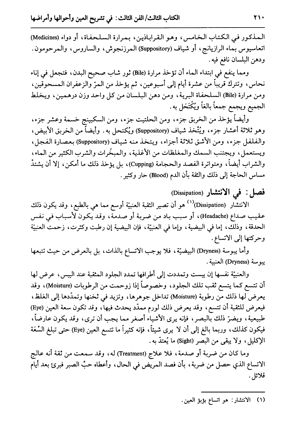 الْمَذْكُور فِي الْكتاب الْخَامِس وَهُوَ القراباذين بمرارة السلحفاة أَو دَوَاء اتعاسيوس بِمَاء الرازيانج أَو شياف المرزنجوش والساروس والمرحومون. ودهن البلسان نَافِع فِيهِ. وَمِمَّا ينفع فِي ابْتِدَاء المَاء أَن يُؤْخَذ مرَارَة ثَوْر شَاب صَحِيح الْبدن فتجعل فِي إِنَاء نُحَاس وتترك قَرِيبا من عشرَة أَيَّام إِلَى أسبوعين ثمَّ يُؤْخَذ من المرّ والزعفران المسحوقين وَمن مرَارَة السلحفاة الْبَريَّة وَمن دهن البلسان من كل وَاحِد وزن دِرْهَمَيْنِ ويخلط الْجَمِيع وَيجمع جمعا بَالغا ويُكْتَحَل بِهِ. وَأَيْضًا يُؤْخَذ من الخربق جُزْء وَمن الحلتيت جُزْء وَمن السكبينج خمس وَعشر جُزْء وَهُوَ ثَلَاثَة أعشار جُزْء ويُتَّخذ شياف ويُكتحل بِهِ. وَأَيْضًا من الخربق الْأَبْيَض والفلفل جُزْء وَمن الأشق ثَلَاثَة أَجزَاء ويتخذ مِنْهُ شياف بعصارة الفجل وَيسْتَعْمل ويجتنب السّمك والمغلظات من الأغذية والمبخرات وَالشرب الْكثير من المَاء وَالشرَاب أَيْضا ومتواترة الفصد والحجامة بل يُؤَخر ذَلِك مَا أمكن إِلَّا أَن يشْتَد مساس الْحَاجة إِلَى ذَلِك والثقة بِأَن الدَّم حَار وَكثير. فصل فِي الانتشار الانتشار هُوَ أَن تصير الثقبة العَنبية أوسع مِمَّا هِيَ بالطبع وَقد يكون ذَلِك عقيب صداع أَو سَبَب باد من ضَرْبَة أَو صدمة وَقد يكون لأسباب فِي نفس الحدقة وَذَلِكَ إِمَّا فِي البيضية وَإِمَّا فِي العنبيّة فَإِن البيضية إِن رطبت وَكَثُرت زحمت العنبية وحركتها إِلَى الاتساع. وَأما يبوسة البيضية فَلَا يُوجب الاتساع بِالذَّاتِ بل بِالْعرضِ من حَيْثُ يتبعهَا يبوسة العنبية. والعنبية نَفسهَا إِن يَبِسَتْ وتمددت إِلَى أطرافها تمدد الْجُلُود المثقبة عِنْد اليبس عرض لَهَا أَن تتسع كَمَا يَتَّسِع ثقب تِلْكَ الْجُلُود وخصوصاً إِذا زوحمت من الرطوبات وَقد يعرض لَهَا ذَلِك من رُطُوبَة تدَاخل جوهرها وتزيد فِي ثخنها وتمددها إِلَى الغلظ فَيعرض للثقبة أَن تتسع وَقد يعرض ذَلِك لورم ممدد يحدث فِيهَا وَقد تكون سَعَة الْعين طبيعية ويضر ذَلِك بالبصر فَإِنَّهُ يرى الْأَشْيَاء أَصْغَر مِمَّا يجب أَن ترى وَقد يكون عارضاً فَيكون كَذَلِك وَرُبمَا بَالغ إِلَى أَن لَا يرى شَيْئا فَإِنَّهُ كثيرا مَا تتسع الْعين حَتَّى تبلغ السعَة الإكليل وَلَا يبْقى من الْبَصَر مَا يُعتدّ بِهِ. وَمَا كَانَ من ضَرْبَة أَو صدمة فَلَا علاج لَهُ وَقد سَمِعت من ثِقَة أَنه عالج الاتساع الَّذِي حصل من ضَرْبَة بِأَن فصد الْمَرِيض فِي الْحَال وَأَعْطَاهُ حب الصَّبْر فبرئ بعد أَيَّام قَلَائِل.