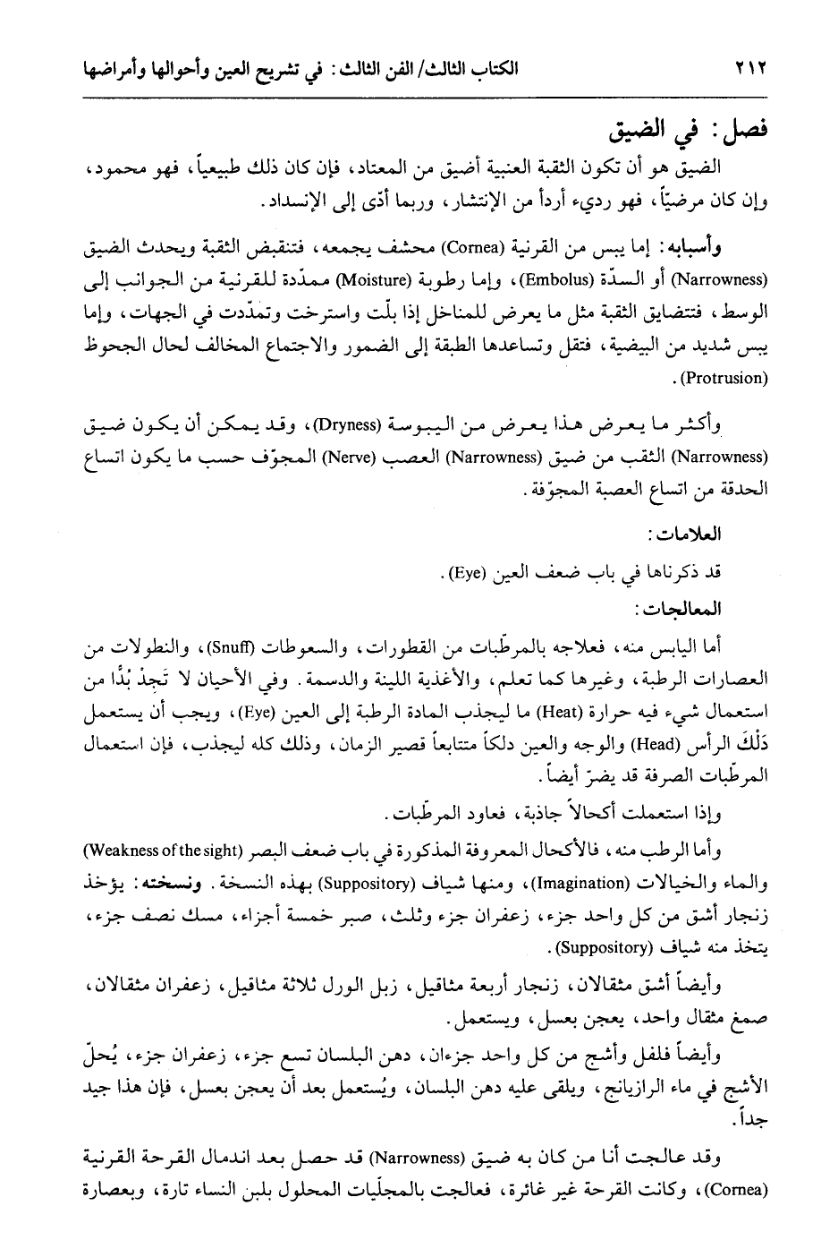فصل فِي الضّيق الضّيق هُوَ أَن تكون الثقبة العنبية أضيق من الْمُعْتَاد فَإِن كَانَ ذَلِك طبيعياً فَهُوَ مَحْمُود وَإِن كَانَ مرضياً فَهُوَ رَدِيء أردأ من الانتشار. وَرُبمَا أدّى إِلَى الانسداد. وأسبابه: إِمَّا يبس من القرنية محشف يجمعه فتنقبض الثقبة وَيحدث الضّيق أَو السدة وَإِمَّا رُطُوبَة ممددة للقرنية من الجوانب إِلَى الْوسط فتتضايق الثقبة مثل مَا يعرض للمناخل إِذا بقت وَاسْتَرْخَتْ وتمددت فِي الْجِهَات وَإِمَّا يبس شَدِيد من البيضية فتقل وتساعدها الطَّبَقَة إِلَى الضمور والاجتماع الْمُخَالف لحَال الجحوظ. وَكثر مَا يعرض هَذَا يعرض من اليبوسة وَقد يُمكن أَن يكون ضيق الثقب من ضيق العصب المجوف حسب مَا يكون اتساع الحدقة من اتساع العلامات: قد ذَكرنَاهَا فِي بَاب ضعف الْعين. المعالجات: أما الْيَابِس مِنْهُ فعلاجه بالمرطّبات من القطورات والسعوطات والنطولات من العصارات الرّطبَة وَغَيرهَا كَمَا تعلم والأغذية اللينة والدسمة. وَفِي الأحيان لَا تَجد بُداً من اسْتِعْمَال شَيْء فِيهِ حرارة مَا ليجذب الْمَادَّة الرّطبَة إِلَى الْعين وَيجب أَن يسْتَعْمل دَلْك الرَّأْس وَالْوَجْه وَالْعين دلكا مُتَتَابِعًا قصير الزَّمَان وَذَلِكَ كُله ليجذب فَإِن اسْتِعْمَال المرطبات الصرفة قد يضر أَيْضا وَإِذا اسْتعْملت أكحالاً جاذبة فعاود المرطّبات. وَأما الرطب مِنْهُ فالأكحال الْمَعْرُوفَة الْمَذْكُورَة فِي بَاب ضعف الْبَصَر وَالْمَاء والخيالات وَمِنْهَا شياف بِهَذِهِ النُّسْخَة. ونسخته: يُؤْخَذ زنجار أشق من كل وَاحِد جُزْء زعفران جُزْء وَثلث صَبر خَمْسَة أَجزَاء مسك نصف جُزْء يتَّخذ مِنْهُ شياف. وَأَيْضًا أشق مثقالان زنجار أَرْبَعَة مَثَاقِيل زبل الورل ثَلَاثَة مَثَاقِيل زعفران مثقالان صمغ مِثْقَال وَاحِد يعجن بِعَسَل وَيسْتَعْمل. وَأَيْضًا فلفل وأشج من كل وَاحِد جزءان دهن البلسان تسع جُزْء زعفران جُزْء يُحلى ّ الْأَشَج فِي مَاء الرازيانج ويلقى عَلَيْهِ دهن البلسان ويُستعمل بعد أَن يعجن بِعَسَل فَإِن هَذَا جيد جدا. وَقد عَالَجت أَنا من كَانَ بِهِ ضيق قد حصل بعد اندمال القرحة القرنية وَكَانَت القرحة غير غائرة فعالجت بالمجلّيات المحلول بِلَبن النِّسَاء تَارَة وبعصارة