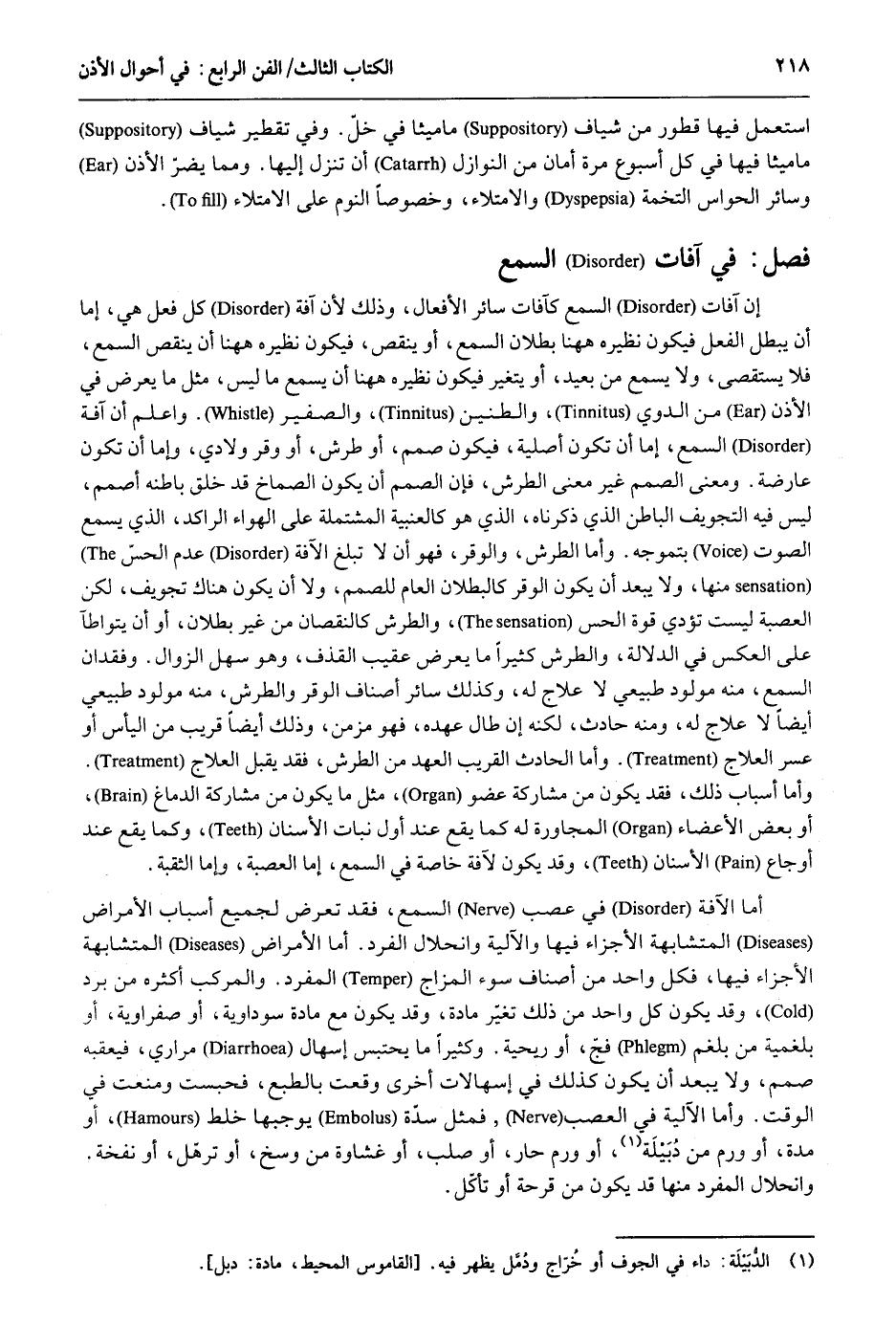 اسْتعْمل فِيهَا قطور من شياف ماميثا فِي خلّ. وَفِي تقطير شياف ماميثا فِيهَا فِي لَك أُسْبُوع مرّة أَمَان من النَّوَازِل أَن تنزل إِلَيْهَا. وَمِمَّا يضرّ الْأذن وَسَائِر الْحَواس التُّخمَة والامتلاء وخصوصاً النّوم على الامتلاء. فصل فِي آفَات السّمع إِن آفَات السّمع كآفات سَائِر الْأَفْعَال وَذَلِكَ لِأَن آفَة كل فعل هُوَ إِمَّا أَن يبطل الْفِعْل فَيكون نَظِيره هَهُنَا بطلَان السّمع أَو ينقص فَيكون نَظِيره هَهُنَا أَن ينقص السّمع فَلَا يستقصى وَلَا يسمع من بعيد أَو يتَغَيَّر فَيكون نَظِيره هَهُنَا أَن يسمع مَا لَيْسَ مثل مَا يعرض فِي الْأذن من الدوي والطنين والصفير. وَاعْلَم أَن آفَة السّمع إِمَّا أَن تكون أَصْلِيَّة فَيكون صمم أَو طرش أَو وقر ولادي وَإِمَّا أَن تكون عارضة. وَمعنى الصمم غير معنى الطرش فَإِن الصمم أَن يكون الصماخ قد خلق بَاطِنه أصمّ لَيْسَ فِيهِ التجويف الْبَاطِن الَّذِي ذَكرْنَاهُ الَّذِي هُوَ كالعنبة الْمُشْتَملَة على الْهَوَاء الراكد الَّذِي يسمع الصَّوْت بتموجه. وَأما الطرش والوقر فَهُوَ أَن لَا تبلغ الآفة عدم الحسّ مِنْهَا وَلَا يبعد أَن يكون الوقر كالبطلان الْعَام للصمم وَلَا أَن يكون هُنَاكَ تجويف لَكِن الْعصبَة لَيست تُؤدِّي قُوَّة الْحس والطرش كالنقصان من غير بطلَان أَو أنُ يتواطآ على الْعَكْس فِي الدّلَالَة والطرش كثيرا مَا يعرض عقيب الْقَذْف وَهُوَ سهل الزَّوَال. وفقدان السّمع مِنْهُ مَوْلُود طبيعي علاج لَهُ وَكَذَلِكَ سَائِر أَصْنَاف الوقر والطرش مِنْهُ مَوْلُود طبيعي أَيْضا لَا علاج لَهُ وَمِنْه حَادث لكنه إِن طَال عَهده فَهُوَ مزمن وَذَلِكَ أَيْضا قريب من الْيَأْس أَو عسر العلاج. وَأما الْحَادِث الْقَرِيب الْعَهْد من الطرش فقِد يقبل العلاج. وَأما أَسبَاب ذَلِك فقد يكون من مُشَاركَة عُضْو مثل مَا يكون من مُشَاركَة الدِّمَاغ أَو بعض الْأَعْضَاء الْمُجَاورَة لَهُ كَمَا يَقع لخد أول نَبَات الْأَسْنَان وكما يَقع عِنْد أوجاع الْأَسْنَان وَقد يكون لآفة خَاصَّة فِي السّمع إِمَّا الْعصبَة وَإِمَّا الثقبة. أما الآفة فِي عصب السّمع فقد تعرض لجَمِيع أَسبَاب الْأَمْرَاض المتشابهة الْإِجْزَاء فِيهَا والآلية وانحلال الْفَرد. أما الْأَمْرَاض المتشابهة الْأَجْزَاء فِيهَا فَكل وَاحِد من أَصْنَاف سوء المزاج الْمُفْرد. والمركب أَكْثَره من برد وَقد يكون كل وَاحِد من ذَلِك تغير مَادَّة وَقد يكون مَعَ مَادَّة سوداوية أَو صفراوية أَو بلغمية من بلغم فج أَو ريحية. وَكَثِيرًا مَا يحتبس إسهال مراري فيعقبه صمم وَلَا يبعد أَن يكون كَذَلِك فِي إسهالات أُخْرَى وَقعت بالطبع فحبست ومنعت فِي الْوَقْت. وَأما الآلية فِي العصب فَمثل سدة يُوجِبهَا خلط أَو مُدَّة أَو ورم دبيلة أَو ورم حَار أَو صلب أَو غشاوة من وسخ أَو ترهل أَو نفخة. وانحلال الْمُفْرد مِنْهَا قد يكون من قرحَة أَو تَأْكُل.