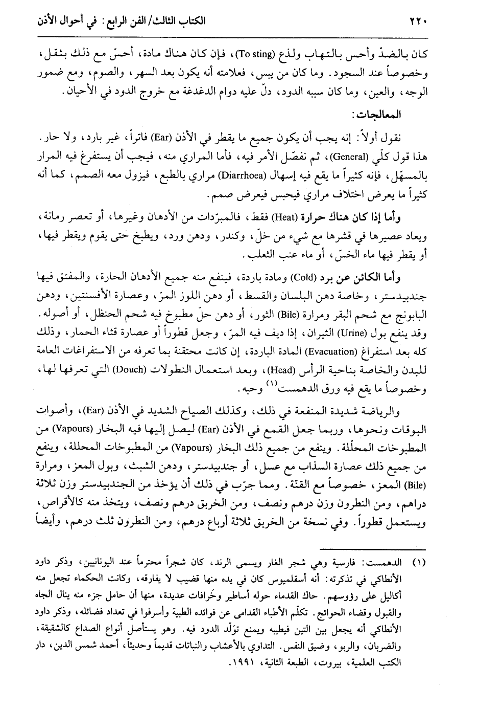 كَانَ بالضد وأحس بالتهاب ولذع فَلَا كَانَ هُنَاكَ مَادَّة أحس مَعَ ذَلِك بثقل وخصوصاً عِنْد السُّجُود. وَمَا كَانَ من يبس فعلامته أَنه يكون بعد السهر وَالصَّوْم وَمَعَ ضمور الْوَجْه وَالْعين وَمَا كَانَ سَببه الدُّود دلّ عَلَيْهِ دوَام الدغدغة مَعَ خُرُوج الدُّود فِي الأحيان. المعالجات: نقُول أَولا: أَنه يجب أَن يكون جَمِيع مَا يقطر فِي الْأذن فاتراً غير بَارِد وَلَا حَار. هَذَا قَول كلي ثمَّ نفضل الْأَمر فِيهِ فَأَما المراري مِنْهُ فَيجب أَن يستفرغ فِيهِ المرار بالمسهل فَإِنَّهُ كثيرا مَا يَقع فِيهِ إسهال مراري بالطبع فيزول مَعَه الصمم كَمَا أَنه كثيرا مَا يعرض اخْتِلَاف مراري فَيحْبس فَيعرض صمم. وَأما إِذا كَانَ هُنَاكَ حرارة فَقَط فالمبردات من الأدهان وَغَيرهَا أَو تعصر رمانة ويعاد عصيرها فِي قشرها مَعَ شَيْء من خل وكندر ودهن ورد ويطبخ حَتَّى يقوم ويقطر فِيهَا أَو يقطر فِيهَا مَاء الخس أَو مَاء عِنَب الثَّعْلَب. وَأما الْكَائِن عَن برد ومادة بَارِدَة فينفع مِنْهُ جَمِيع الأدهان الحارة والمفتق فِيهَا جندبيدستر وخاصة ثمن البلسان والقسط أَو دهن اللوز المر وعصارة الأفسنتين ودهن البابونج مَعَ شَحم الْبَقر ومرارة الثور أَو دهن حل مطبوخ فِيهِ شَحم الحنظل أَو أُصُوله. وَقد ينقع بَوْل الثيران إِذا ديف فِيهِ المر وَجعل قطوراً أَو عصارة قثاء الْحمار وَذَلِكَ كُله بعد استفراغ الْمَادَّة الْبَارِدَة إِن كَانَت محتقنة بِمَا تعرفه من الاستفراغات الْعَامَّة للبدن والخاصة بِنَاحِيَة الرَّأْس وَبعد اسْتِعْمَال النطولات الَّتِي تعرفها لَهَا وخصوصاً مَا يَقع فِيهِ ورق الدهمست وحبه. والرياضة شَدِيدَة الْمَنْفَعَة فِي ذَلِك وَكَذَلِكَ الصياح الشَّديد فِي الْأذن وأصوات البوقات وَنَحْوهَا وَرُبمَا جعل القمع فِي الْأذن ليصل إِلَيْهَا فِيهِ البخار من المطبوخات المحللة. وينفع من جَمِيع ذَلِك البخار من المطبوخات المحللة وينفع من جَمِيع ذَلِك عصارة الساب مَعَ عسل أَو جندبيدستر ودهن الشبث وَبَوْل الْمعز ومرارة الْمعز خُصُوصا مَعَ القنة. وَمِمَّا جرب فِي ذَلِك أَن يُؤْخَذ من الجندبيدستر وزن ثَلَاثَة دَرَاهِم وَمن النطرون وزن دِرْهَم وَنصف وَمن الخربق دِرْهَم وَنصف ويتخذ مِنْهُ كالأقراص وَيسْتَعْمل قطوراً. وَفِي نُسْخَة من الخربق ثَلَاثَة أَربَاع دِرْهَم وَمن النطرون ثلث دِرْهَم وَأَيْضًا