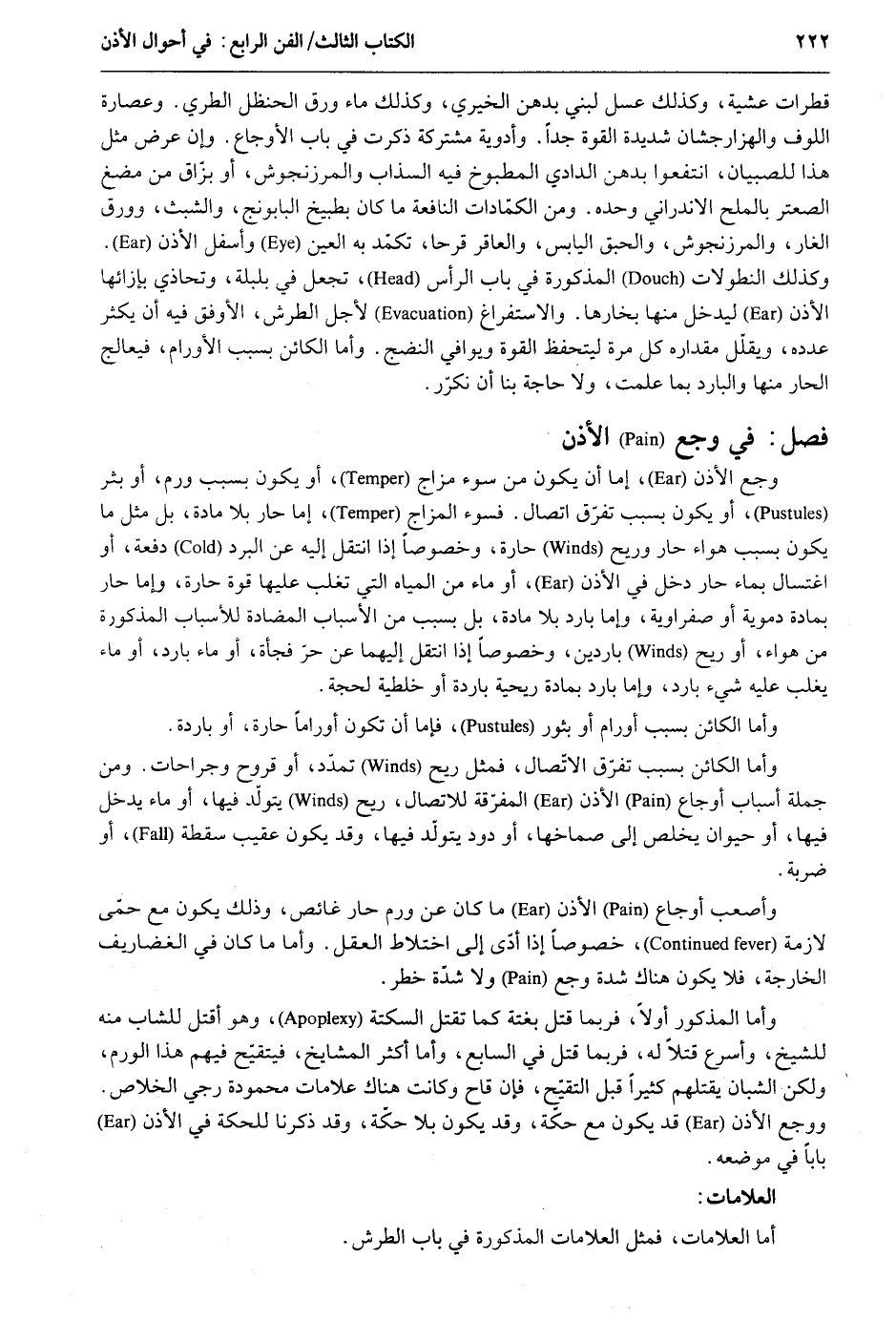 قطرات عَشِيَّة وَكَذَلِكَ عسل لبني بدهن الخيري وَكَذَلِكَ مَاء ورق الحنظل الطري. وعصارة اللوف والهزارجشان شَدِيدَة الْقُوَّة جدا. وأدوية مُشْتَركَة ذكرت فِي بَاب الأوجاع. وَإِن عرض مثل هَذَا للصبيان انتفعوا بدهن الدادي الْمَطْبُوخ فِيهِ السذاب والمرزنجوش أَو بزاق من مضغ السعتر بالملح الانحرافي وَحده. وَمن الكمادات النافعة مَا كَانَ بطبيخ البابونج والشبث وورق الْغَار والمرزنجوش والحبق الْيَابِس والعاقر قرحا تكمد بِهِ الْعين وأسفل الْأذن. وَكَذَلِكَ النطولات الْمَذْكُورَة فِي بَاب الرَّأْس تجْعَل فِي بلبلة وتحاذي بإذائها الْأذن ليدْخل مِنْهَا بخارها. والاستفراغ لأجل الطرش الأوفق فِيهِ أَن يكثر عدده ويقلّل مِقْدَاره كل مرّة ليتحفظ الْقُوَّة ويوافي النضج. وَأما الْكَائِن بِسَبَب الأورام فيعالج الْحَار مِنْهَا والبارد بِمَا علمت وَلَا حَاجَة بِنَا أَن نكرّر. فصل فِي وجع الْأذن وجع الْأذن إِمَّا أَن يكون من سوء مزاج أَو يكون بِسَبَب ورم أَو بثر أَو يكون بِسَبَب تفرق اتِّصَال. فسوء المزاج إِمَّا حَار بِلَا مَادَّة بل مثل مَا يكون بِسَبَب هَوَاء حَار وريح حارة وخصوصاً إِذا انْتقل إِلَيْهِ عَن الْبرد دفْعَة أَو اغتسال بِمَاء حَار دخل فِي الْأذن أَو مَاء من الْمِيَاه الَّتِي تغلب عَلَيْهَا قُوَّة حارة وَإِمَّا حَار بمادة دموية أَو صفراوية وَإِمَّا بَارِد بِلَا مَادَّة بل بِسَبَب من الْأَسْبَاب المضادة للأسباب الْمَذْكُورَة من هَوَاء أَو ريح باردين وخصوصاً إِذا انْتقل إِلَيْهِمَا عَن حرّ فَجْأَة أَو مَاء بَارِد أَو مَاء يغلب عَلَيْهِ شَيْء بَارِد وَإِمَّا بَارِد بمادة ريحية بَارِدَة أَو خلطية لحجة. وَأما الْكَائِن بِسَبَب أورام أَو بثور فإمَّا أَن تكون أوراماً حارة أَو بَارِدَة. وَأما الْكَائِن بِسَبَب تفرّق الِاتِّصَال فَمثل ريح تمدد أَو قُرُوح وجراحات. وَمن جملَة أَسبَاب أوجاع الْأذن المفرقة للاتصال ريح يتولّد فِيهَا أَو مَاء يدْخل فِيهَا أَو حَيَوَان يخلص إِلَى صماخها أَو دود يتَوَلَّد فِيهَا وَقد يكون عقيب سقطة أَو ضَرْبَة. وأصعب أوجاع الْأذن مَا كَانَ عَن ورم حَار غائص وَذَلِكَ يكون مَعَ حمى لَازِمَة خُصُوصا إِذا أدّى إِلَى اخْتِلَاط الْعقل. وَأما مَا كَانَ فِي الغضاريف الْخَارِجَة فَلَا يكون هُنَاكَ شدَّة وجع وَلَا شدّة خطر. وَأما الْمَذْكُور أَولا فَرُبمَا قتل بَغْتَة كَمَا تقتل السكتة وَهُوَ أقتل للشاب مِنْهُ للشَّيْخ وأسرع قتلا لَهُ فَرُبمَا قتل فِي السَّابِع وَأما أَكثر الْمَشَايِخ فيتقيح فيهم هَذَا الورم وَلَكِن الشبَّان يقتلهُمْ كثيرا قبل التقيح فَإِن قاح وَكَانَت هُنَاكَ عَلَامَات محمودة رُجي الْخَلَاص. ووجع الْأذن قد يكون مَعَ حكة وَقد يكون بِلَا حكة وَقد ذكرنَا للحكة فِي الْأذن بَابا فِي مَوْضِعه. العلامات: أما العلامات فَمثل العلامات الْمَذْكُورَة فِي بَاب الطرش.