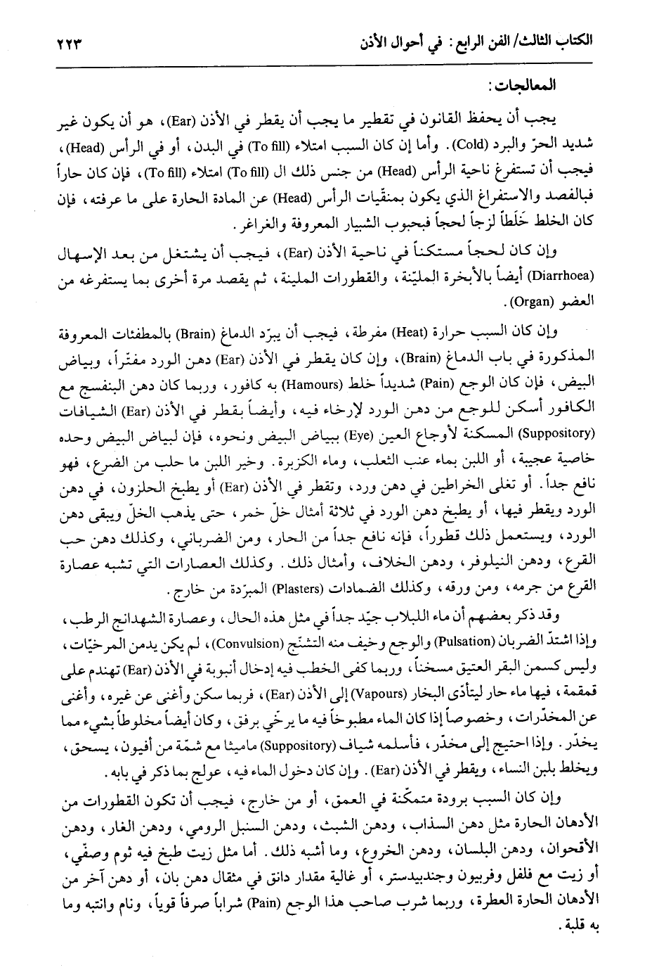 المعالجات: يجب أَن يحفظ القانون فِي تقطير مَا يجب أَن يقطر فِي الْأذن هُوَ أَن يكون غير شَدِيد الحرّ وَالْبرد. وَأما إِن كَانَ السَّبَب امتلاء فِي الْبدن أَو فِي الرَّأْس فَيجب أَن تستفرغ نَاحيَة الرَّأْس من جنس ذَلِك الامتلاء فَإِن كَانَ حاراً فالفصد والإستفراغ الَّذِي يكون بمنقّيات الرَّأْس عَن الْمَادَّة الحارة على مَا عَرفته فَإِن كَانَ الْخَلْط خَلَطاً لزجاً لحجاً فبحبوب الشبيار الْمَعْرُوفَة والغراغر. وَإِن كَانَ لحجاً مستكناً فِي نَاحيَة الْأذن فَيجب أَن يشْتَغل من بعد الإسهال أَيْضا بالأبخرة المليّنة والقطورات الملينة ثمَّ يقْصد مرّة أُخْرَى بِمَا يستفرغه من الْعُضْو. وَإِن كَانَ السَّبَب حرارة مفرطة فَيجب أَن يبرّد الدِّمَاغ بالمطفئات الْمَعْرُوفَة الْمَذْكُورَة فِي بَاب الدِّمَاغ وَإِن كَانَ يقطر فِي الْأذن دهن الْورْد مفتراً وَبَيَاض الْبيض فَإِن كَانَ الوجع شَدِيدا خلط بِهِ كافور وَرُبمَا كَانَ دهن البنفسج مَعَ الكافور أسكن للوجع من دهن الْورْد لإرخاء فِيهِ وَأَيْضًا بقطر فِي الْأذن الشيافات المسكنة لأوجاع الْعين ببياض الْبيض وَنَحْوه فَإِن لبياض الْبيض وَحده خاصية عَجِيبَة أَو اللَّبن بِمَاء عِنَب الثَّعْلَب وَمَاء الكزبرة. وَخير اللَّبن مَا حلب من الضَّرع فَهُوَ نَافِع جدا. أَو يغلى الخراطين فِي دهن ورد ويقطر فِي الْأذن أَو يطْبخ الحلزون فِي دهن الْورْد ويَقطر فِيهَا أَو يطْبخ دهن الْورْد فِي ثَلَاثَة أَمْثَال خلّ خمر حَتَّى يذهب الخلّ وَيبقى دهن الْورْد وَيسْتَعْمل ذَلِك قطوراً فَإِنَّهُ نَافِع جدا من الْحَار وَمن الضرباني وَكَذَلِكَ دهن حب القرع ودهن النيلوفر ودهن الْخلاف وأمثال ذَلِك. وَكَذَلِكَ العصارات الَّتِي تشبه عصارة القرع من جرمه وَمن ورقه وَكَذَلِكَ الضمادات المبرّدة من خَارج. وَقد ذكر بَعضهم أَن مَاء اللبلاب جيّد جدا فِي مثل هَذِه الْحَال وعصارة الشهدانج الرطب وَإِذا اشتدّ الضربان والوجع وَخيف مِنْهُ التشنج لم يكن يدمن المرخيّات وَلَيْسَ كسمن الْبَقر الْعَتِيق مسخناً وَرُبمَا كفى الْخطب فِيهِ إِدْخَال أنبوبة فِي الْأذن تهندم على قمقمة فِيهَا مَاء حَار ليتأدّى البخار إِلَى الْأذن فَرُبمَا سكن وأغنى عَن غَيره وأغنى عَن المخدرات وخصوصاً إِذا كَانَ المَاء مطبوخاً فِيهِ مَا يرخّي بِرِفْق وَكَانَ أَيْضا مخلوطاً بِشَيْء مِمَّا يخدر. وَإِذا احْتِيجَ إِلَى مخدر فأسلمه شياف ماميثا مَعَ شدَّة من أفيون يسحق ويخلط بِلَبن النِّسَاء ويقطر فِي الْأذن. وَإِن كَانَ دُخُول المَاء فِيهِ عولج بِمَا ذكر فِي بَابه. وَإِن كَانَ السَّبَب برودة متمكّنة فِي العمق أَو من خَارج فَيجب أَن تكون القطورات من الأدهان الحارة مثل دهن السذاب ودهن الشبث ودهن السنبل الرُّومِي ودهن الْغَار ودهن الأقحوان ودهن البلسان ودهن الخروع وَمَا أشبه ذَلِك. أما مثل زَيْت طبخ فِيهِ ثوم وصفّي أَو زَيْت مَعَ فلفل وفربيون وجندبيدستر أَو غَالِيَة مِقْدَار دانق فِي مِثْقَال دهن بَان أَو دهن آخر من الأدهان الحارة العطرة وَرُبمَا شرب صَاحب هَذَا الوجع شرابًا صرفا قَوِيا ونام وانتبه وَمَا بِهِ قلبة.