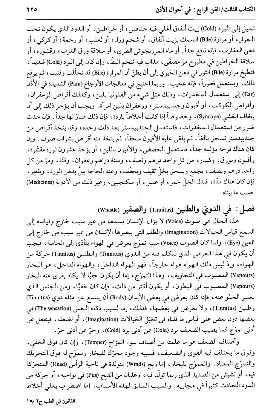 تميل إِلَى الْبرد زَيْت أنفاق أغلي فِيهِ خنافس أَو خراطين أَو الدُّود الَّذِي يكون تَحت الجرار أَو مرَارَة السّمك بِزَيْت أنفاق أَو شَحم ورل أَو ثَعْلَب أَو رخمة أَو كركي أَو دهن العقارب فَإِنَّهُ نَافِع جدا. أَو مَاء المرزنجوش الطري أَو سلاقة ورق الغرب وقشوره أَو سلاقة الخراطين فِي مطبوخ مرّ صفّى مذاب فِيهِ شَحم البط وَإِن كَانَ إِلَى الْبرد شَدِيدا فتطبخ مرَارَة الثور فِي دهن الخيري إِلَى أَن يظنّ أَن المرارة قد تحلّلت وفنيت ثمَّ يرفع ذَلِك وَيسْتَعْمل قطوراً فَإِنَّهُ عَجِيب. وَرُبمَا احْتِيجَ فِي معالجات الأوجاع الشَّدِيدَة فِي الْأذن إِلَى اسْتِعْمَال المخدرات وَذَلِكَ مثل شَيْء من الفلونيا بِلَبن وَكَذَلِكَ أَقْرَاص الزَّعْفَرَان وأقراص الْكَوْكَب أَو أفيون وجندبيدستر وزعفران بِلَبن امْرَأَة. وَيجب أَن يُؤَخر ذَلِك إِلَى أَن يخَاف الغشي وخصوصاً إِذا كَانَت أخلاطاً بَارِدَة فَإِن ذَلِك ضارّ لَهَا جدا. فَإِن حدث ضَرَر من اسْتِعْمَال المخدرات فَاسْتعْمل الجندبيدستر بعد ذَلِك وَحده وَقد يتَّخذ أَقْرَاص من جندبيدستر تسحق بَالغا ثمَّ يلقى عَلَيْهِ الأفيون سحقاً ثمَّ يتَّخذ مِنْهُ أَقْرَاص بشراب صرف. وَإِن كَانَ هُنَاكَ قرحَة مؤلمة جدا فَاسْتعْمل الحضض والأفيون بِاللَّبنِ أَو يُؤْخَذ عشرُون لوزة مقشّرة وأفيون وبورق وكندر من كل وَاحِد دِرْهَم وَنصف وَسِتَّة دَرَاهِم زعفران وقنة ومرّ من كل وَاحِدَة دِرْهَم وَنصف يجمع ويسحق بخل ثَقِيف ويجفف وَعند الْحَاجة يبلُّ بدهن الْورْد ويقطر فَإِن كَانَ هُنَاكَ مُدَّة فبدل الْخلّ خمر أَو عسل أَو سكنجبين وَغير ذَلِك من الْأَدْوِيَة حسب مَا بَيناهُ. فصل فِي الدوي والطنين والصفير هَذِه الْحَال هِيَ صَوت لَا يزَال الْإِنْسَان يسمعهُ من غير سَبَب خَارج وَقِيَاسه إِلَى السّمع قِيَاس الخيالات وَالظُّلم الَّتِي يبصرها الْإِنْسَان من غير سَبَب من خَارج إِلَى الْعين وَلما كَانَ الصَّوْت سَببه تموّج يعرض فِي الْهَوَاء يتأدّى إِلَى الحاسة فَيجب أَن يكون فِي هَذَا الْعرض الَّذِي نتكلم فِيهِ من الدوي والطنين حَرَكَة من الْهَوَاء وَإِذ لَيْسَ ذَلِك الْهَوَاء هَوَاء خَارِجا فَهُوَ الْهَوَاء الدَّاخِل والهواء الدَّاخِل هُوَ البخار المصبوب فِي التجاويف وَهَذَا التموّج إِمَّا أَن يكون خفِيا لَا يكَاد يعرى عَنهُ فَإِن كَانَ خفِيا وَمن الْجِنْس الَّذِي يعسر الْخُلُو عَنهُ فَإِذا كَانَ يعرض فِي بعض الْأَبدَان أَن يسمع عَن مثله دوِي وطنين وَلَا يعرض فِي بَعْضهَا فَذَلِك إِمَّا لسَبَب ذكاء الْحس فِي بَعْضهَا دون الْبَعْض على قِيَاس مَا قُلْنَاهُ فِي تخيل الخيالات أَو لضَعْفه فيفعل عَن أدنى تموج كَمَا يُصِيب الضَّعِيف برد أدنى برد وحر عَن أدنى حر. وأصناف الضعْف هُوَ مَا عَلمته من أَصْنَاف سوء المزاج وَإِن كَانَ فَوق الْخَفي وَفَوق مَا يخْتَلف فِيهِ الْقوي والضعيف فسببه وجود محرك للبخار ومموج لَهُ فَوق التحريك والتموج الْمُعْتَاد والمموج للبخار أما ريح مُتَوَلّدَة فِي نَاحيَة الرَّأْس المتحركة فِيهِ أَو نشيش من الصديد الَّذِي رُبمَا تولد فِيهِ وغليان من الْقَيْح فِي نواحيه أَو حَرَكَة من الدُّود الْحَادِث كثيرا فِي مجاريه. وَالسَّبَب السَّابِق لهَذِهِ الْأَسْبَاب إِمَّا اضْطِرَاب يغلي أخلاط